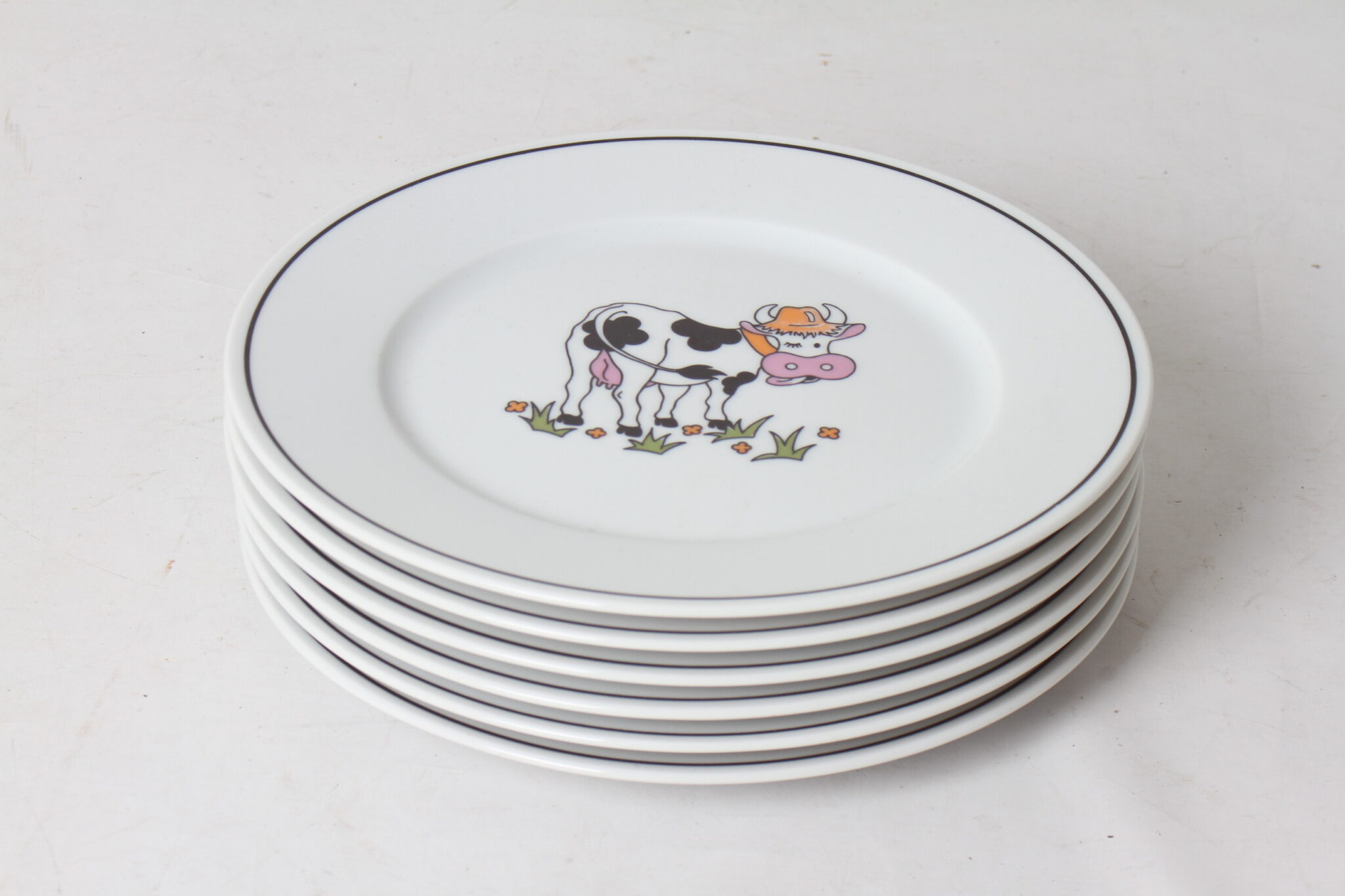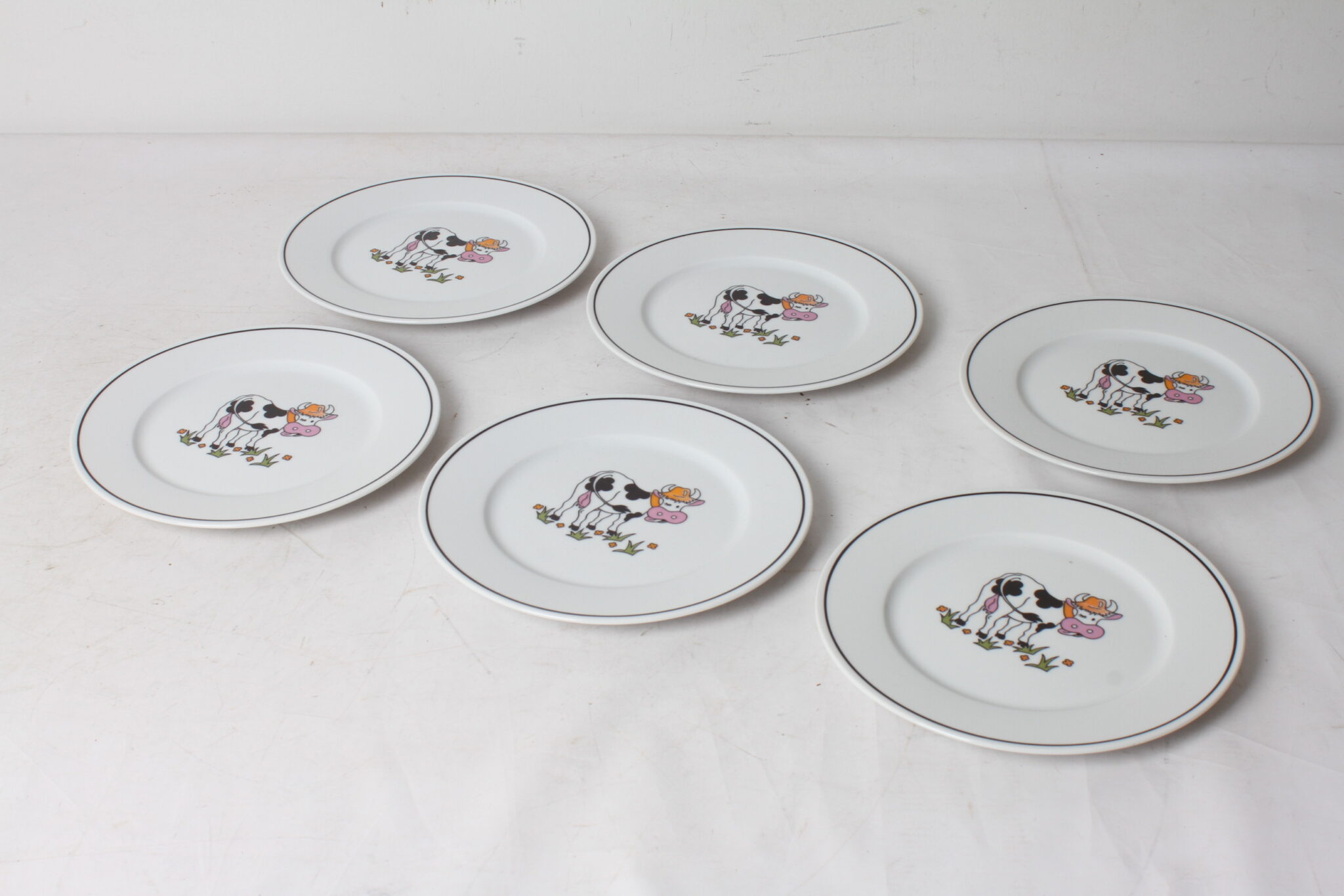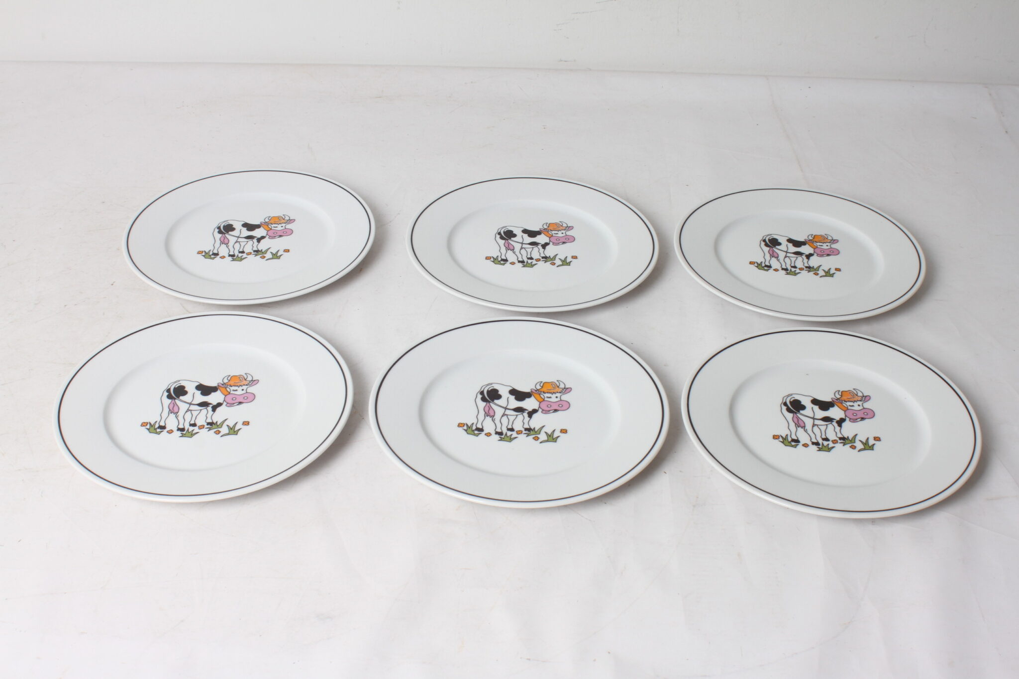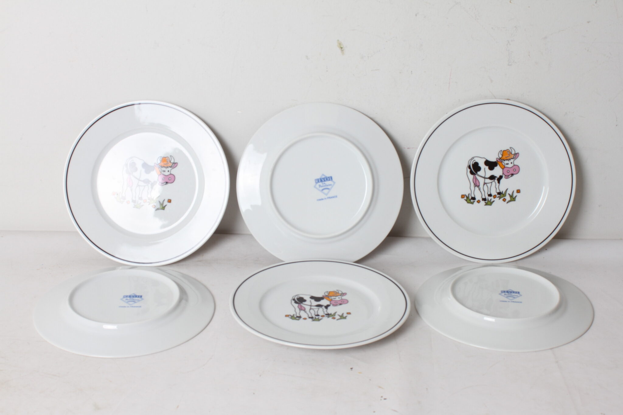 Série de 6 assiettes en porcelaine de la marque Revol, décor vache.