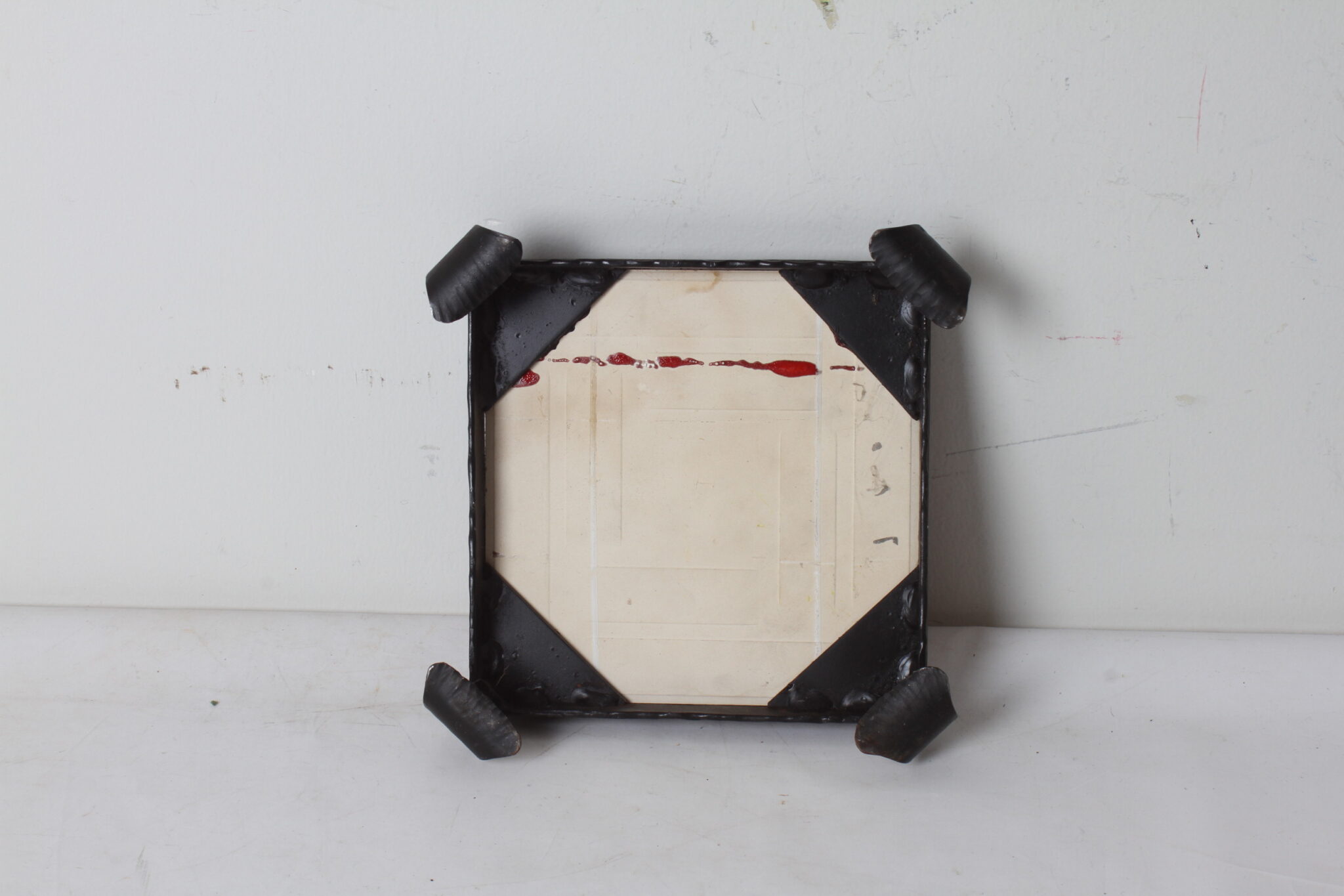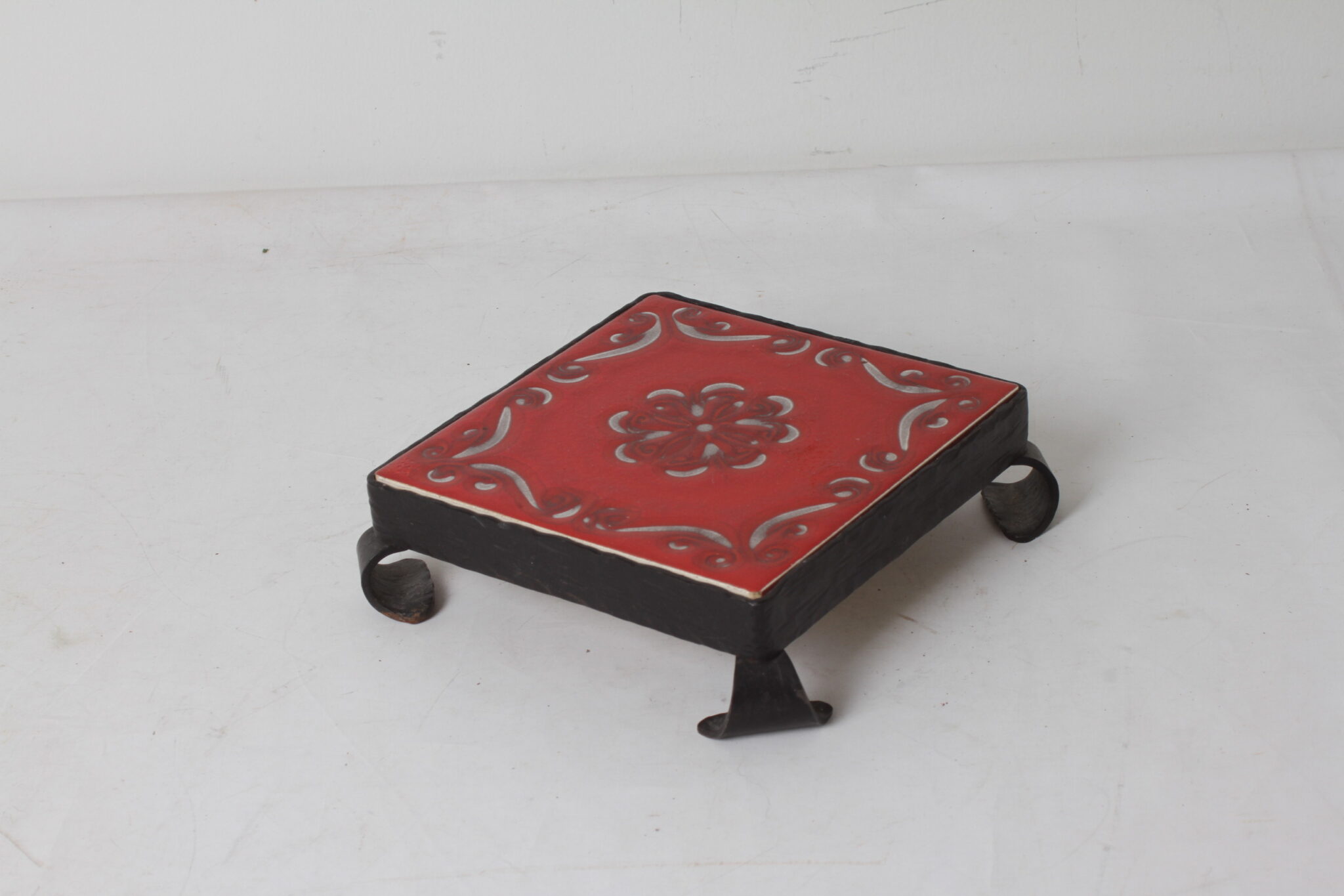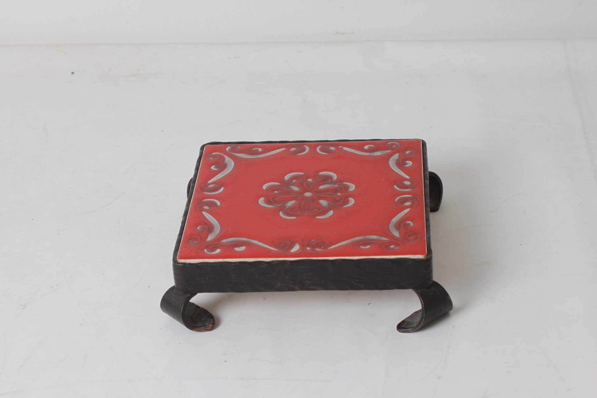 Ancien dessous de plat en céraique rouge sur un support en fer forgé noir.