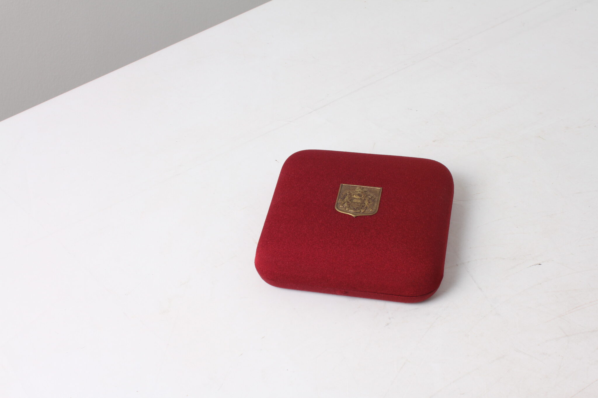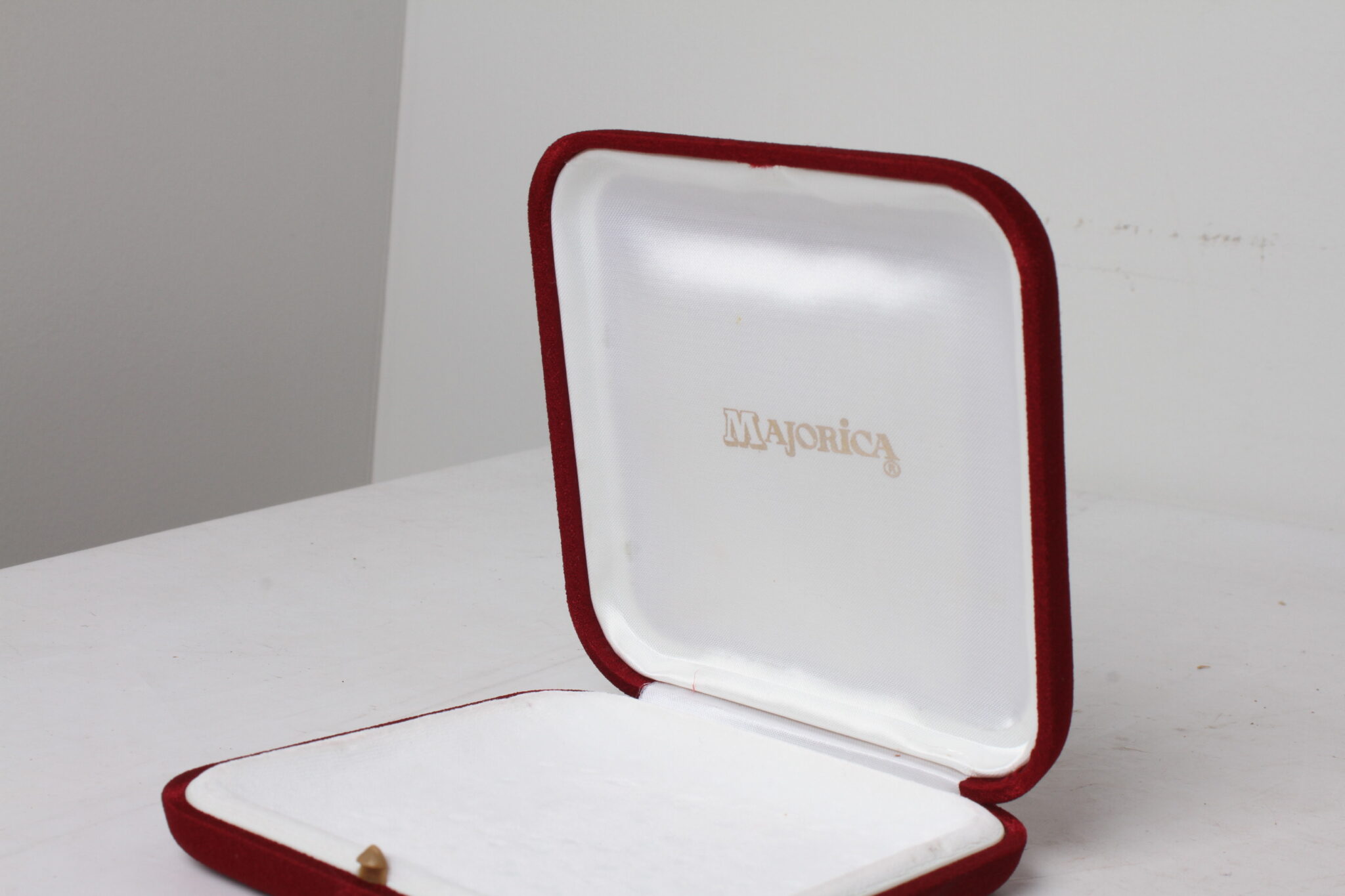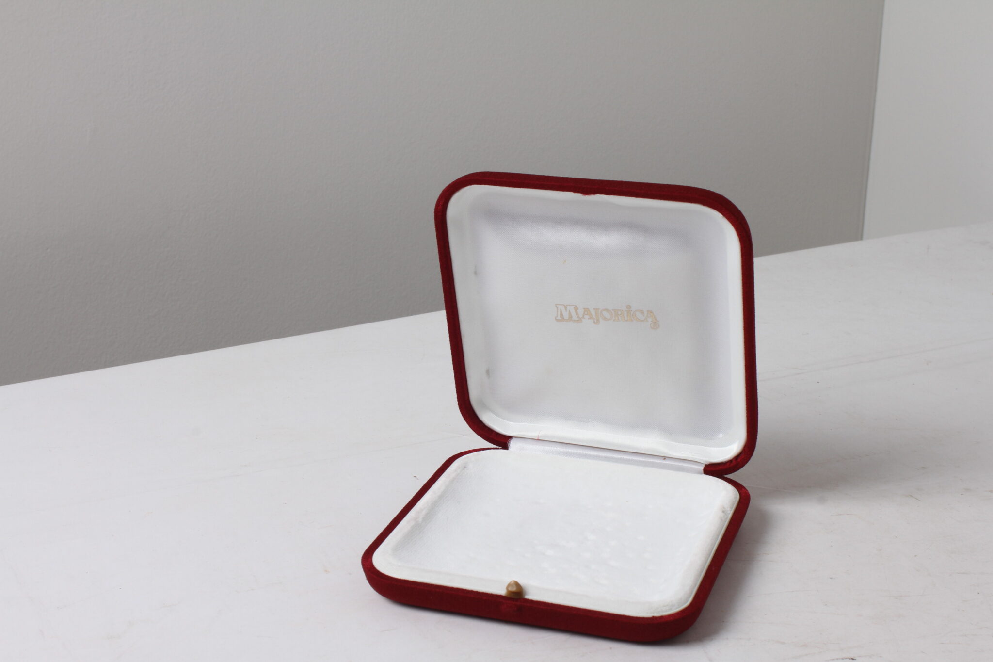 Ancienne boîte à bijoux Majorica en tissu rouge avec écusson en métal doré.
