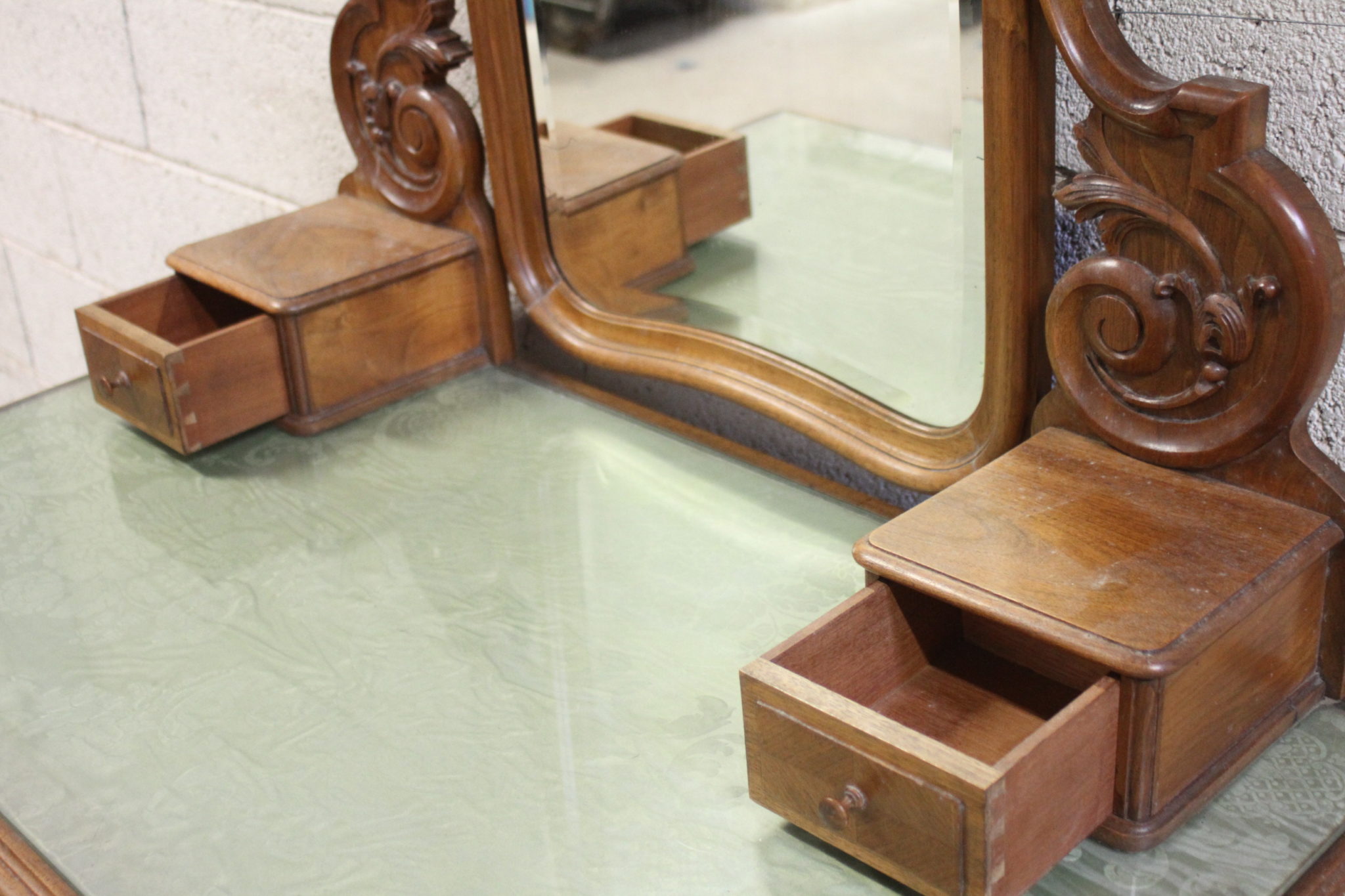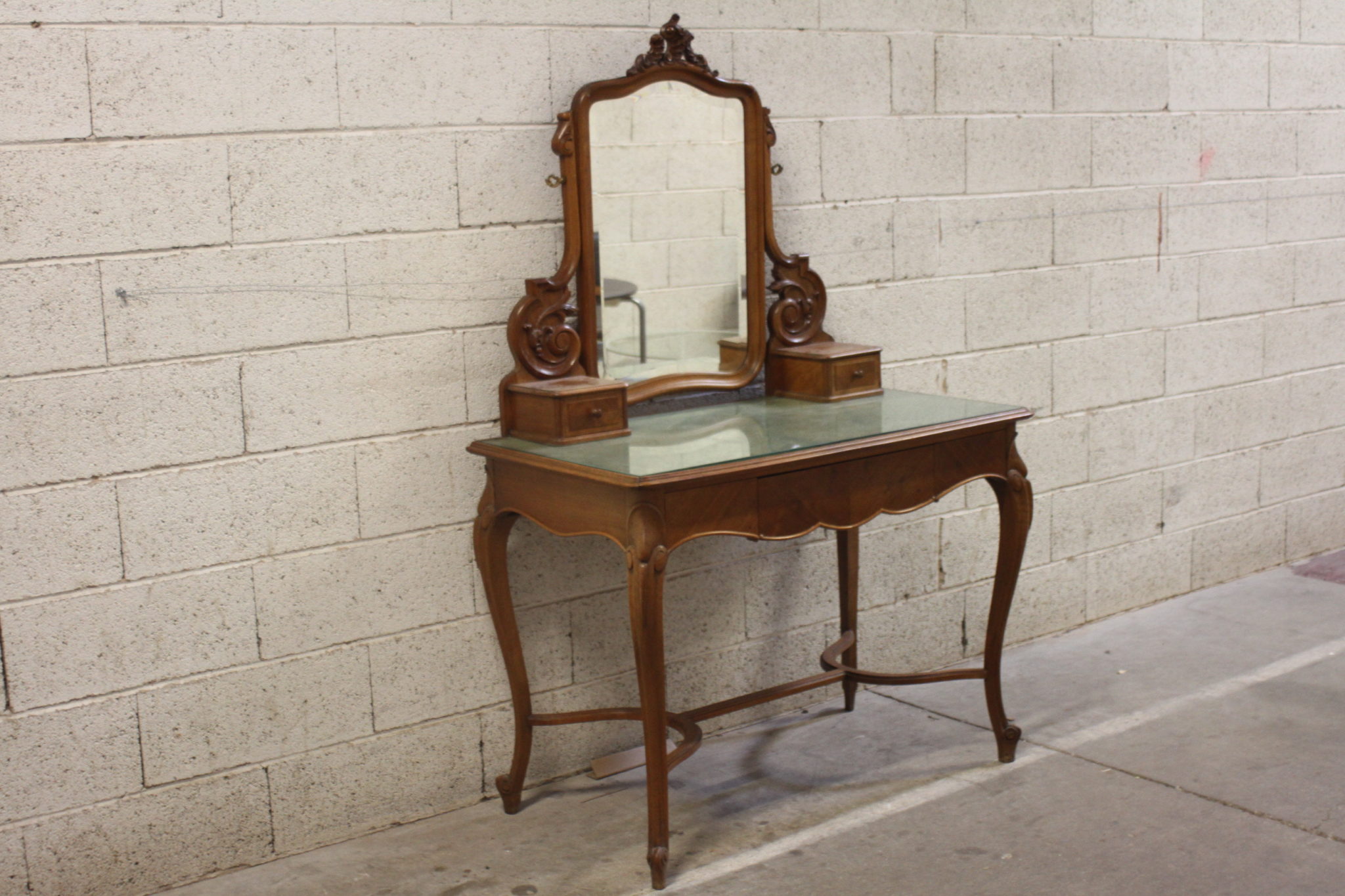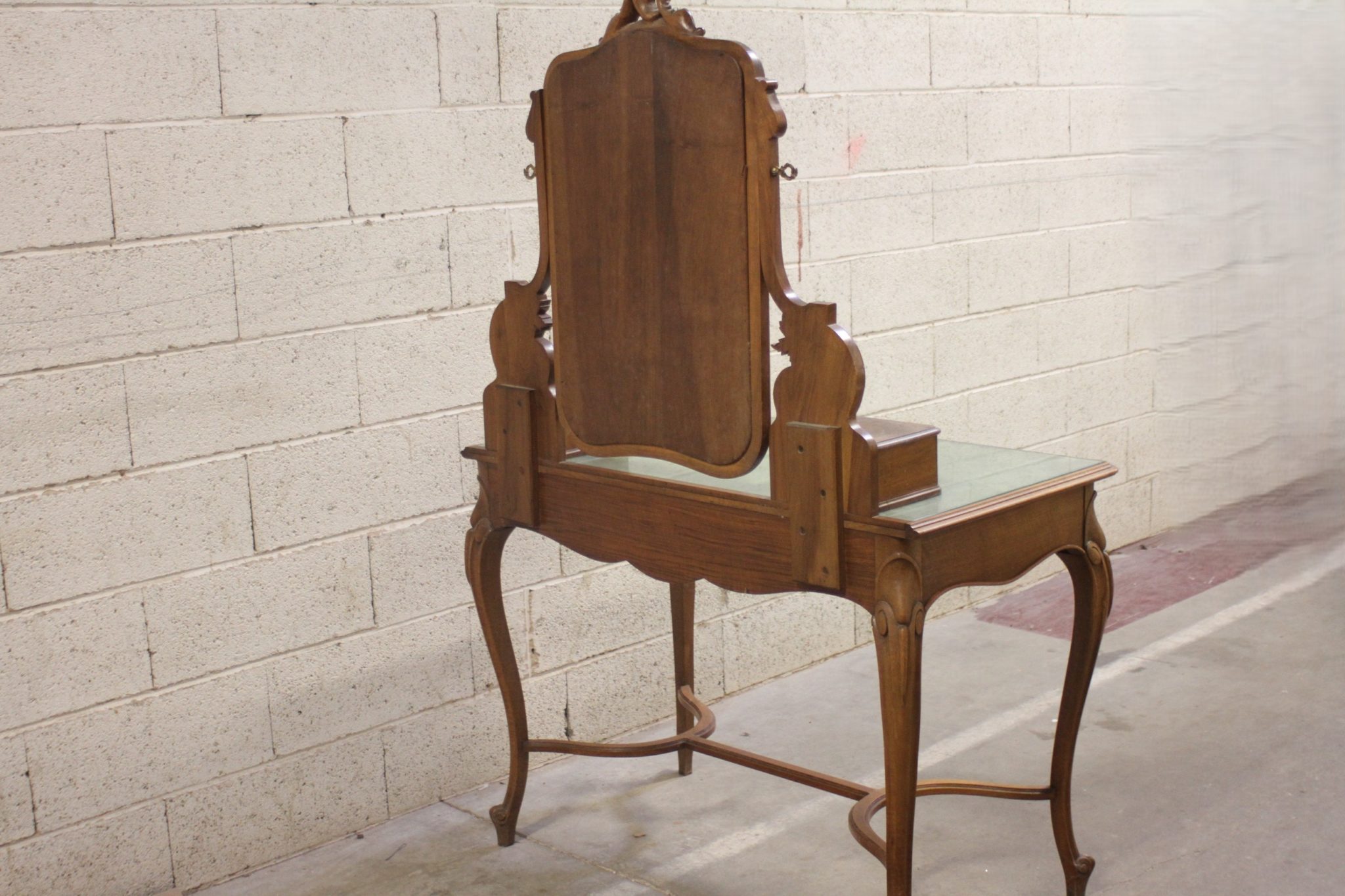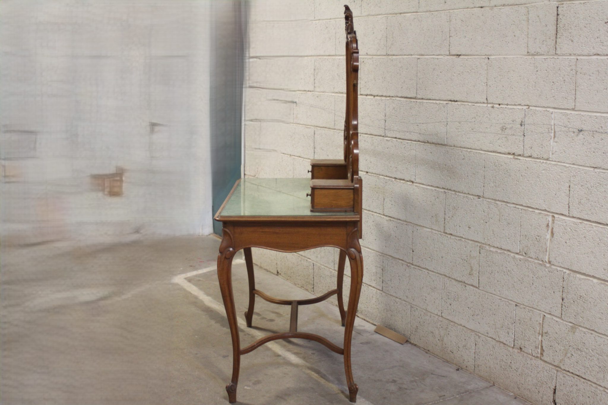Très belle ancienne coiffeuse en bois sculpté, sur pieds galbés avec miroir pivotant.