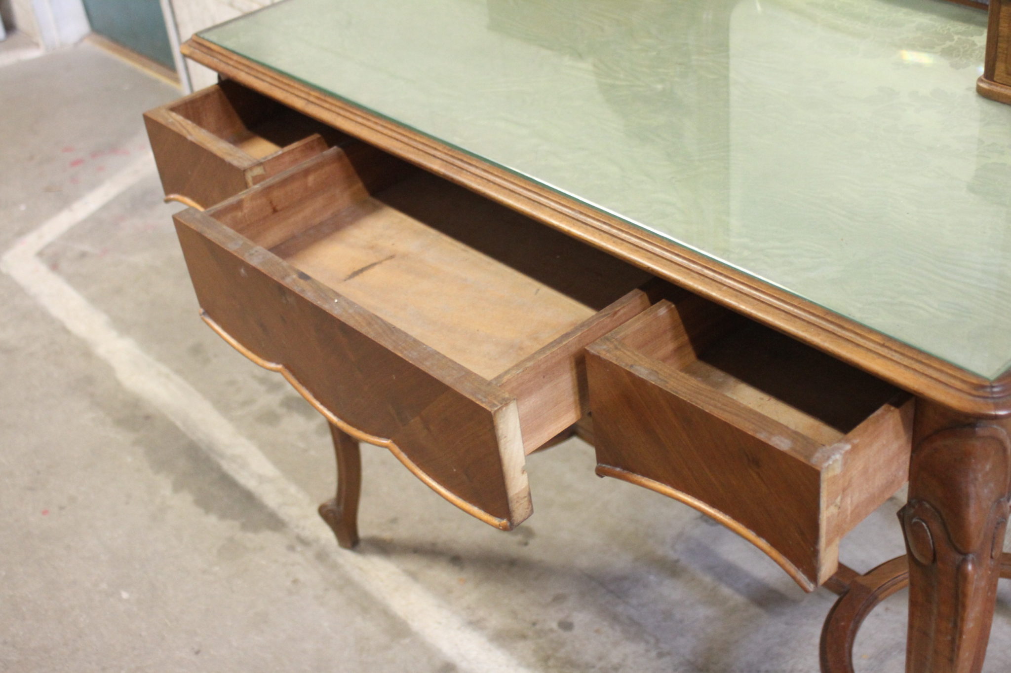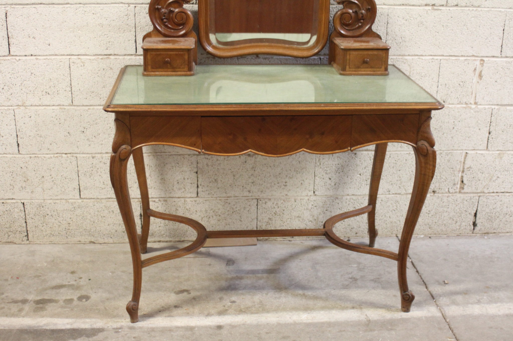 Coiffeuse avec plateau en verre et 5 tiroirs de rangement.