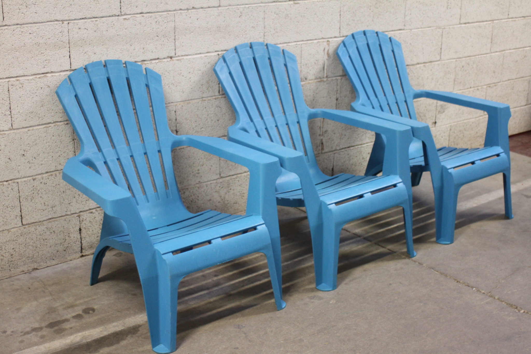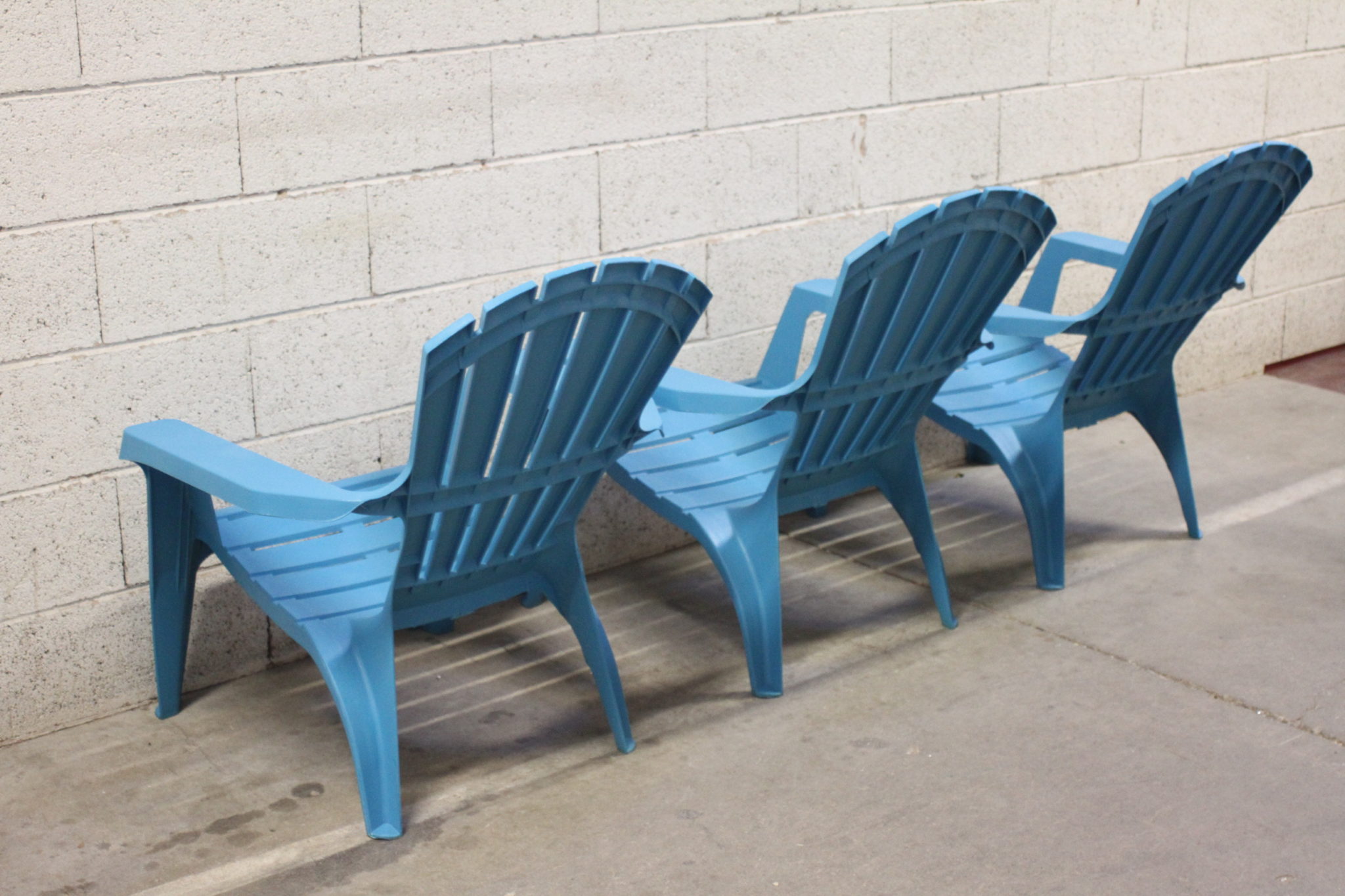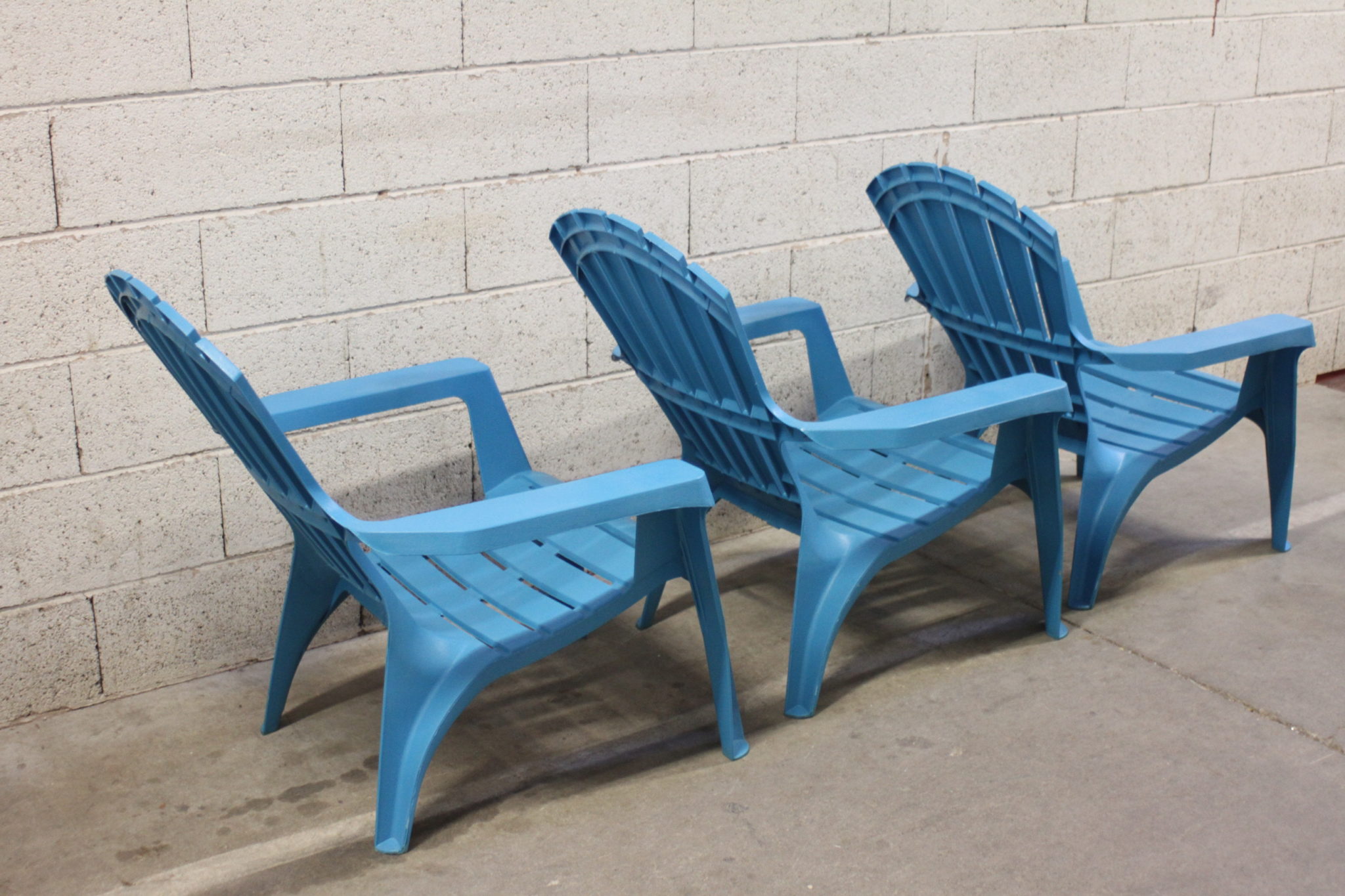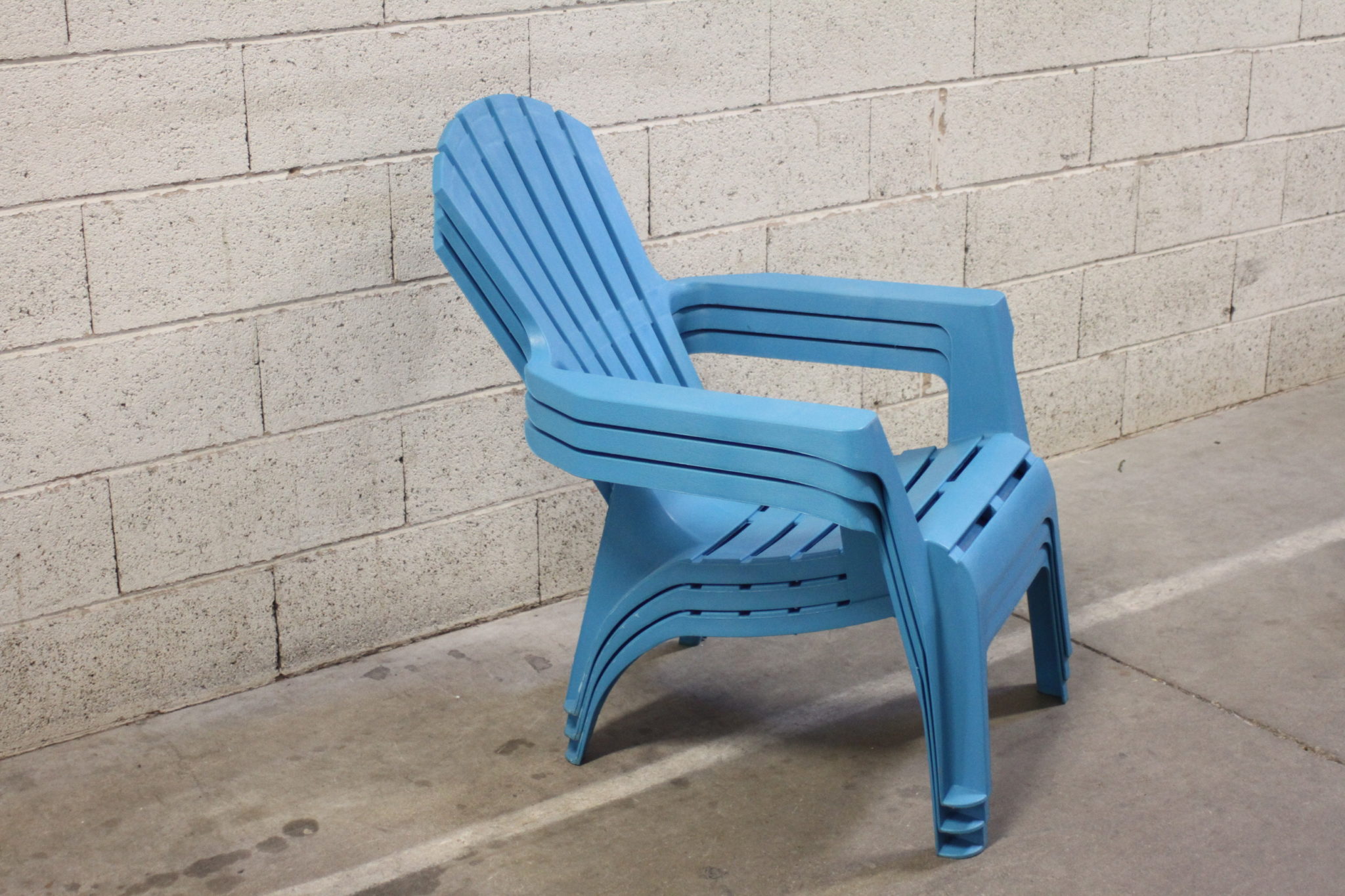 Bains de soleil empilables en plastique bleu.
