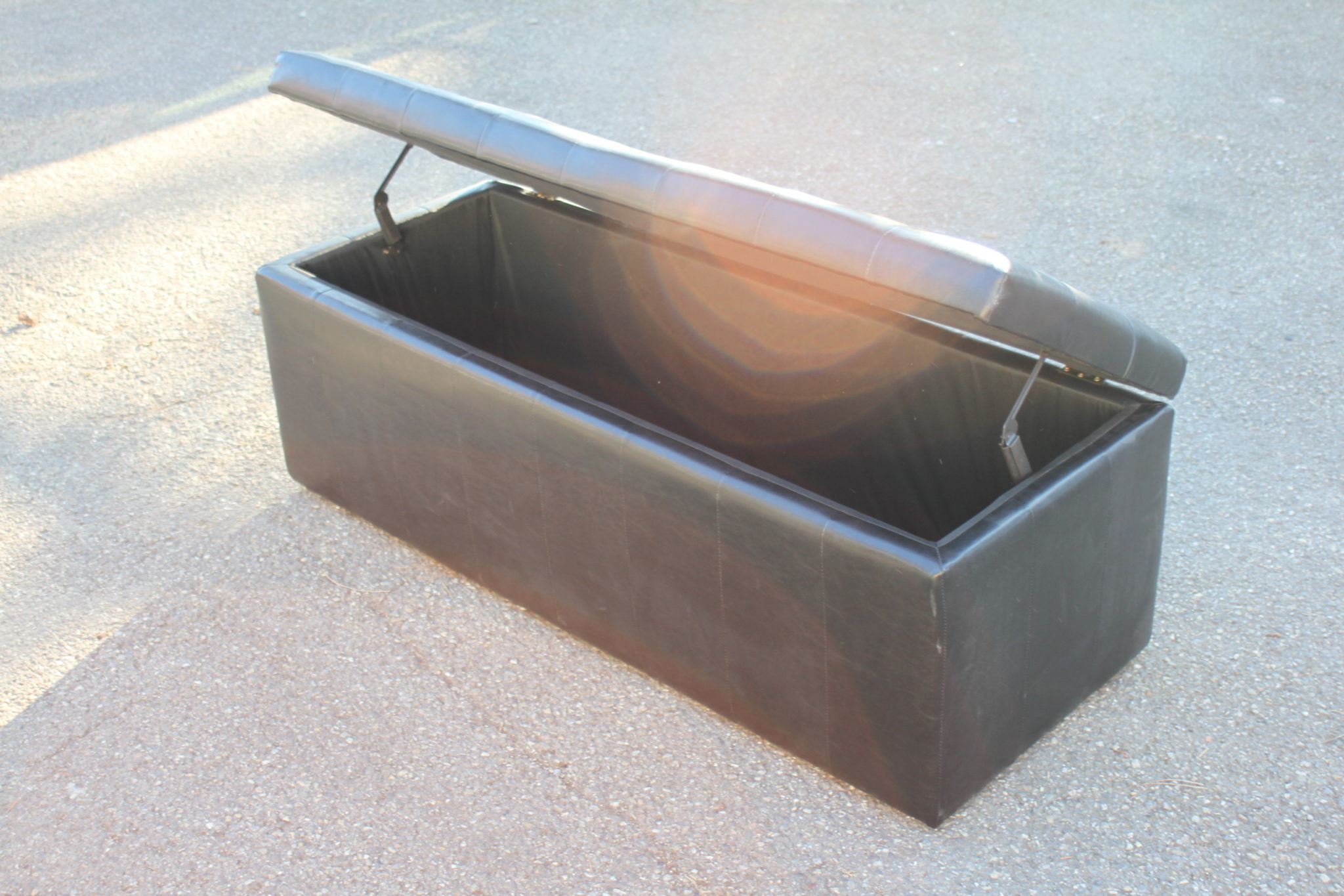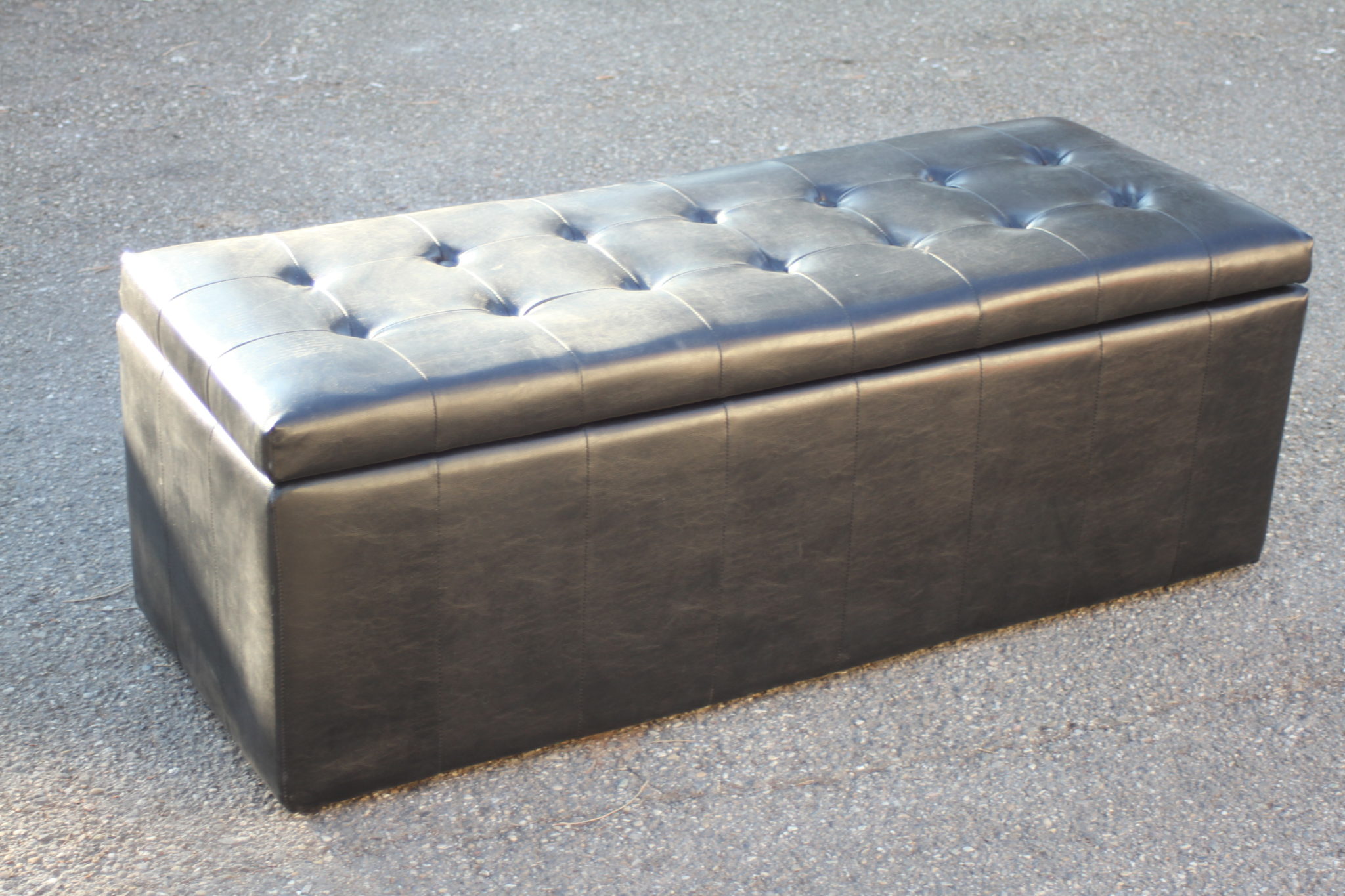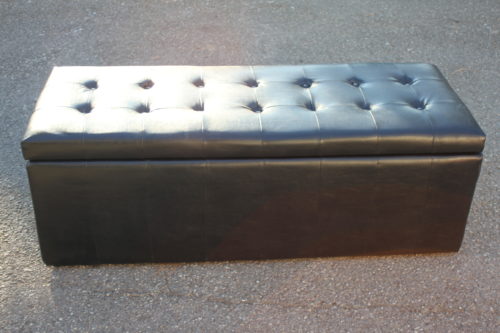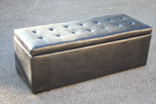 Banc coffre de rangement en skaï noir avec assise capitonnée.