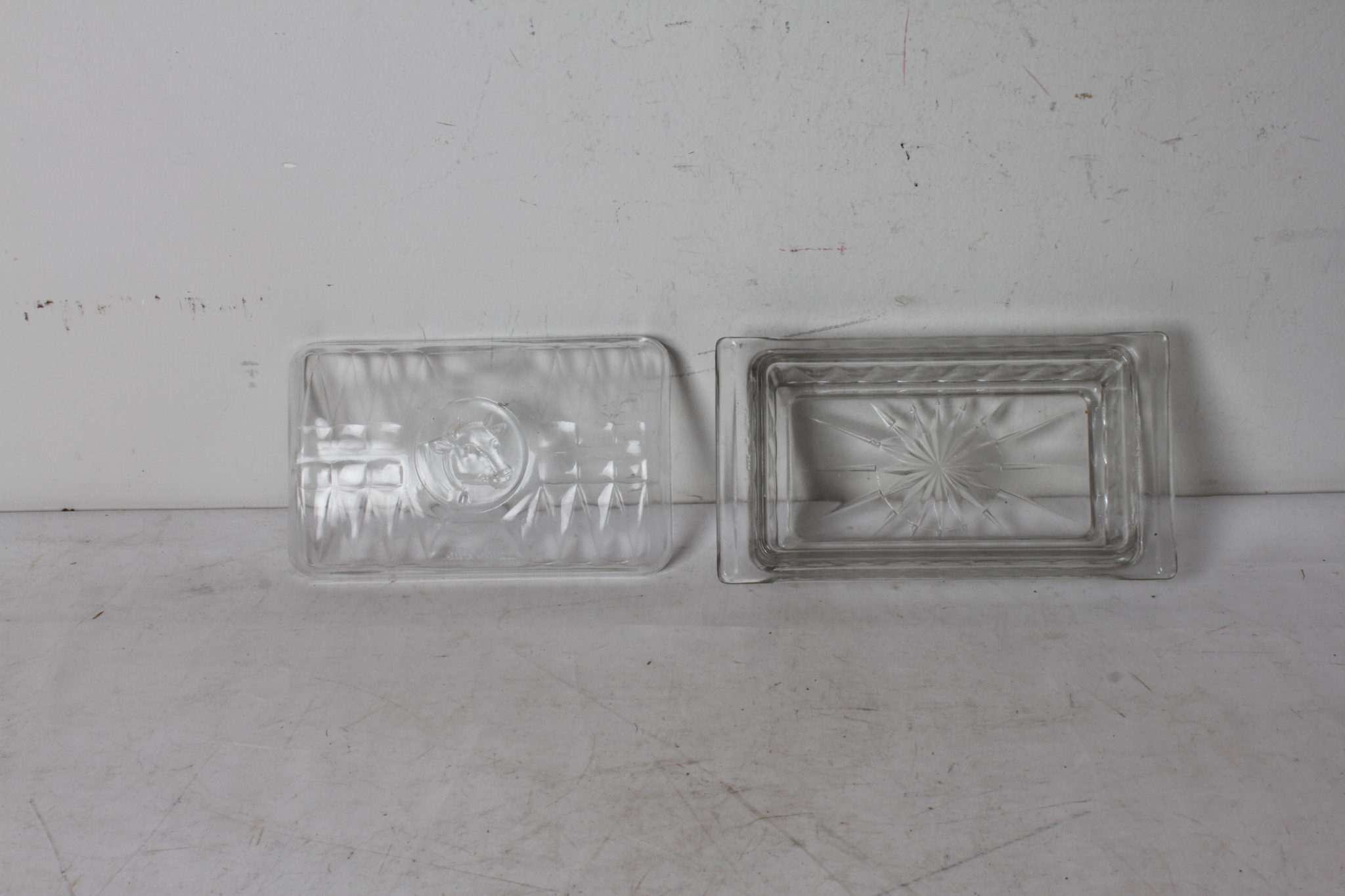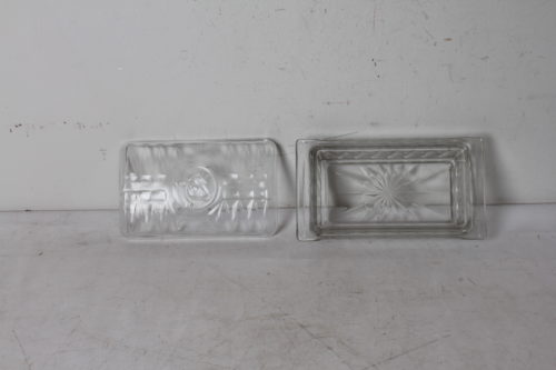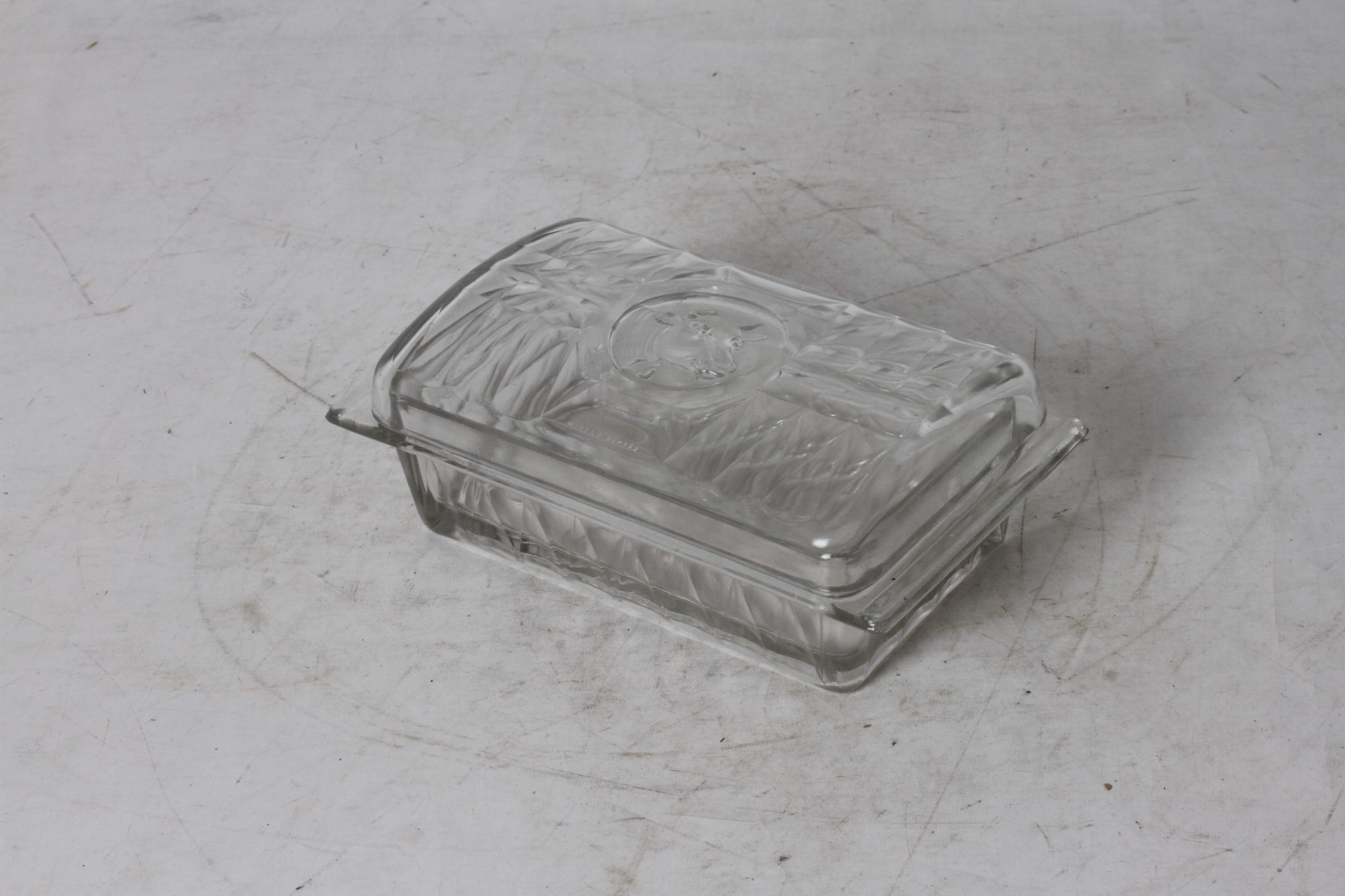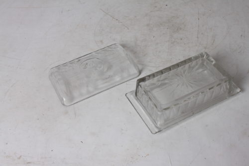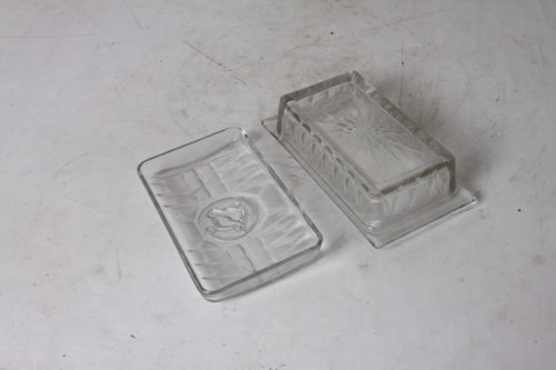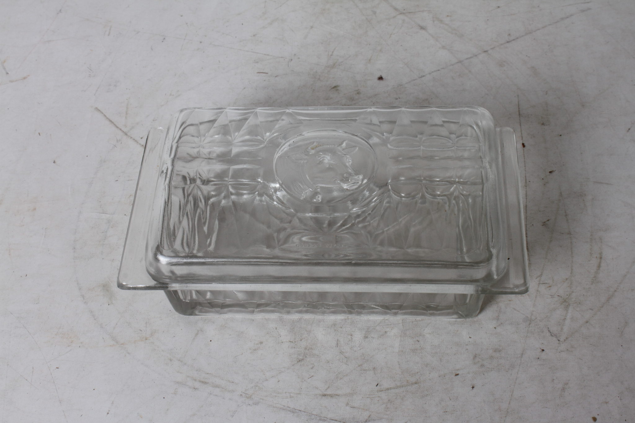 Beau beurrier en verre épais moulé avec en relief avec une tête de vache sur le couvercle.