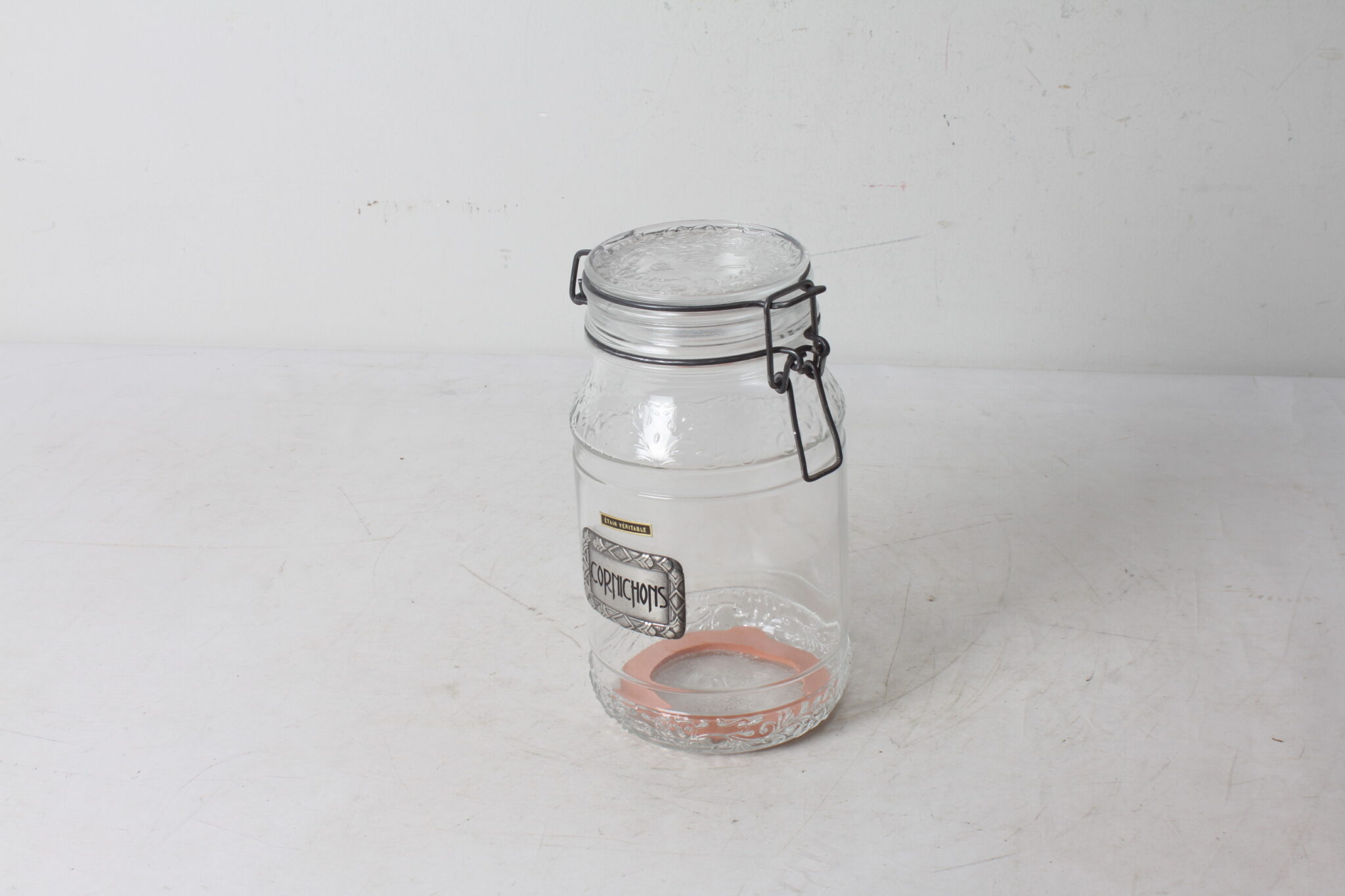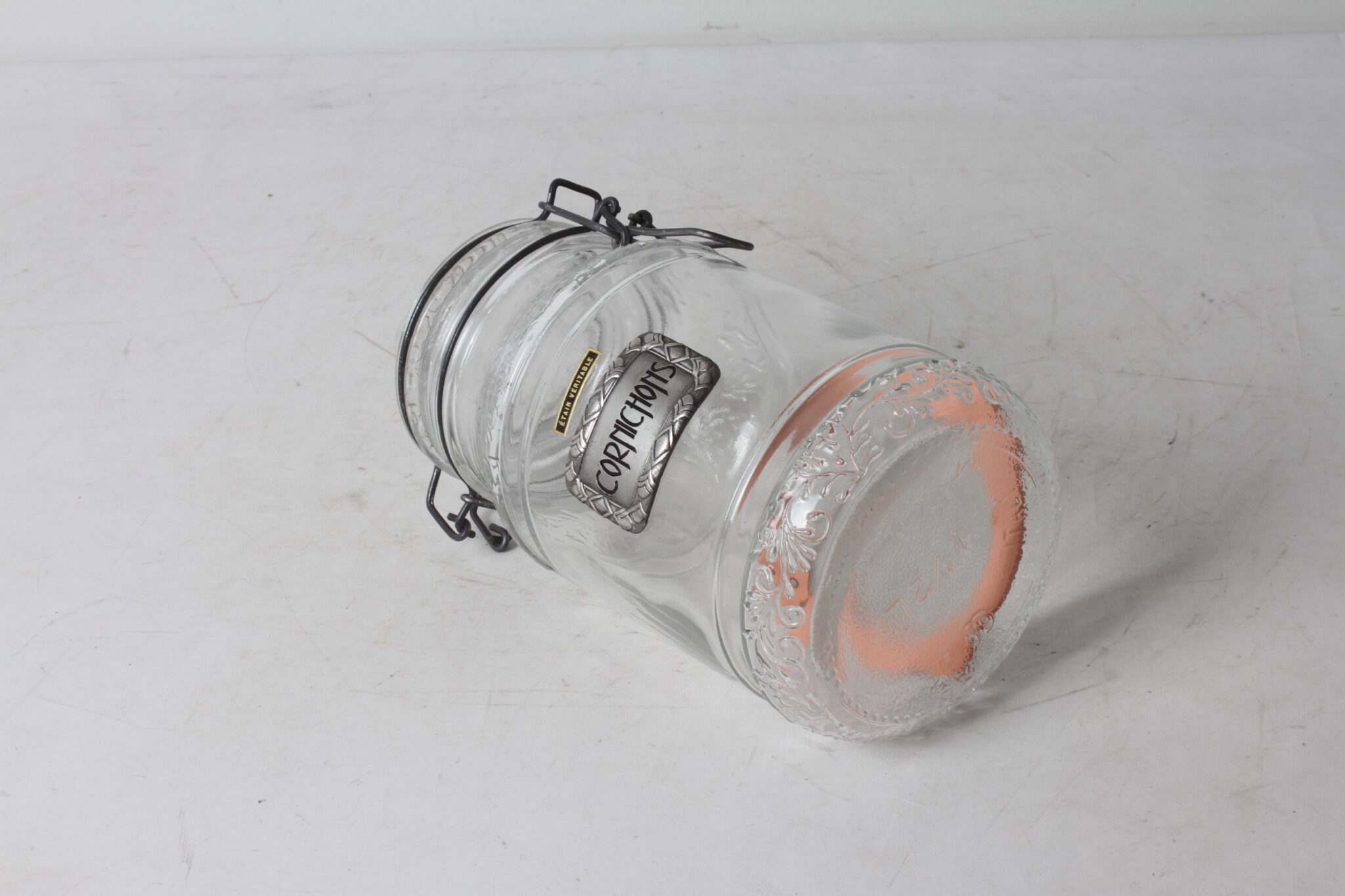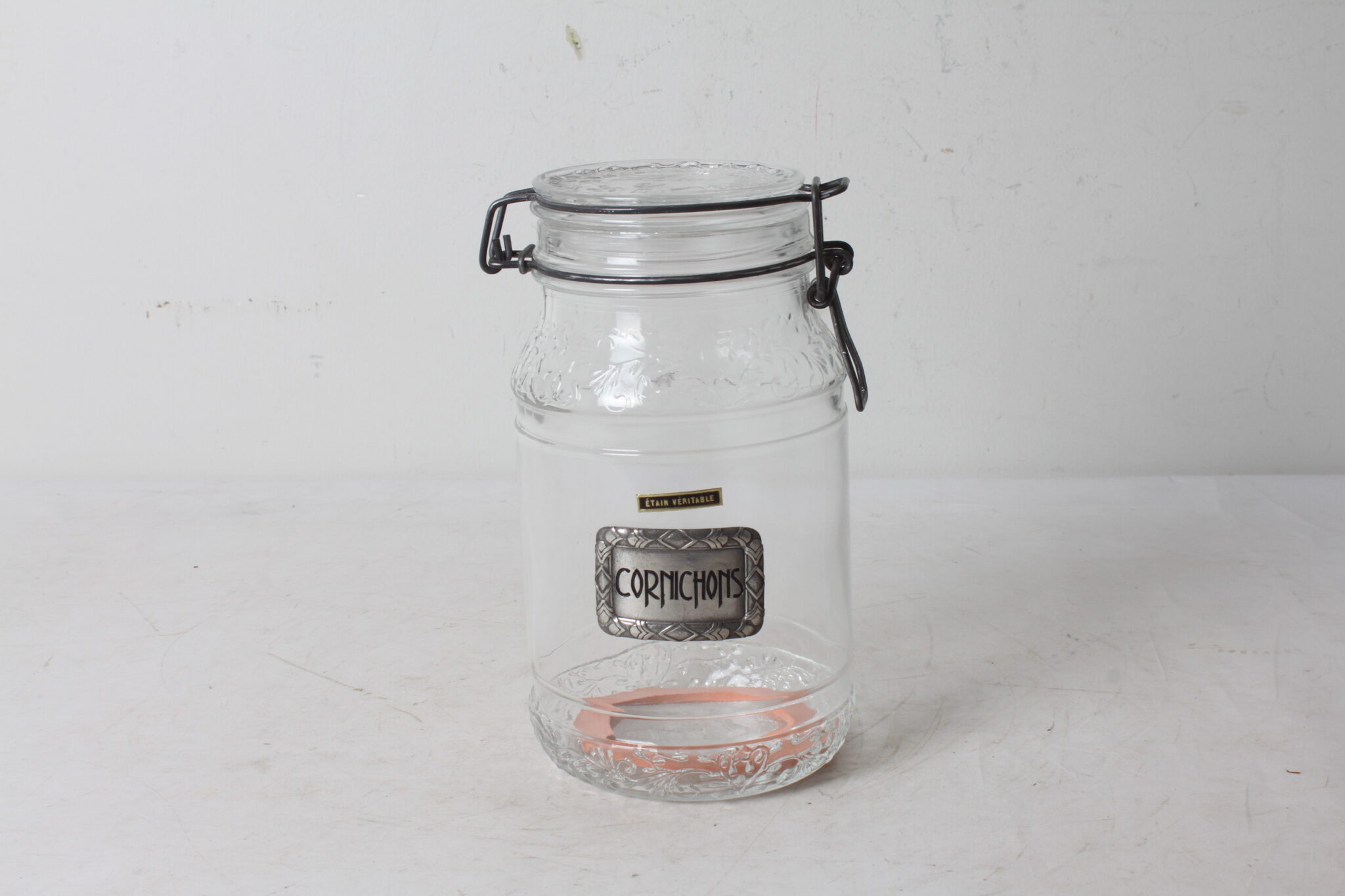 Bocal à cornichons en verre avec étiquette en étain « Cornichons ».