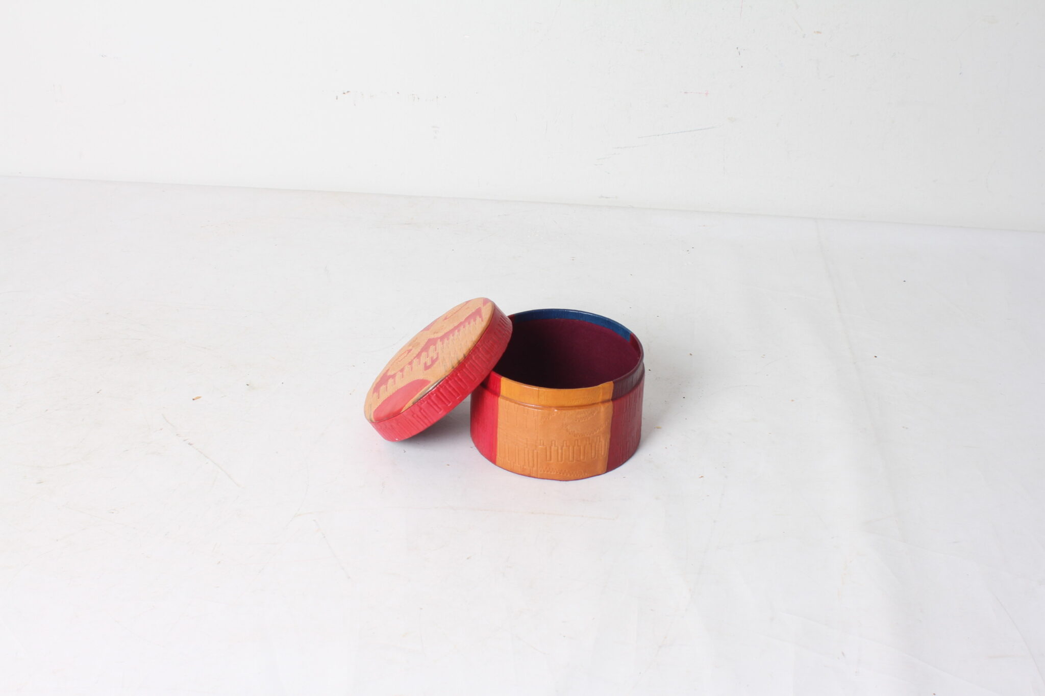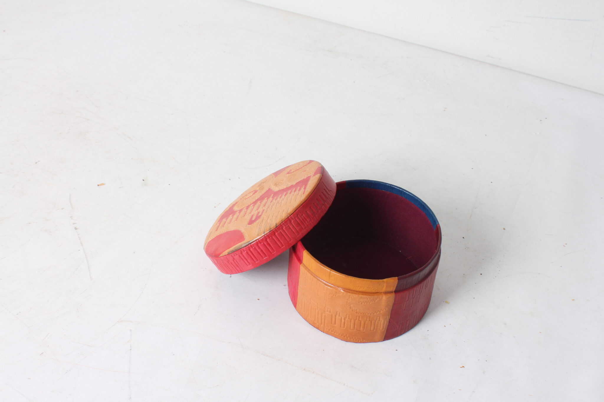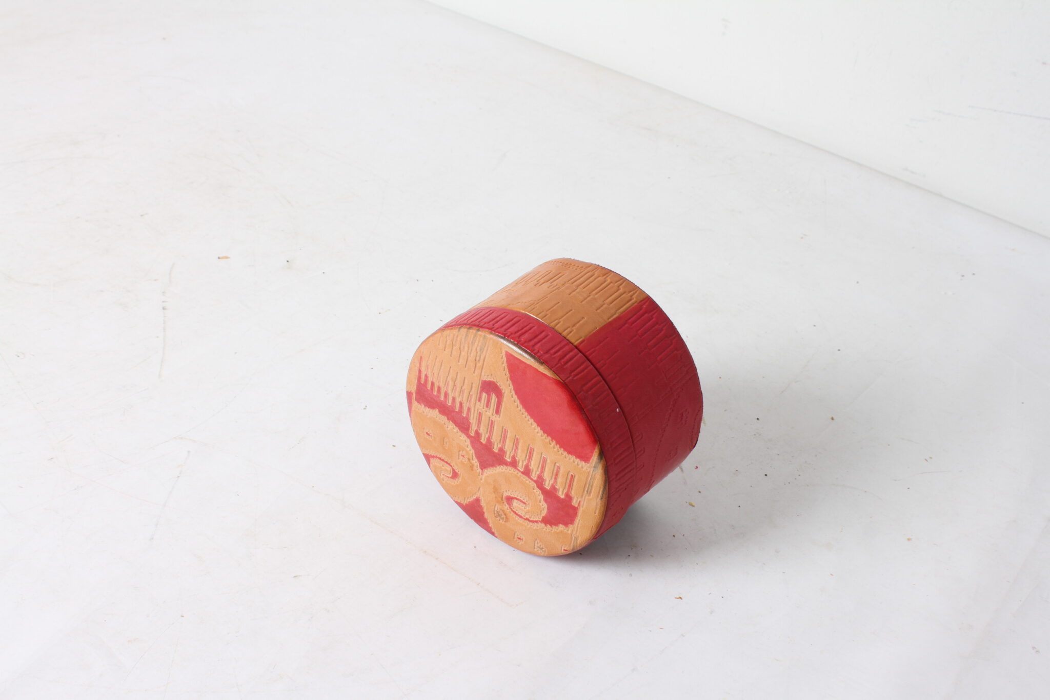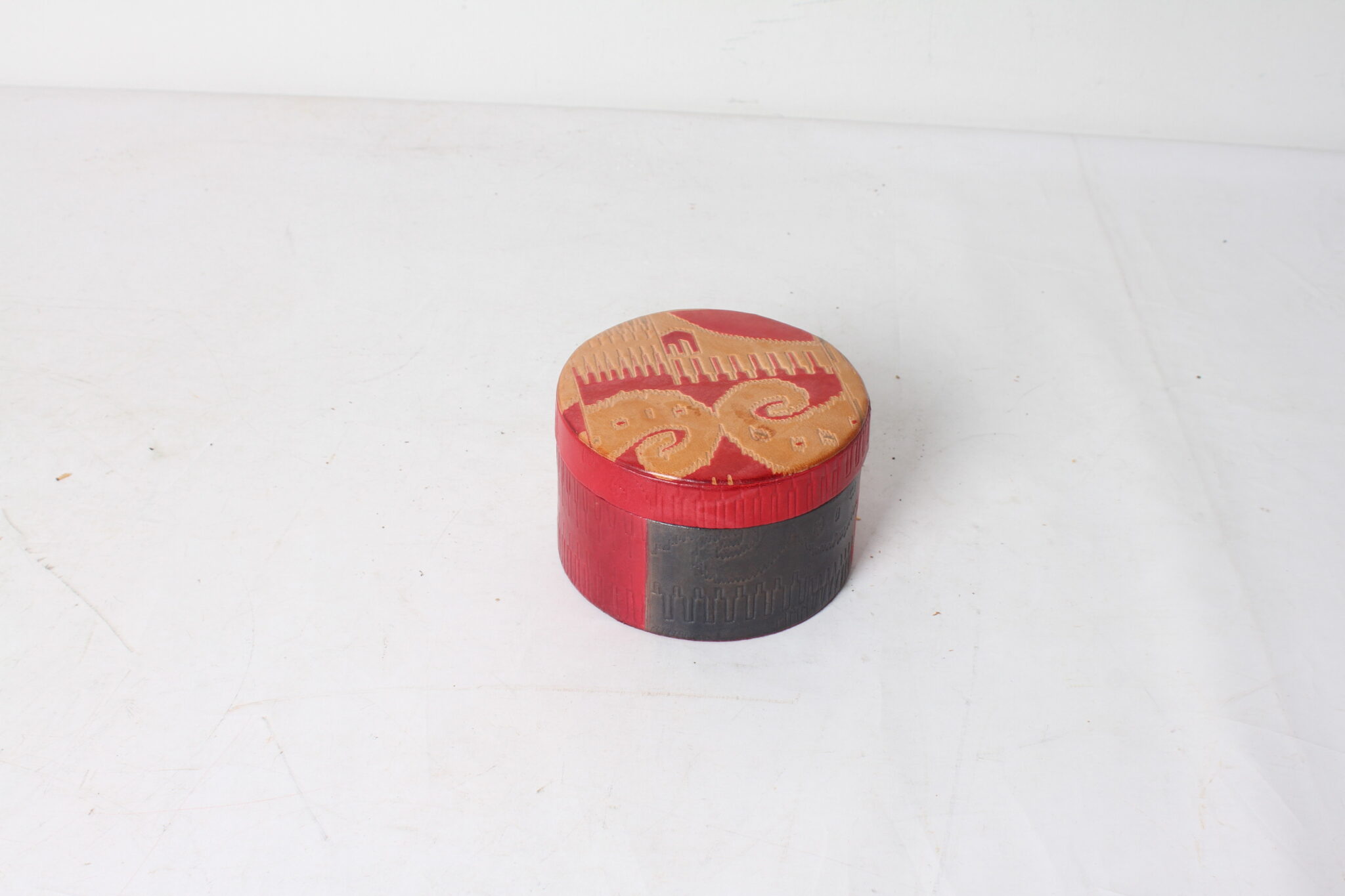 Petite boîte à bijoux ronde en cuir avec intérieur en tissu.