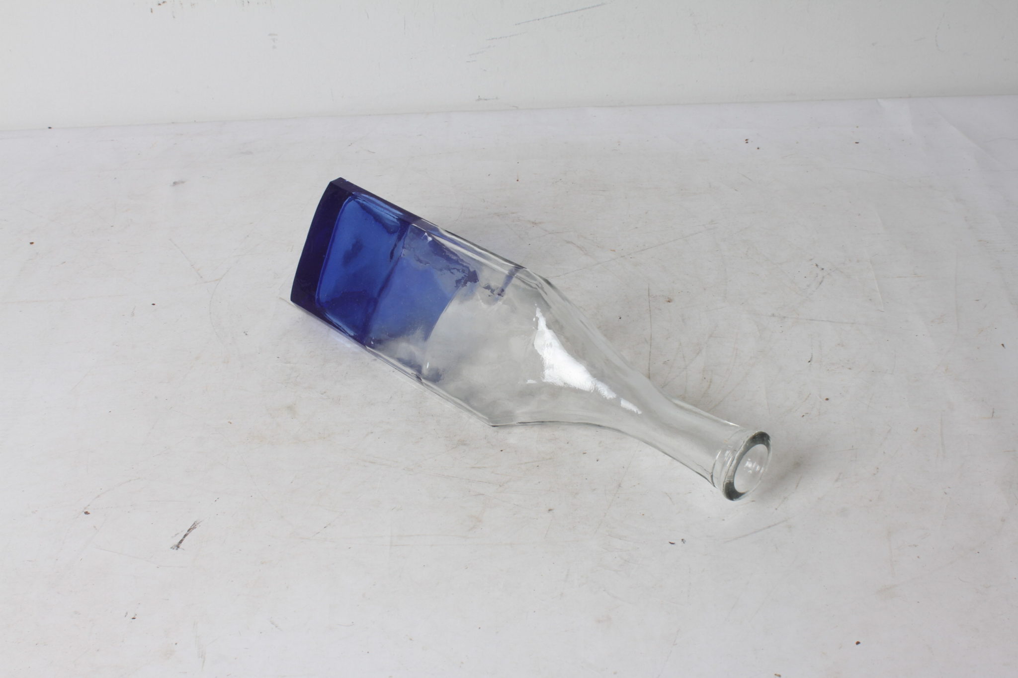 Bouteille en verre épais à reliefs, tiers inférieur bleu cobalt.