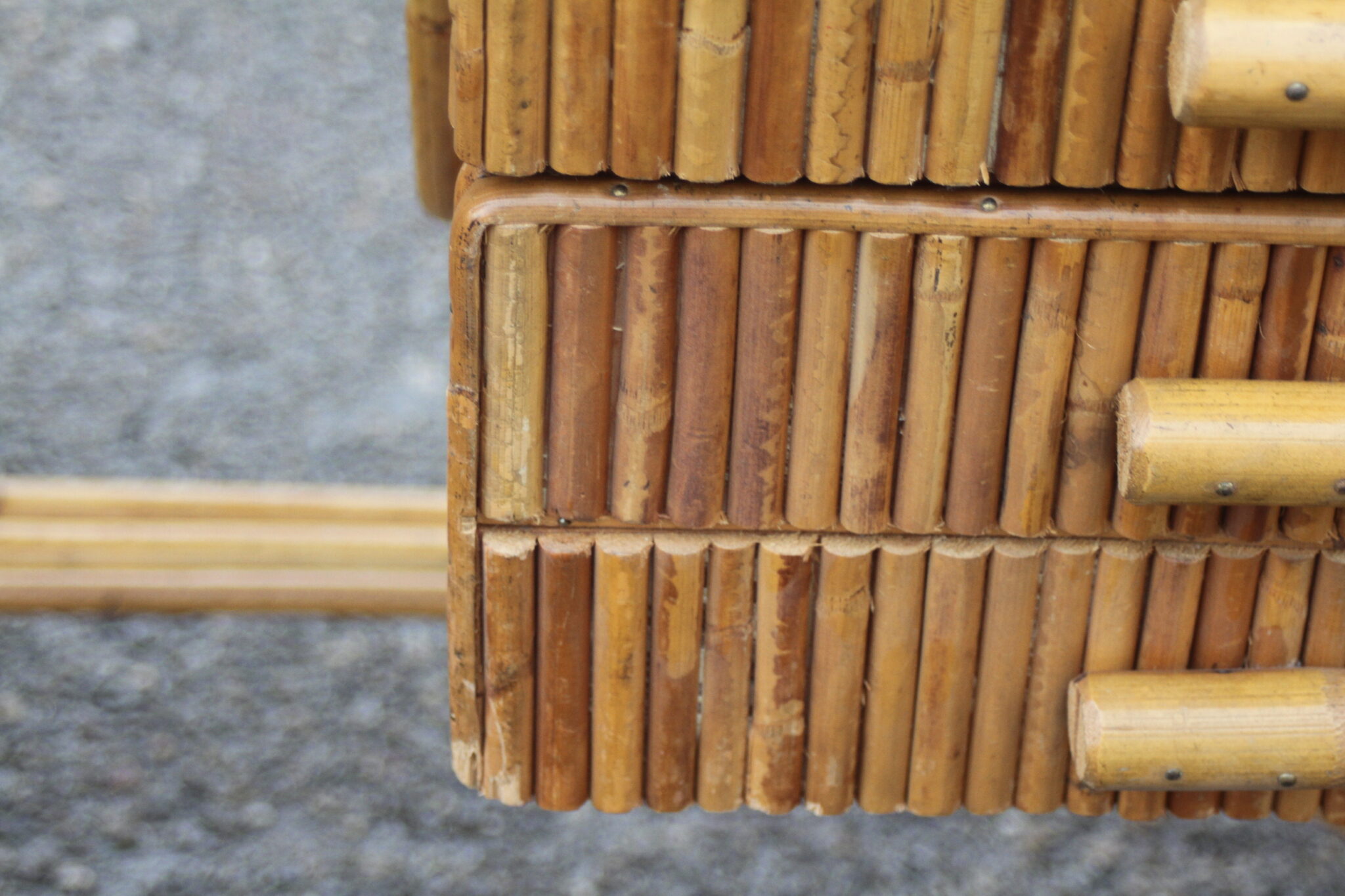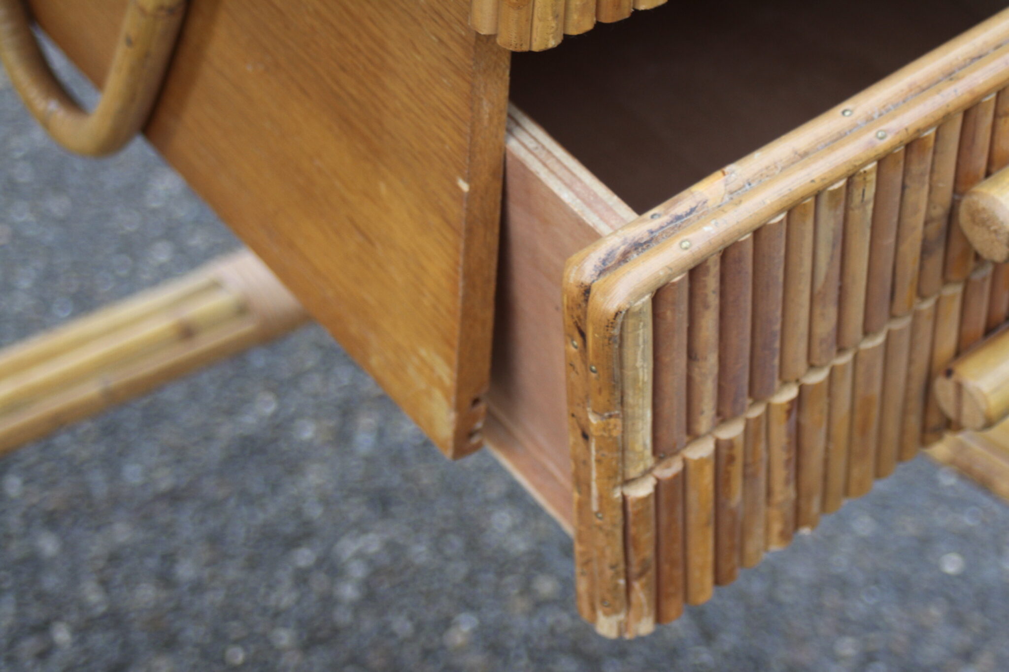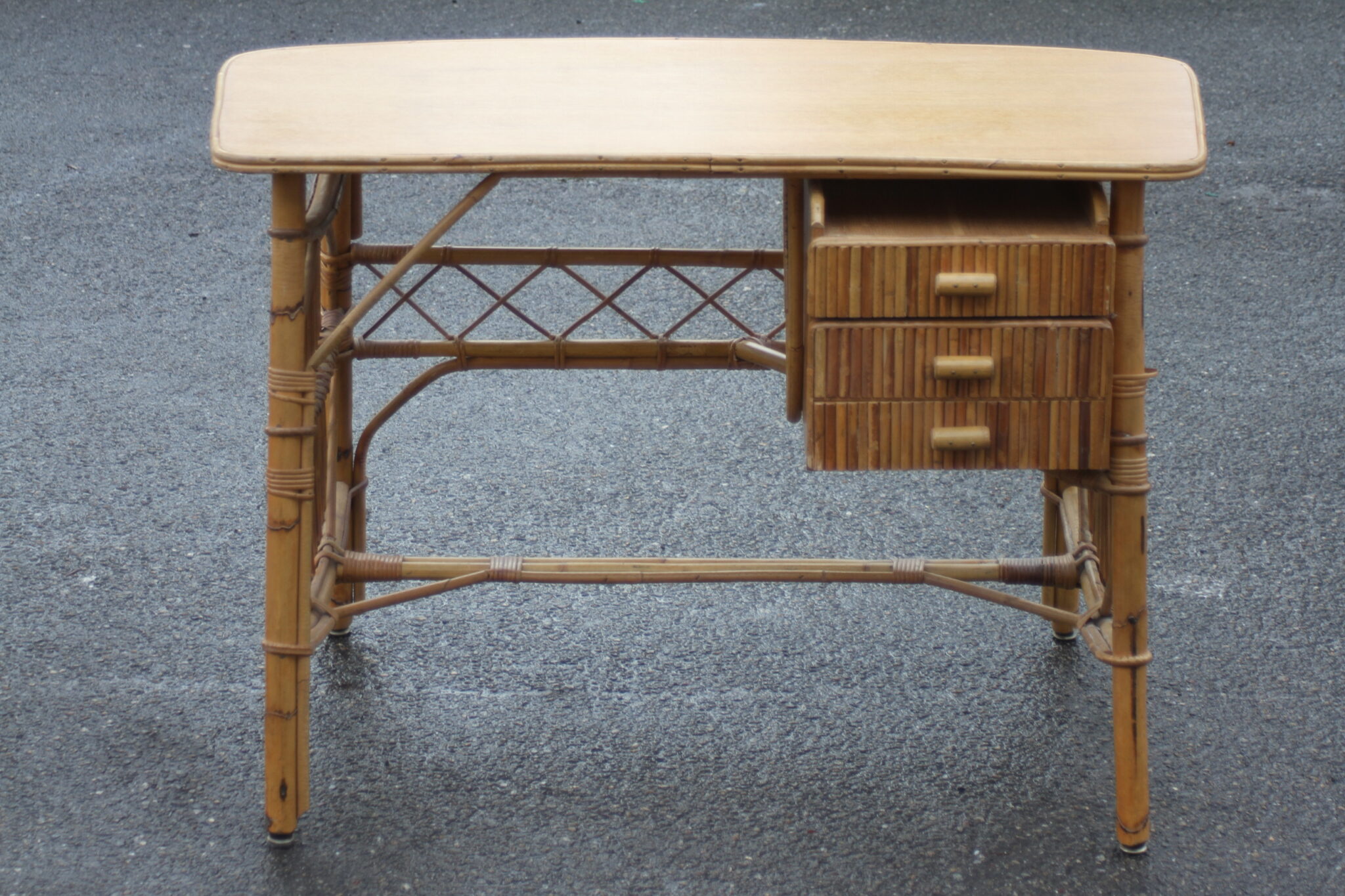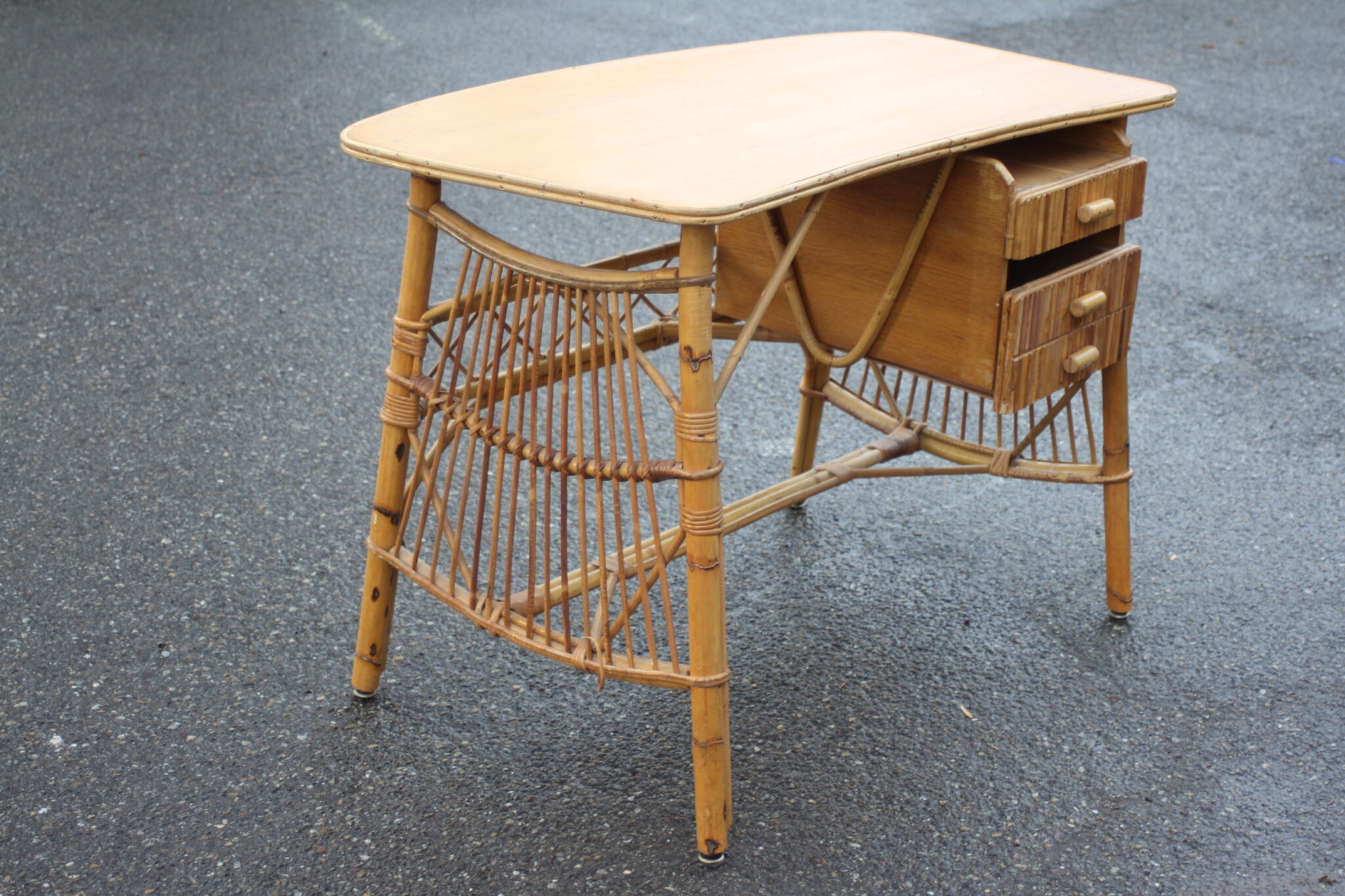 Bureau vintage en rotin et bambou à 2 tiroirs.