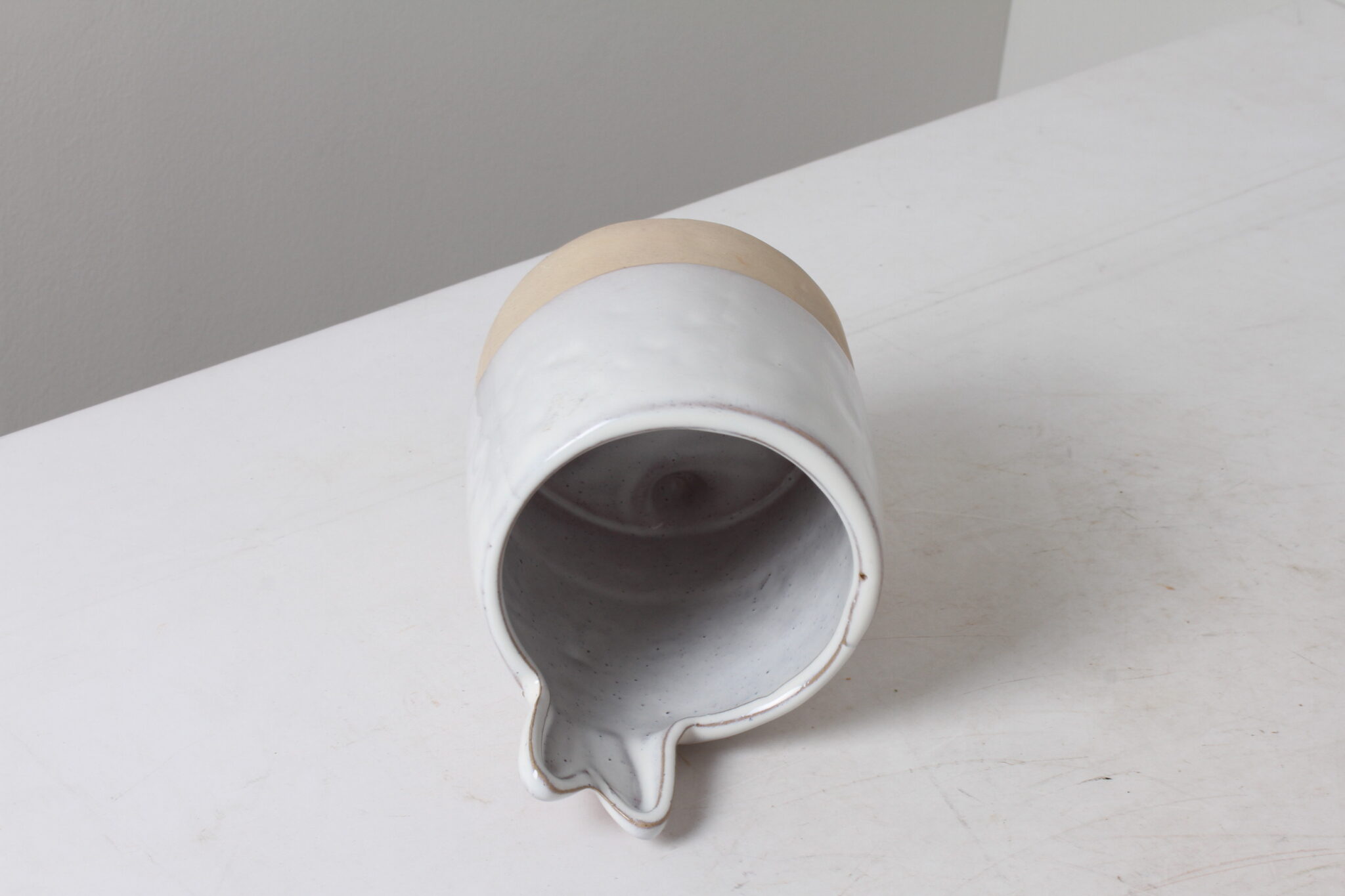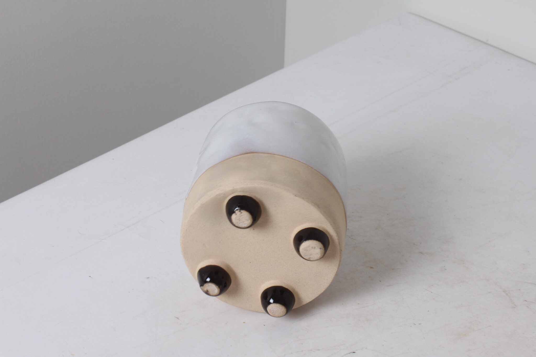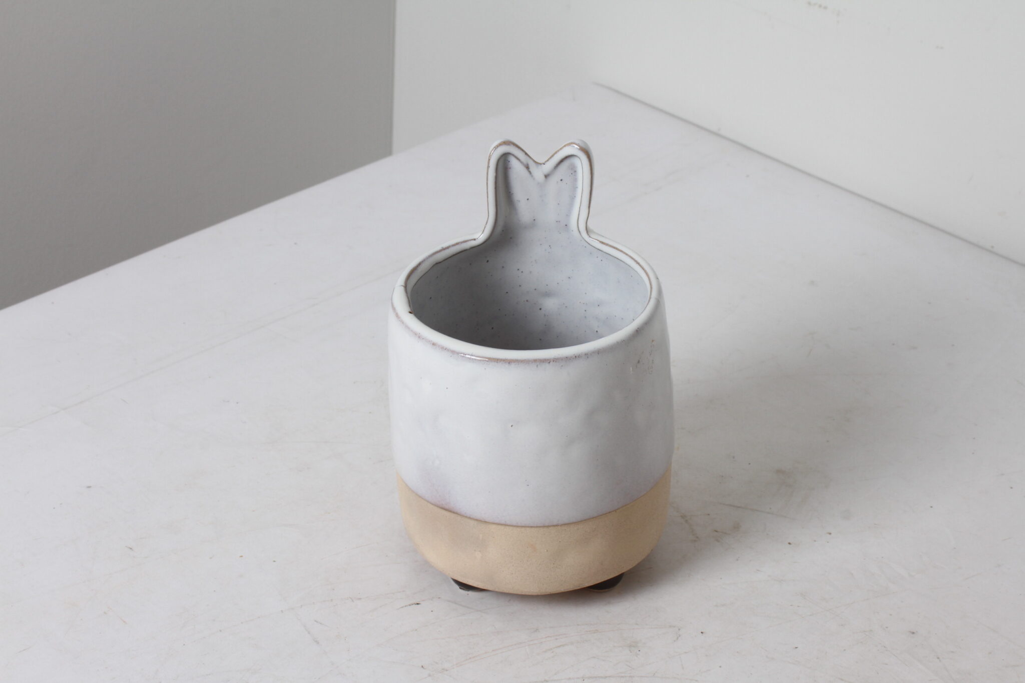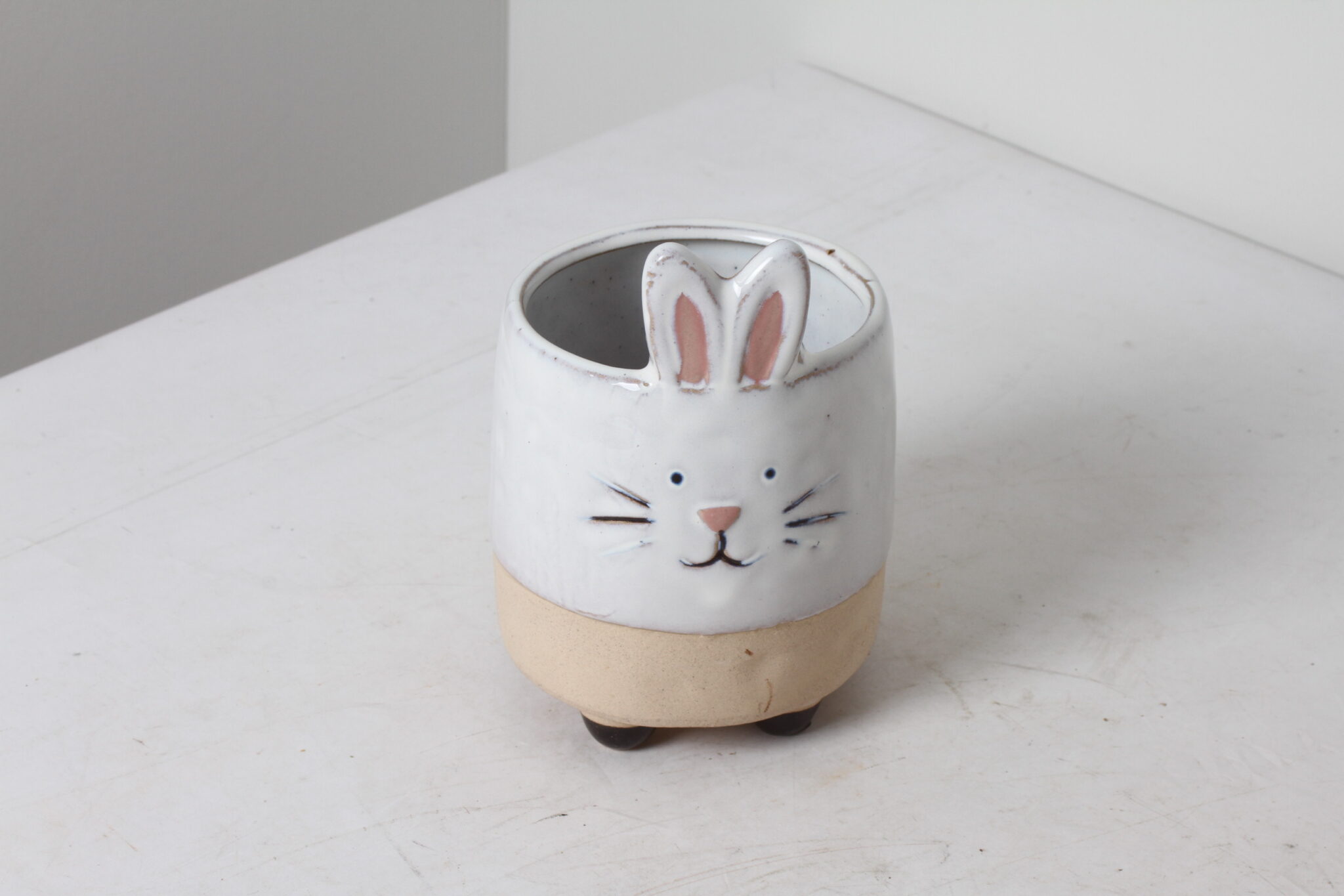 Cache pot lapin en céramique vernissée sur petits pieds.