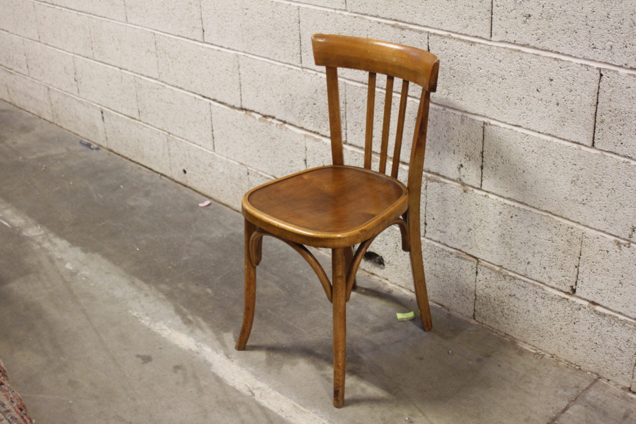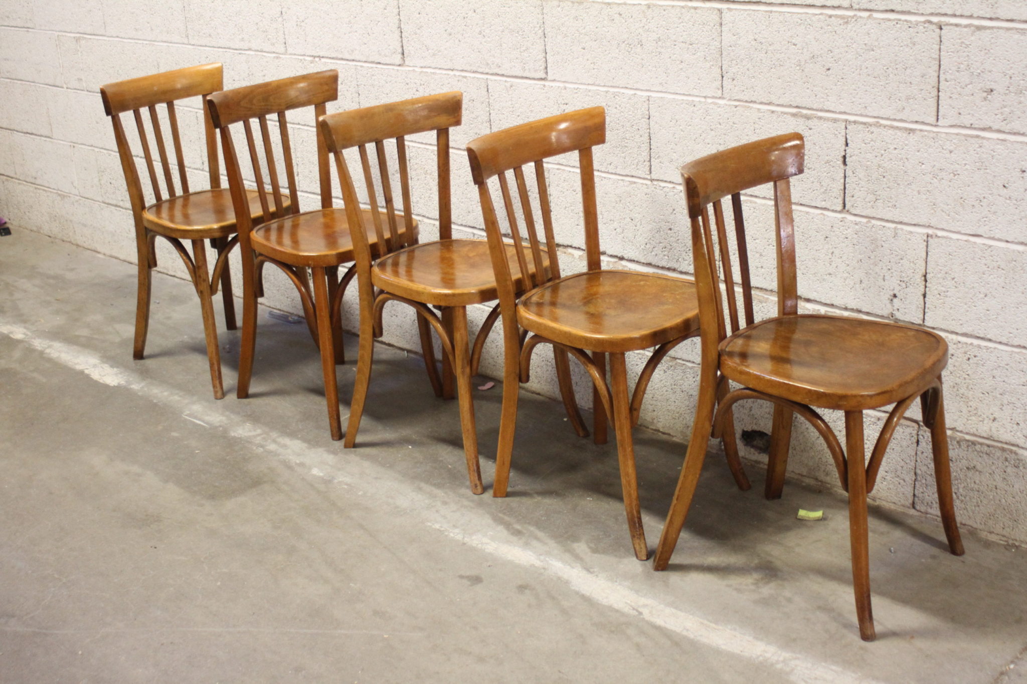 Suite de 5 anciennes chaises bistrot en bois de la marque Fischel.