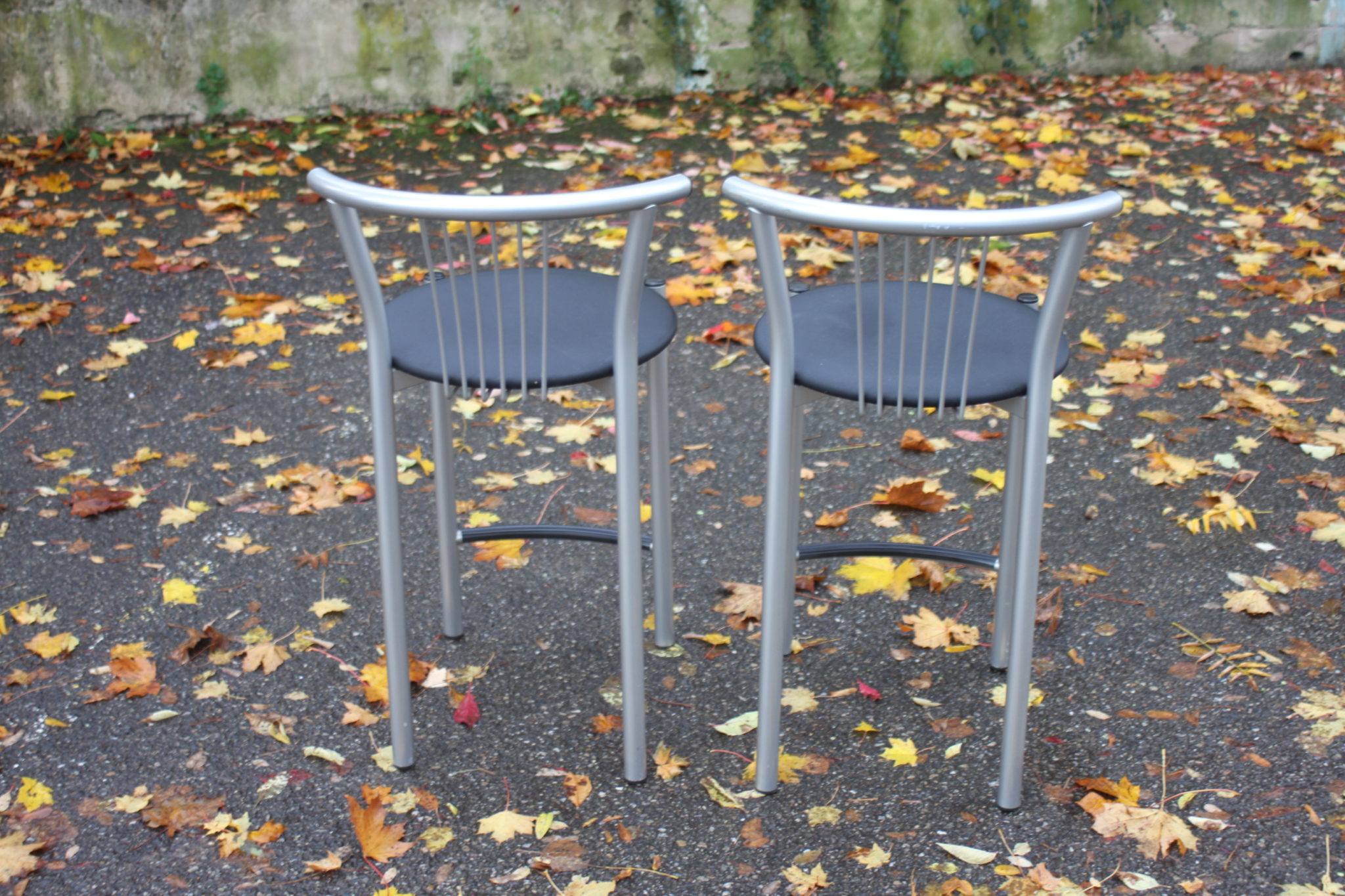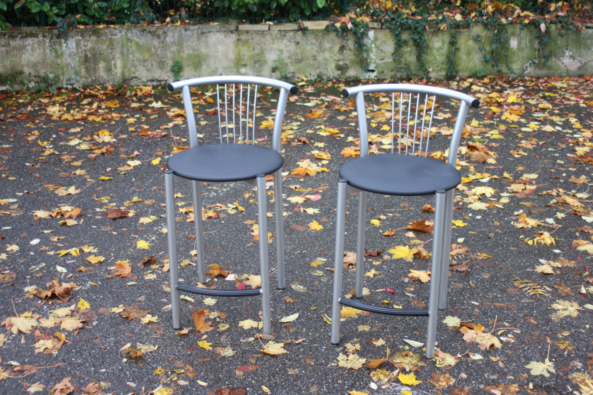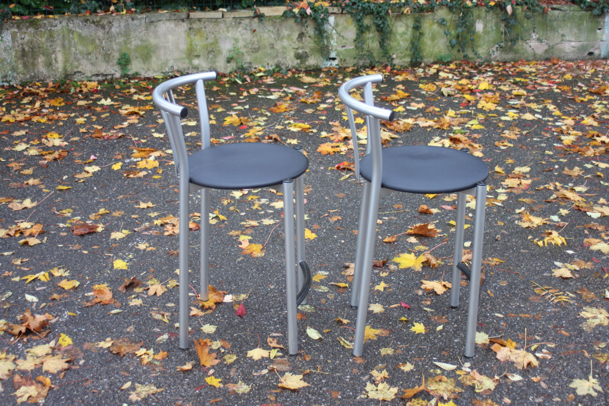 Chaises sur strucuture en métal avec assise ronde de couleur noire.