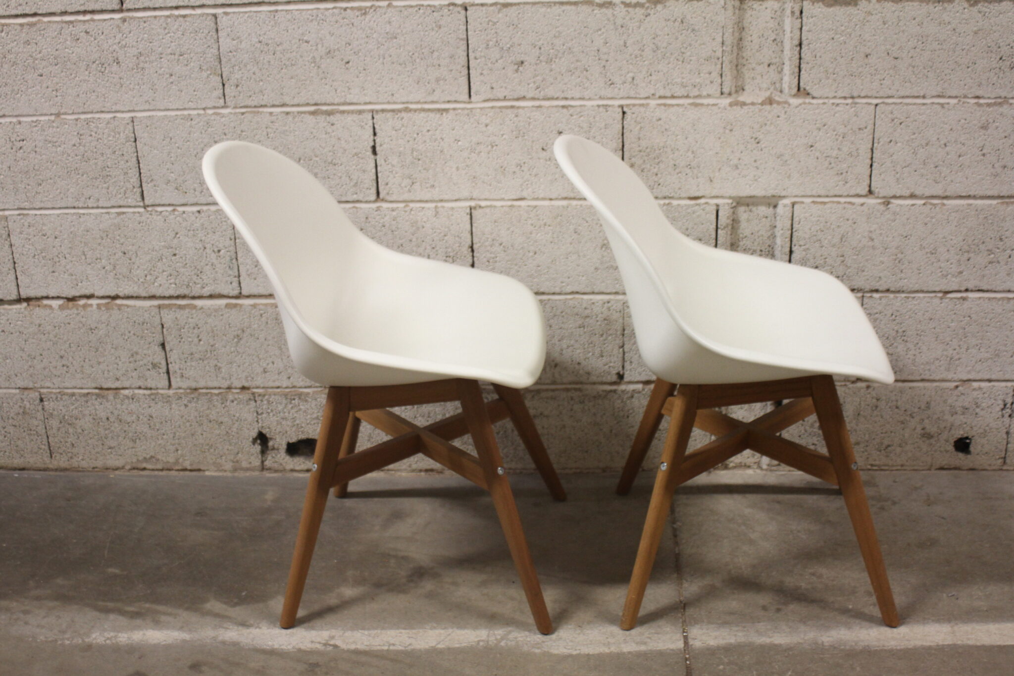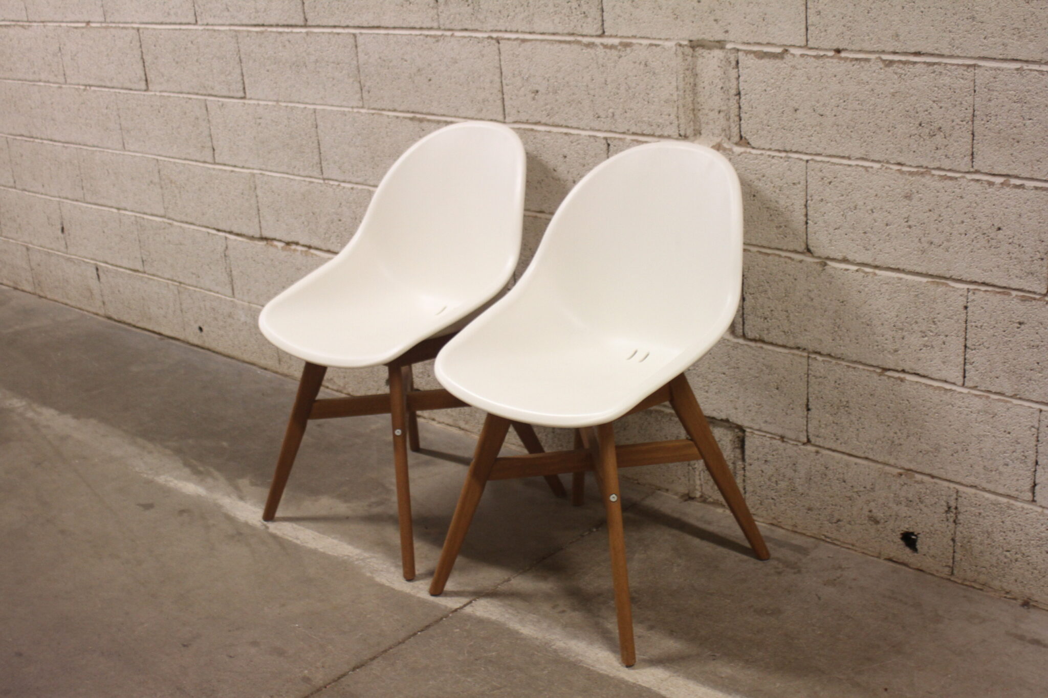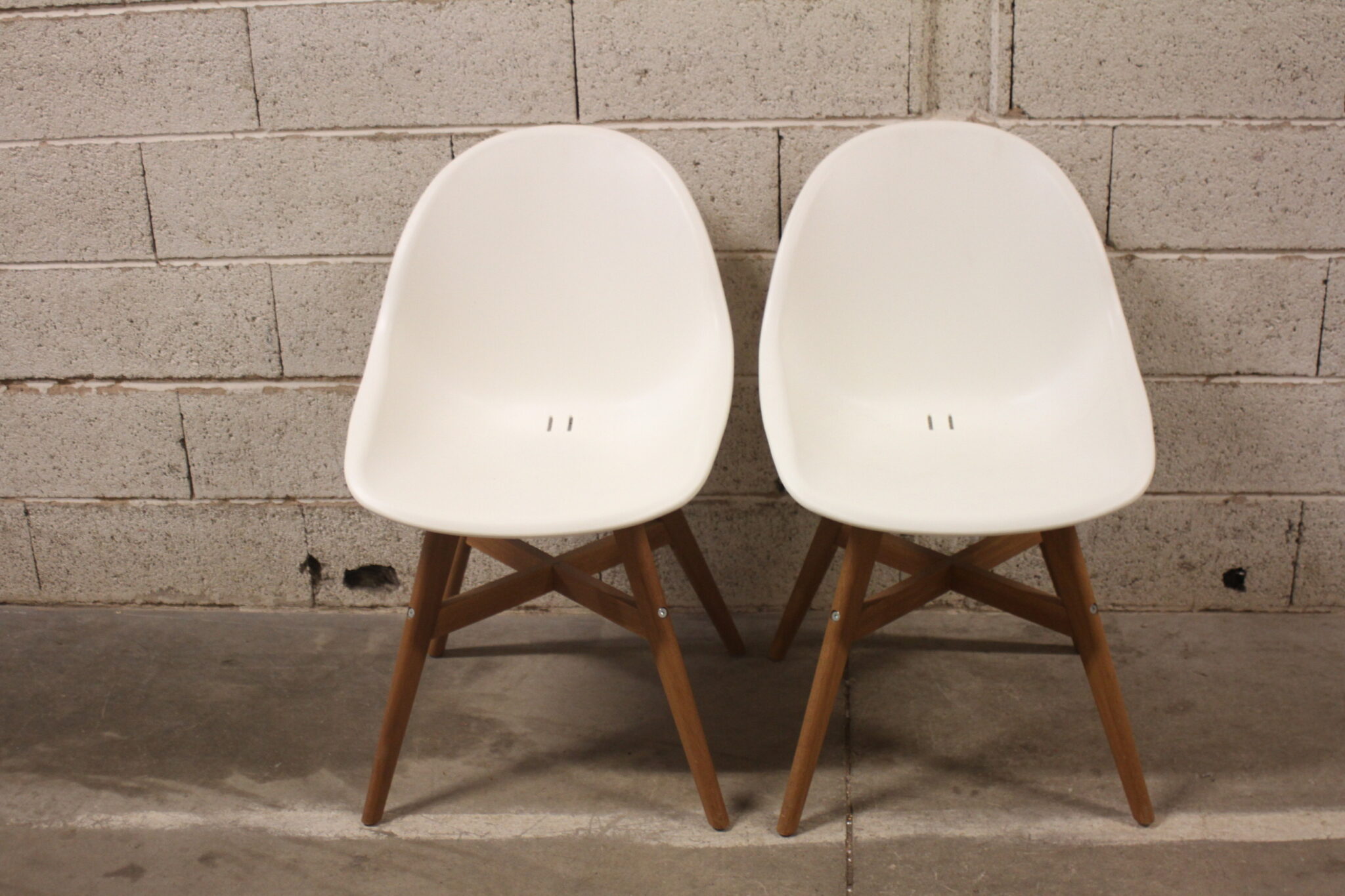 Chaises sur structure en bois avec assise coque en plastique blanc.