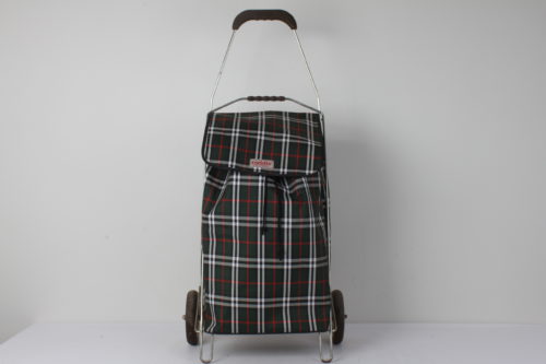 Chariot à structure en métal avec sac amovible en tissu à carreaux.