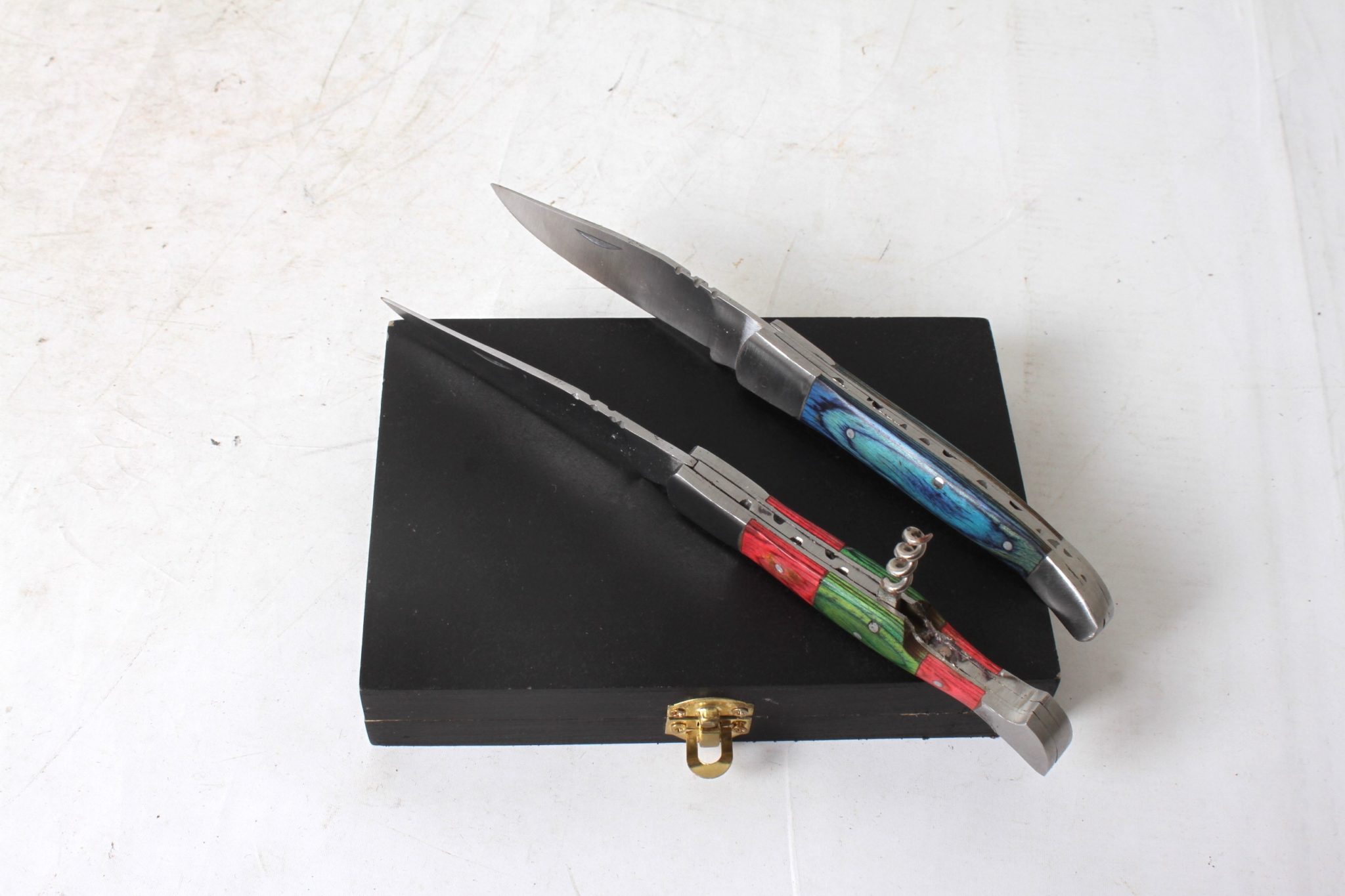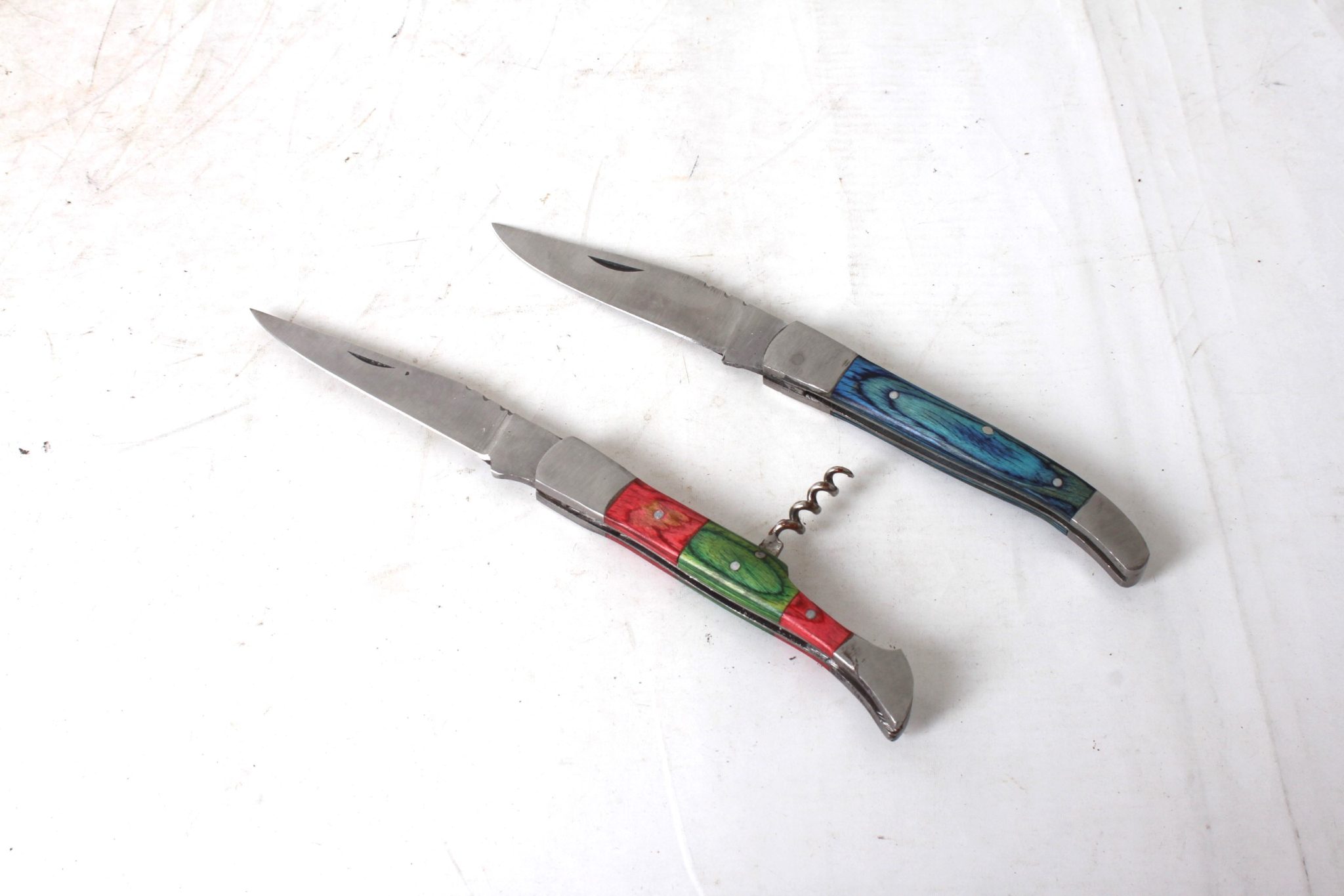 Montés sur un manche en bois teinté (rouge et vert pour le 1er, bleu pour le 2e), lame en acier inoxydable.