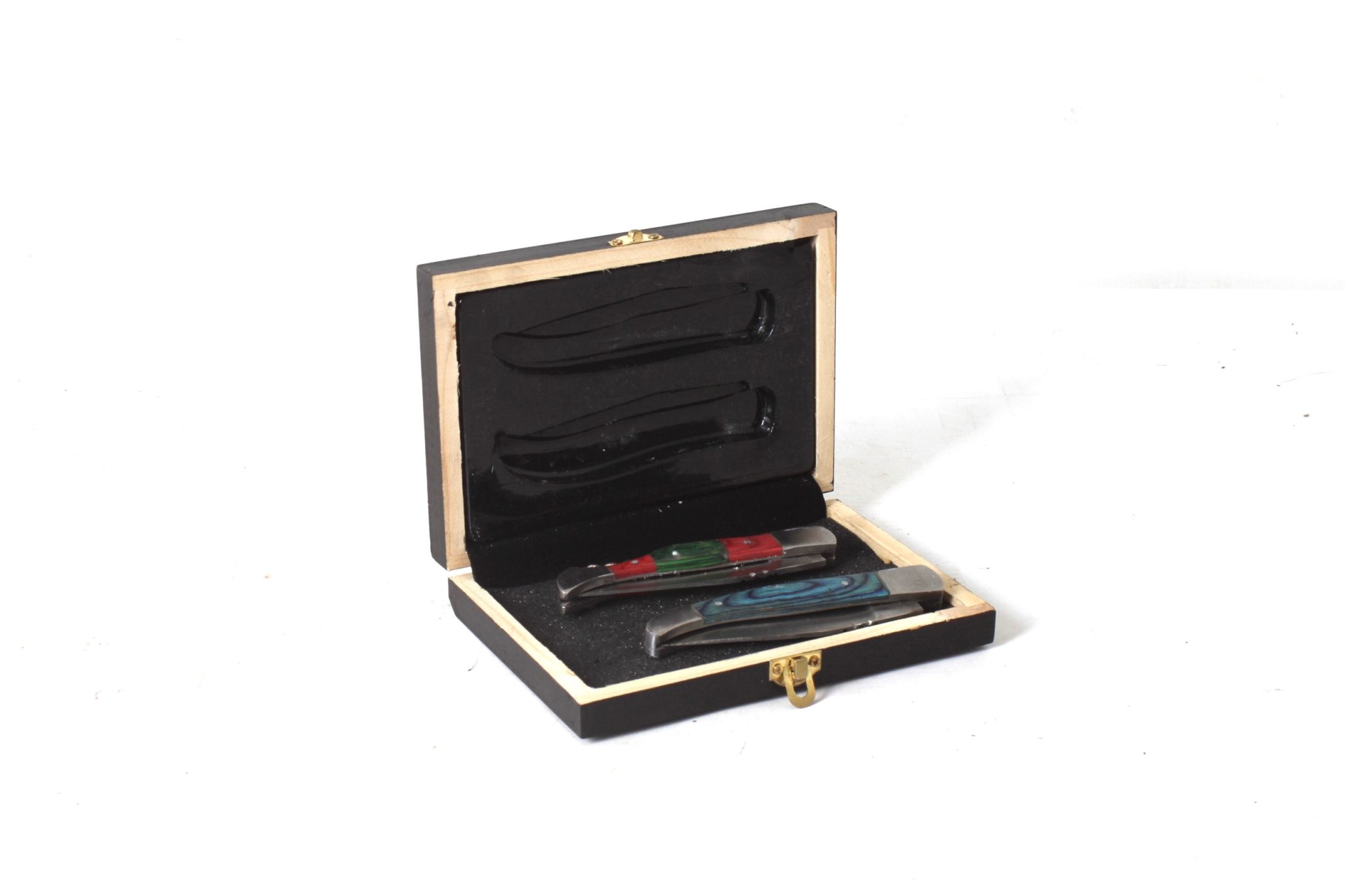 Dimensions du coffret : 11 x 16 cm – Diemnsions d’un couteau ouvert : 20 cm.