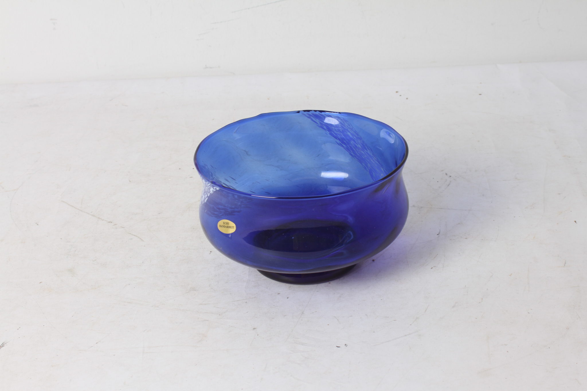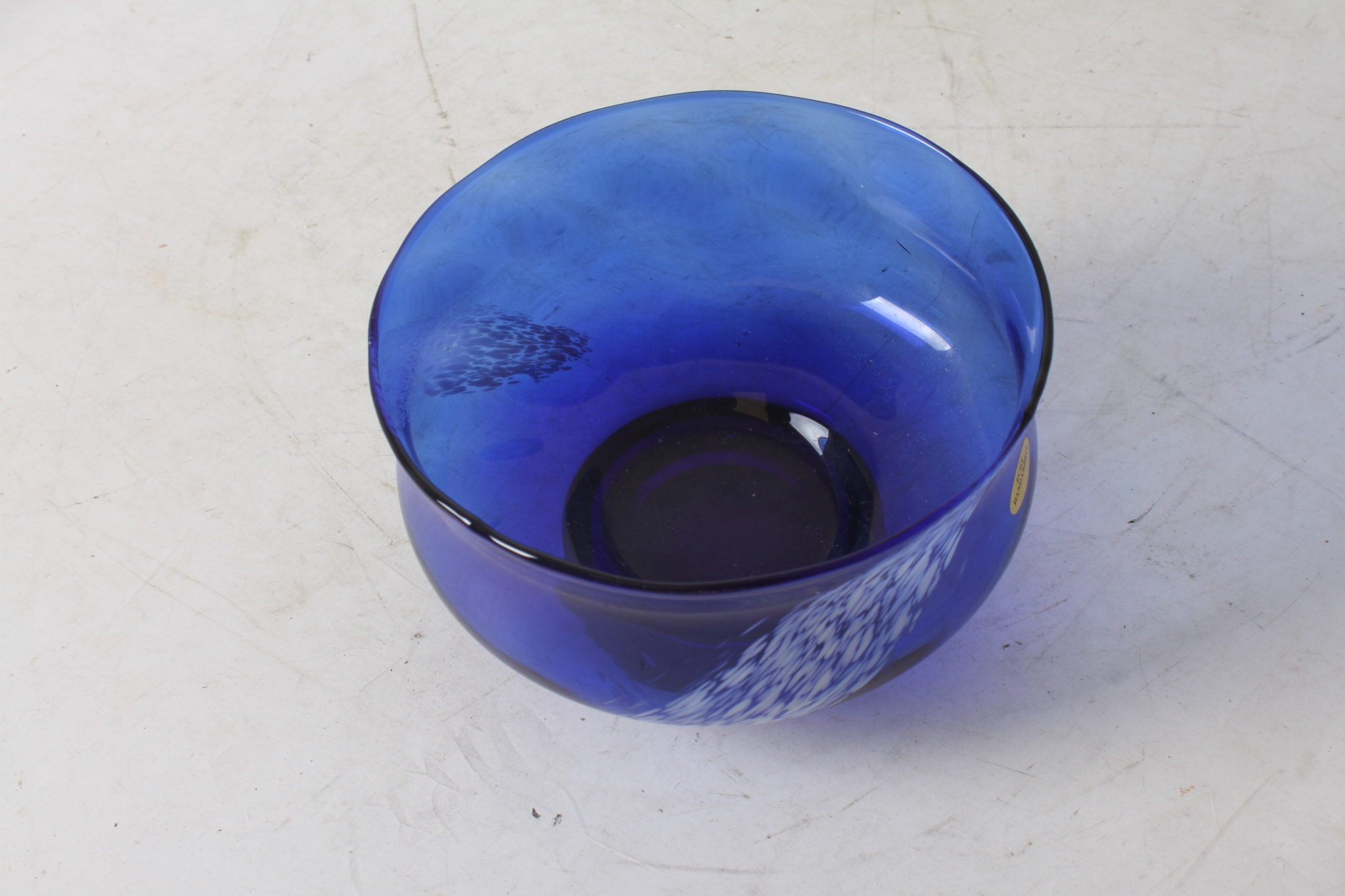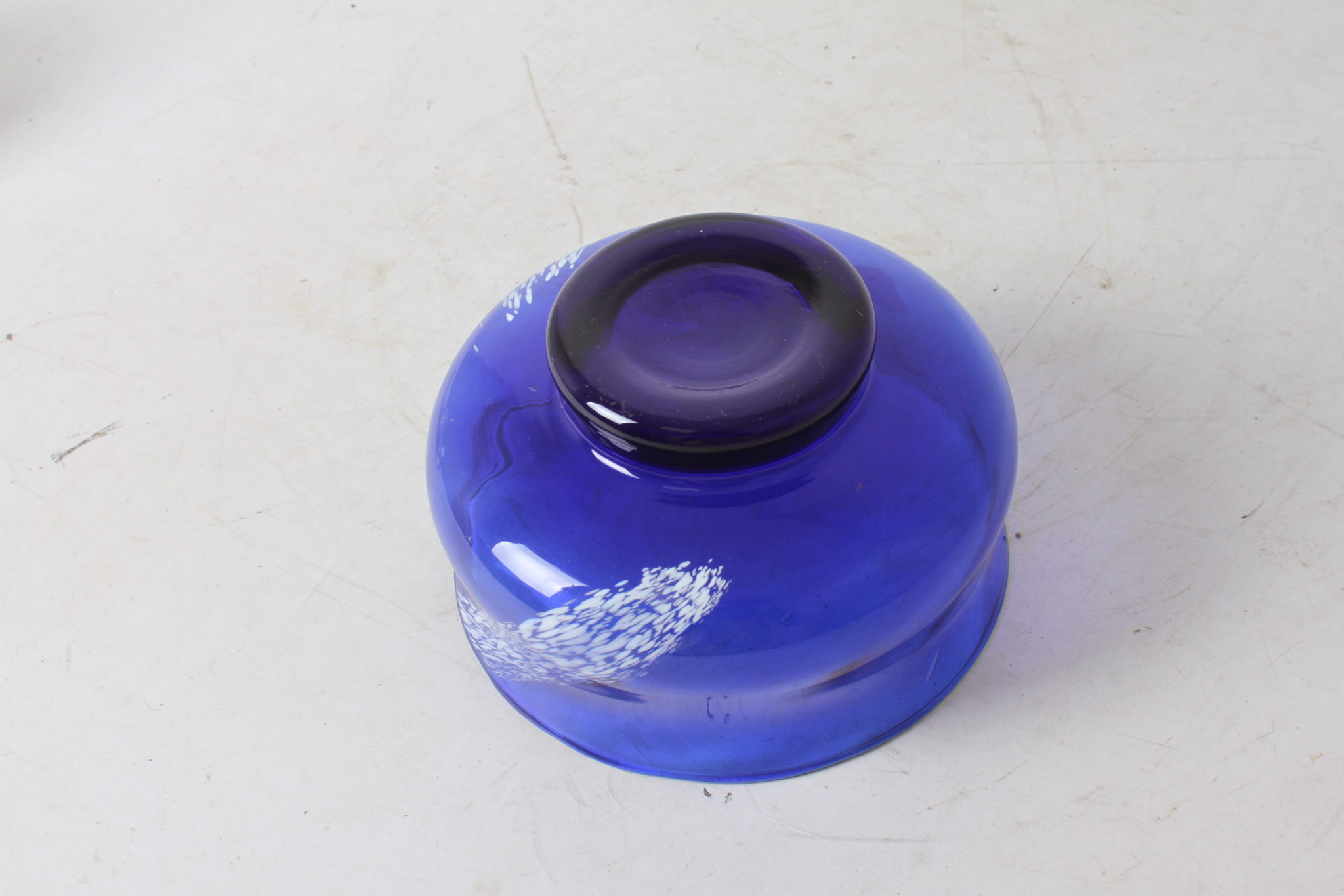 Belle coupe vintage, bord ondulé, en verre soufflé de couleur bleu cobalt, décor moucheté/volutes de fumée blanches.