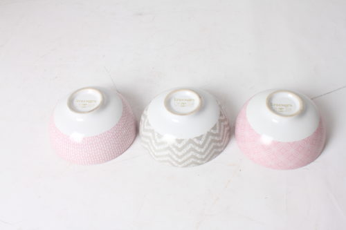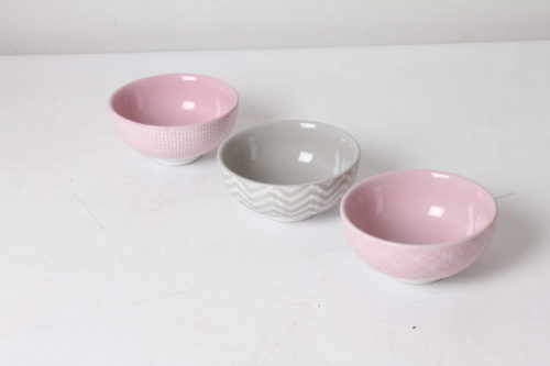 Série de 3 coupelles en céramique Linvosges, 2 roses et 1 grise.