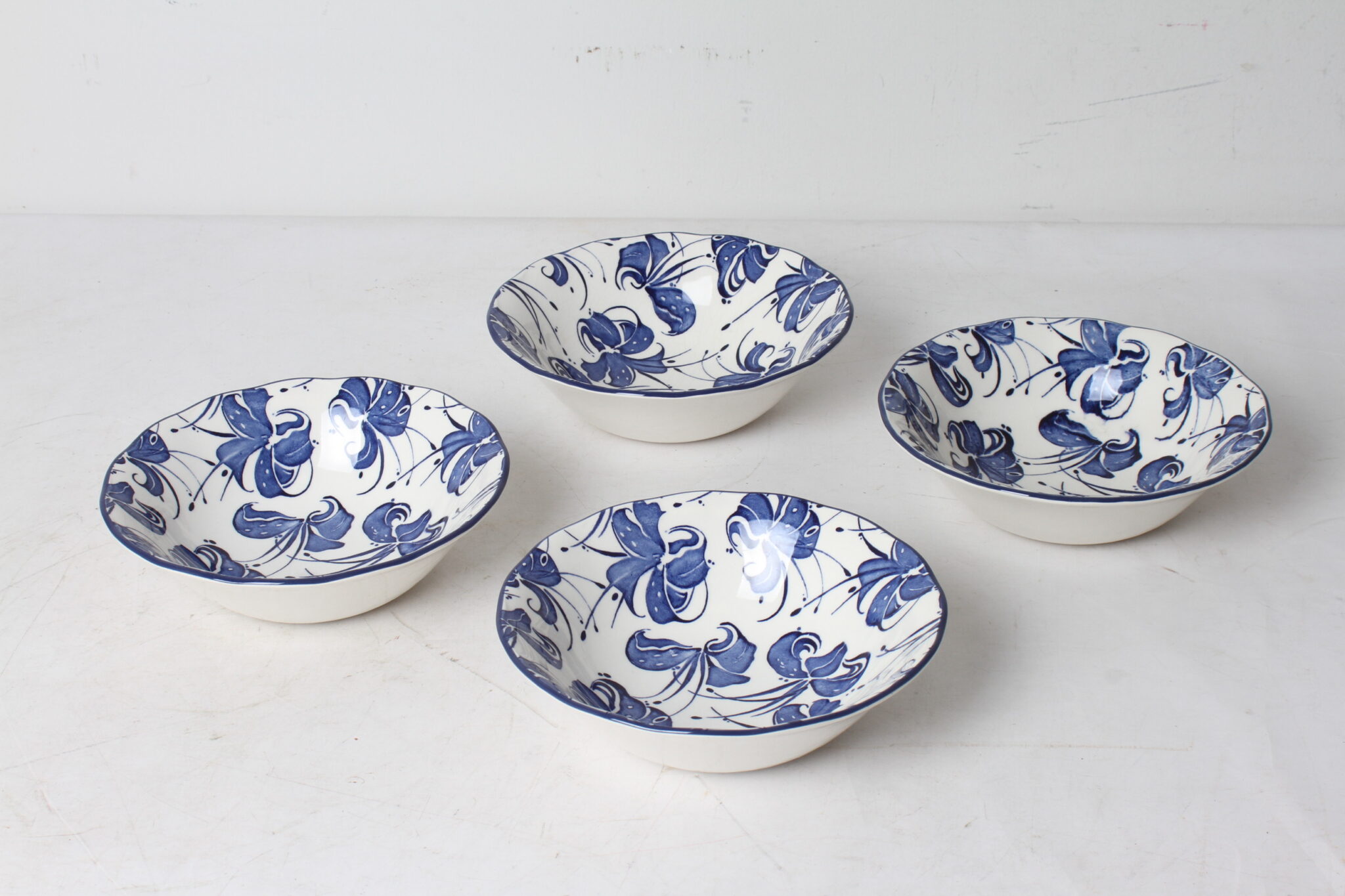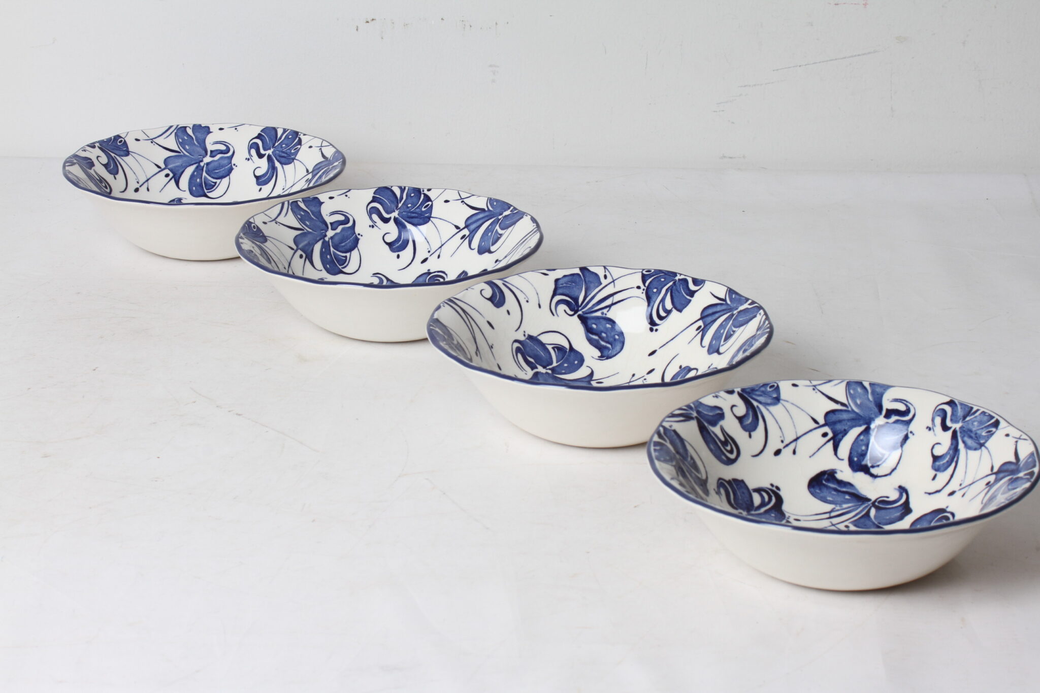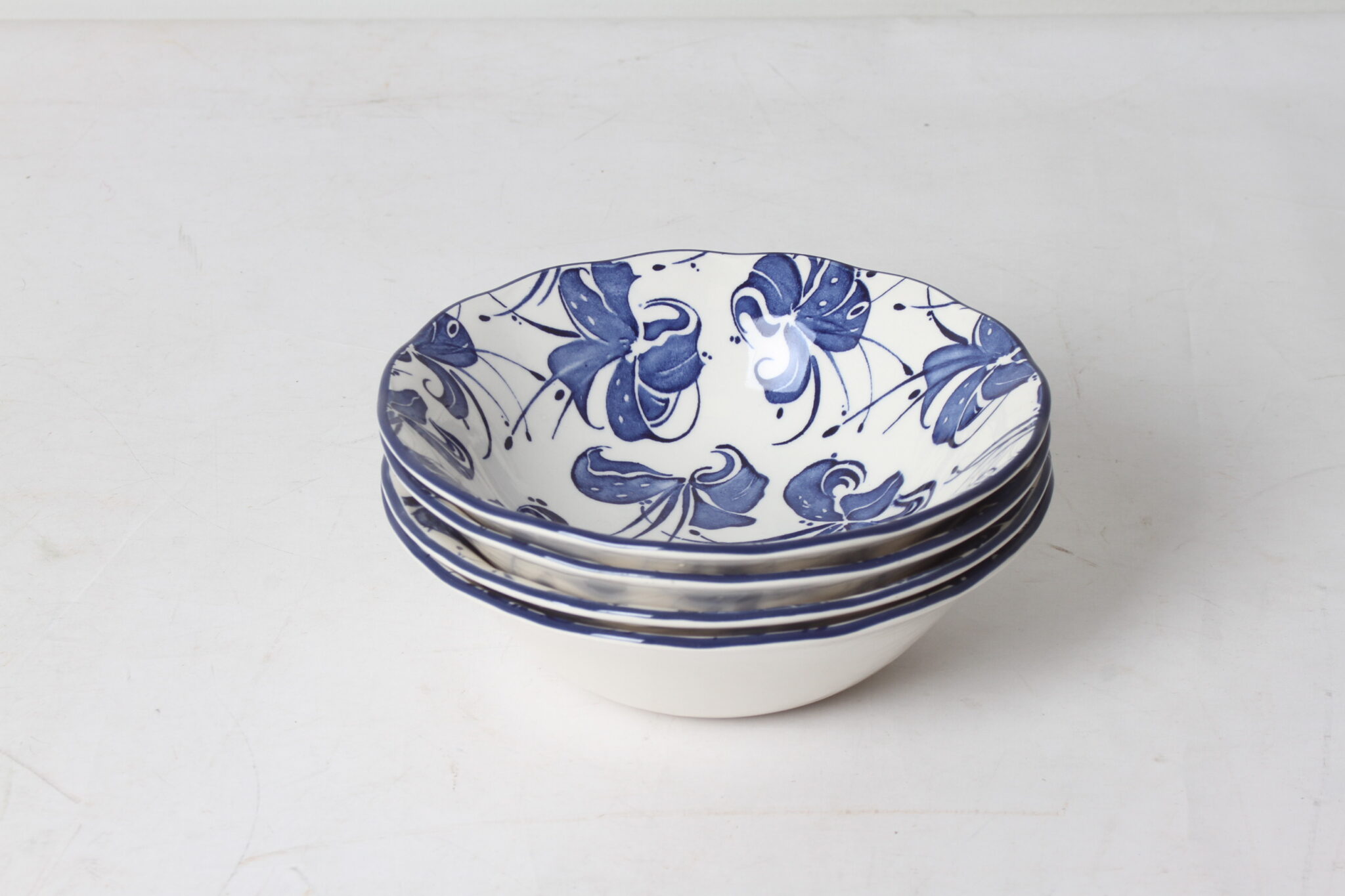 Bols, coupelles en céramique blanche à motifs bleus.