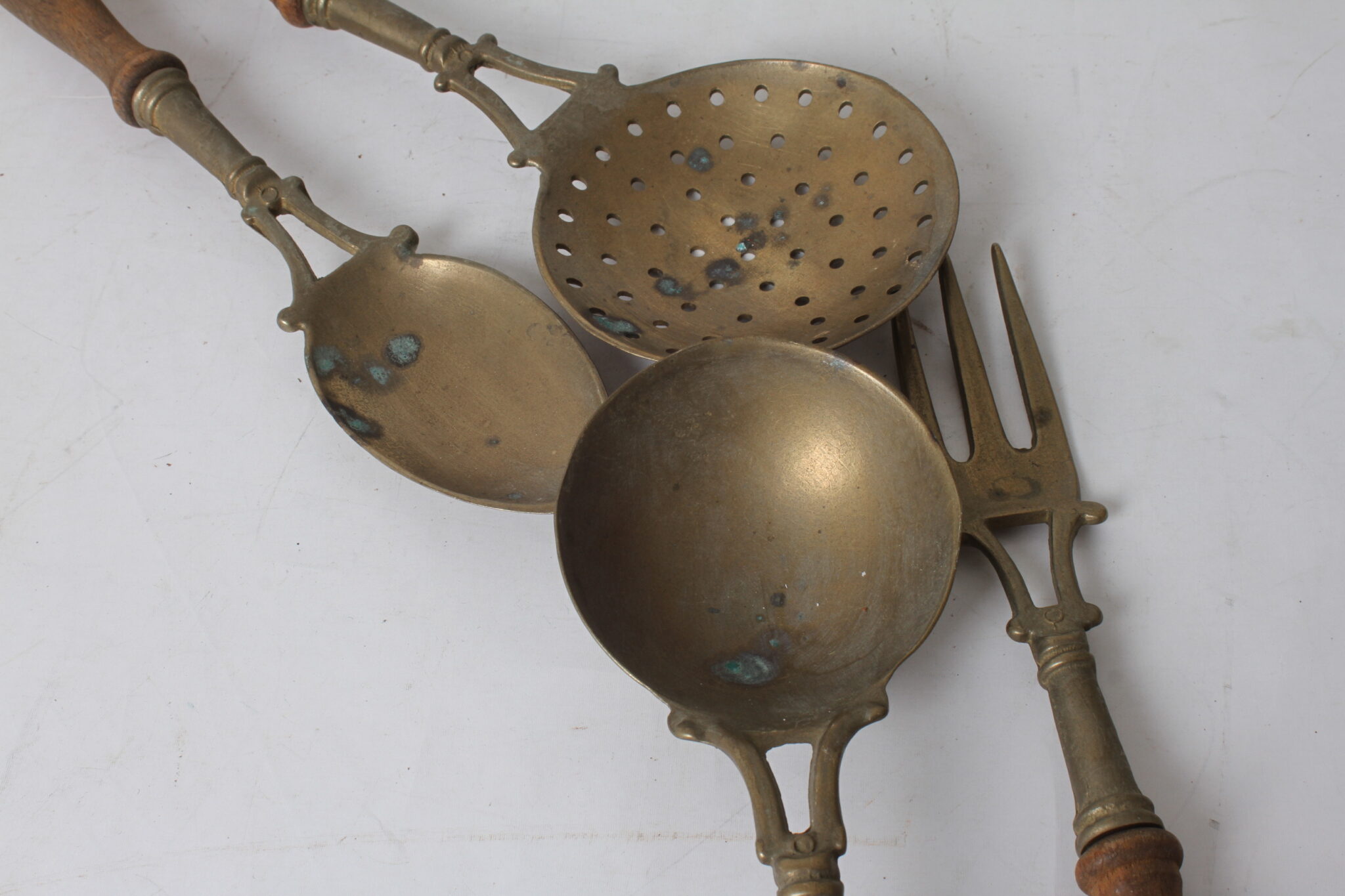 Ensemble ancien d’ustensiles de cuisine en bronze et bois.