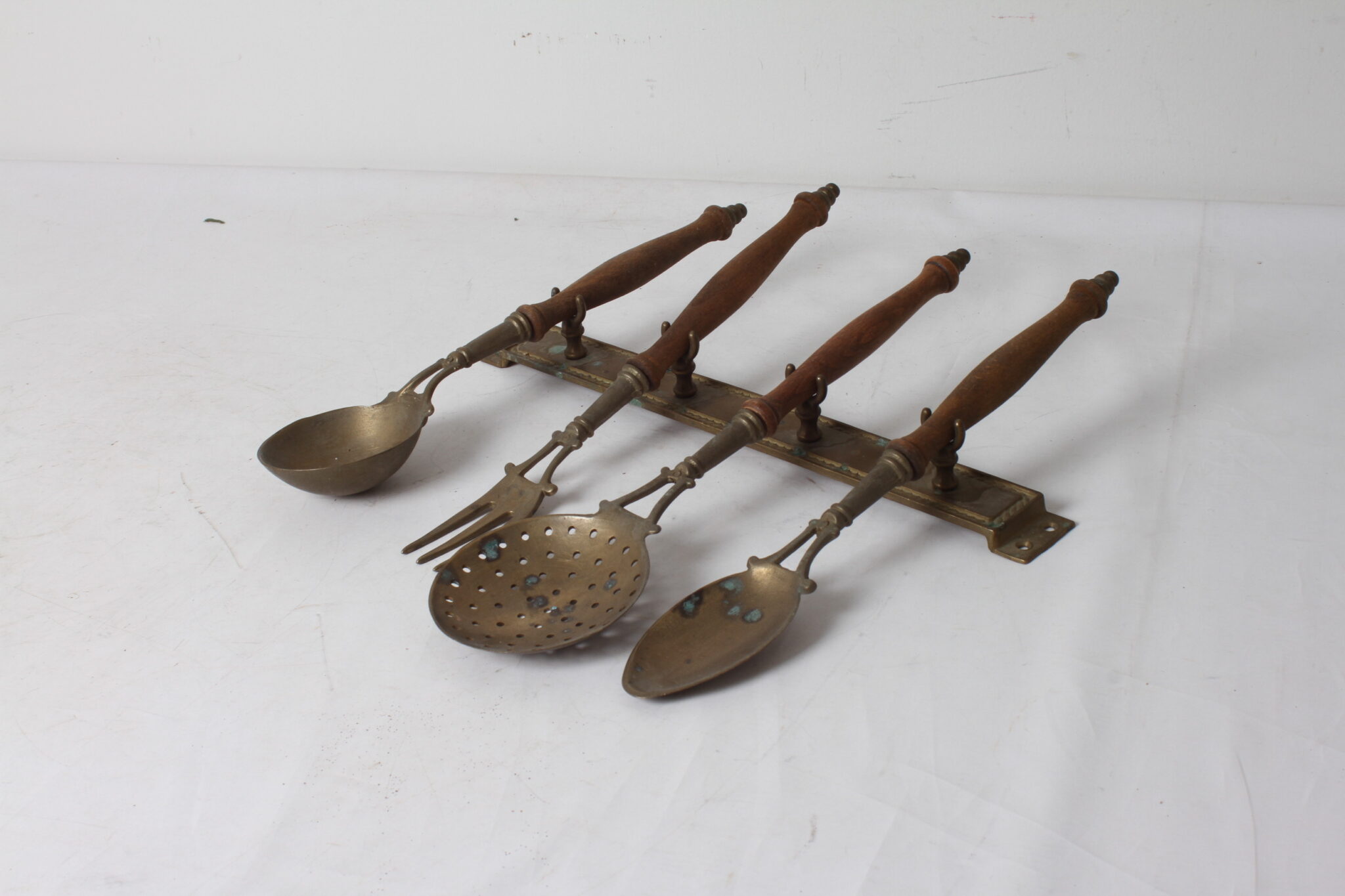 Ensemble composé d’une fourchette, d’une cuillère, d’une louche,d’une passoire et d’un support mural.