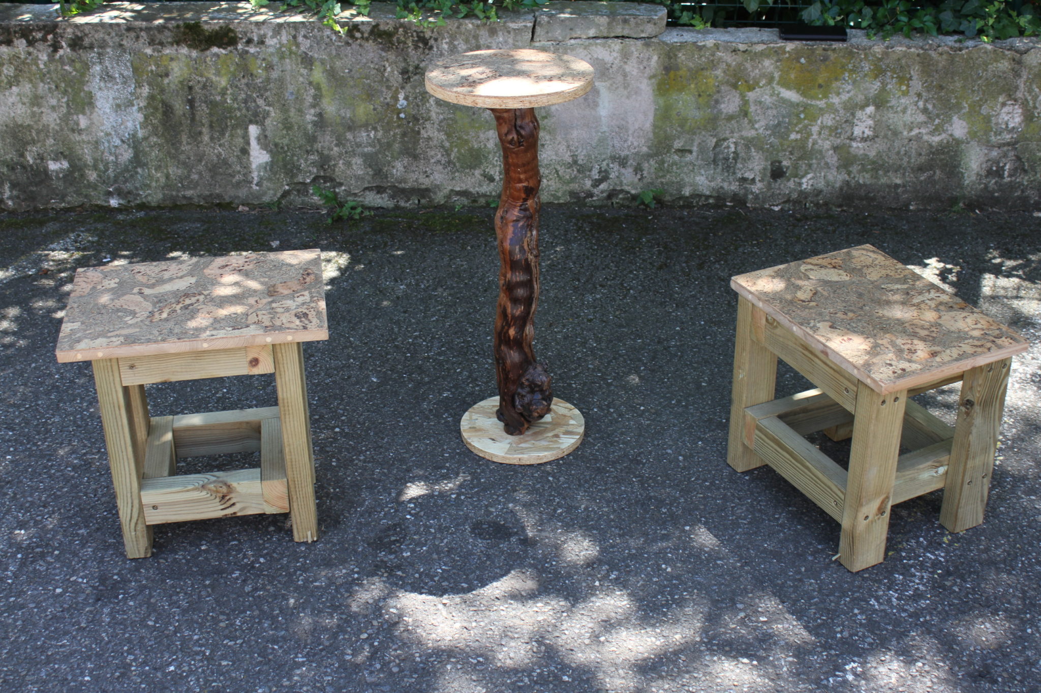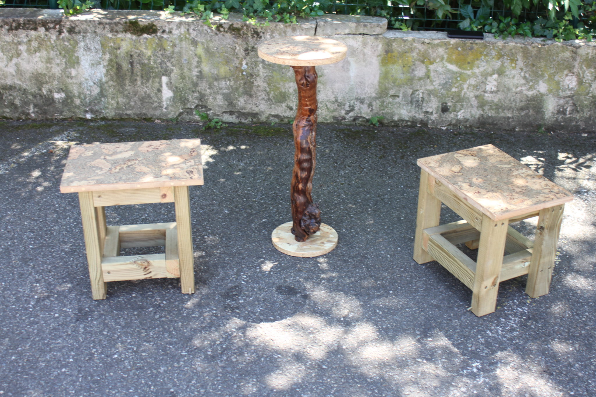 Ensemble de 3 guéridons en bois avec plateau en liège.