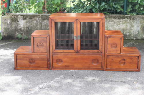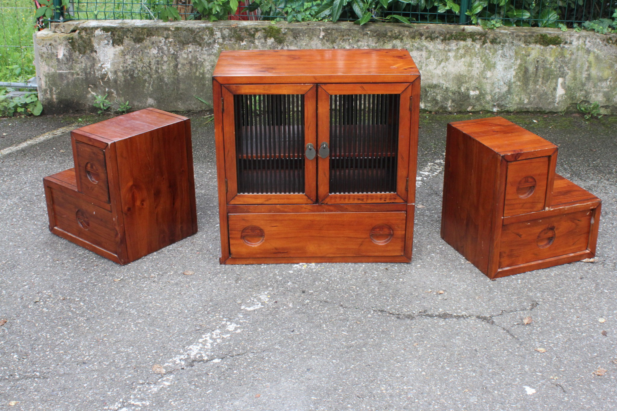 Ensemble composé d’1 meuble à 2 portes et 2 tiroirs et de 2 petits meubles à 2 tiroirs.