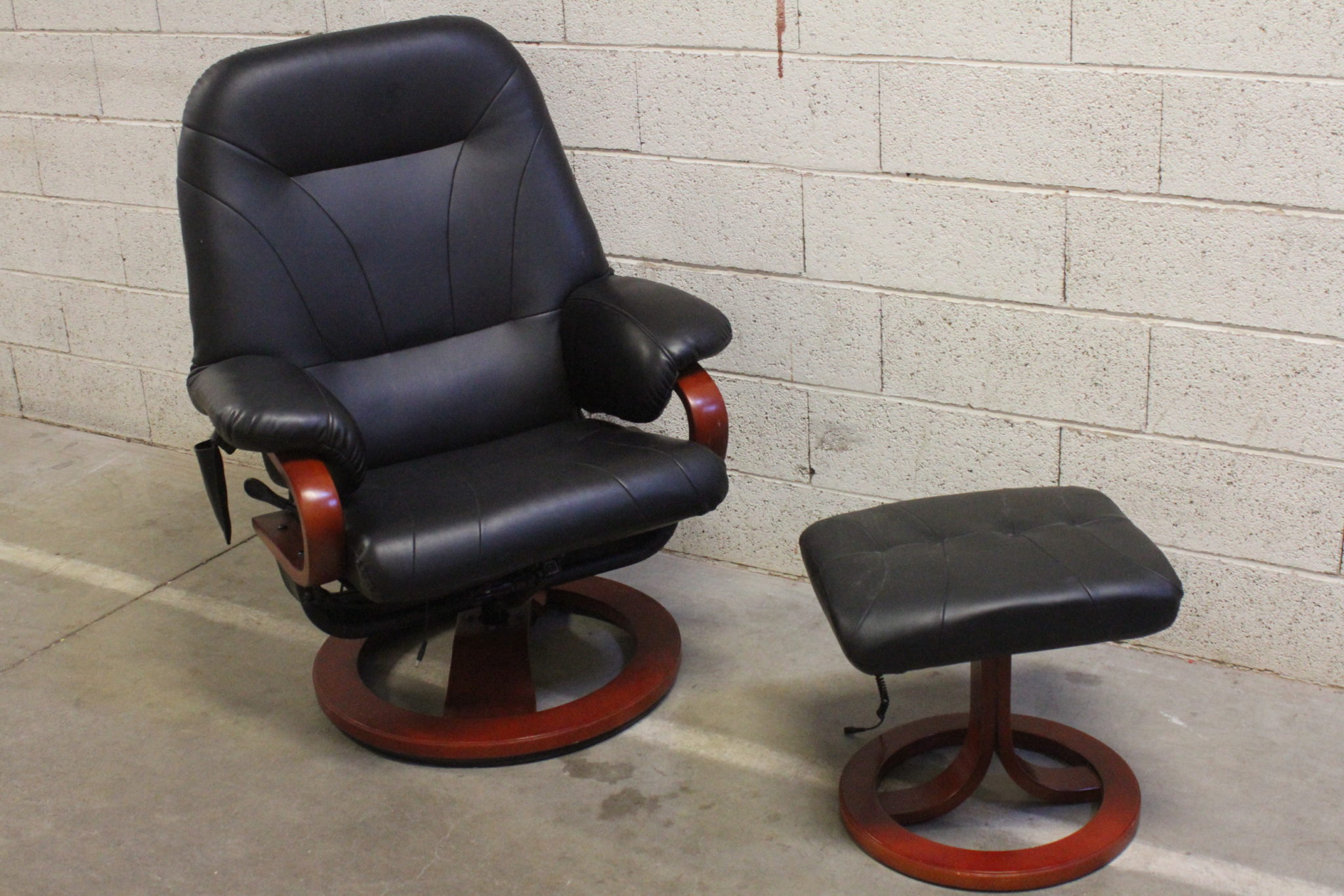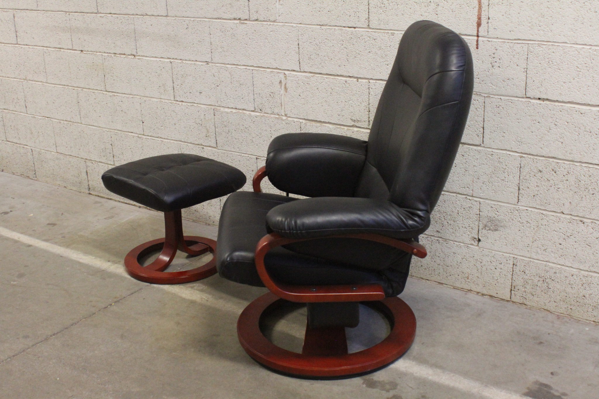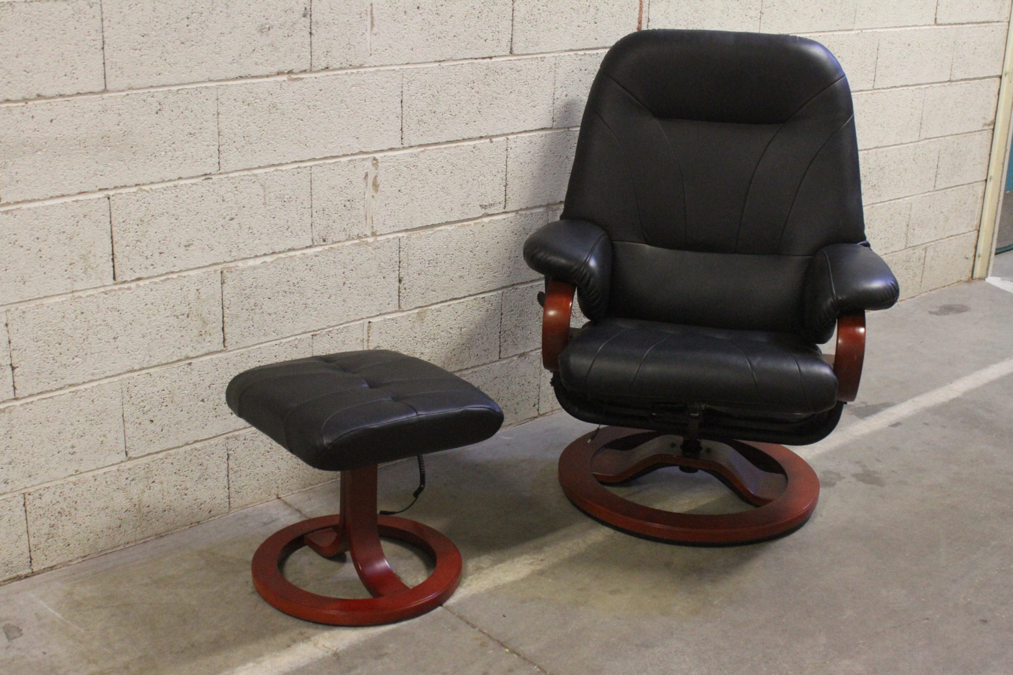 Fauteuil relax et son repose pieds en bois foncé et skaï noir.