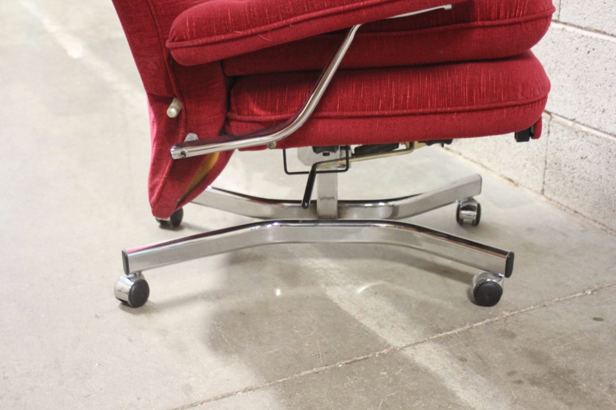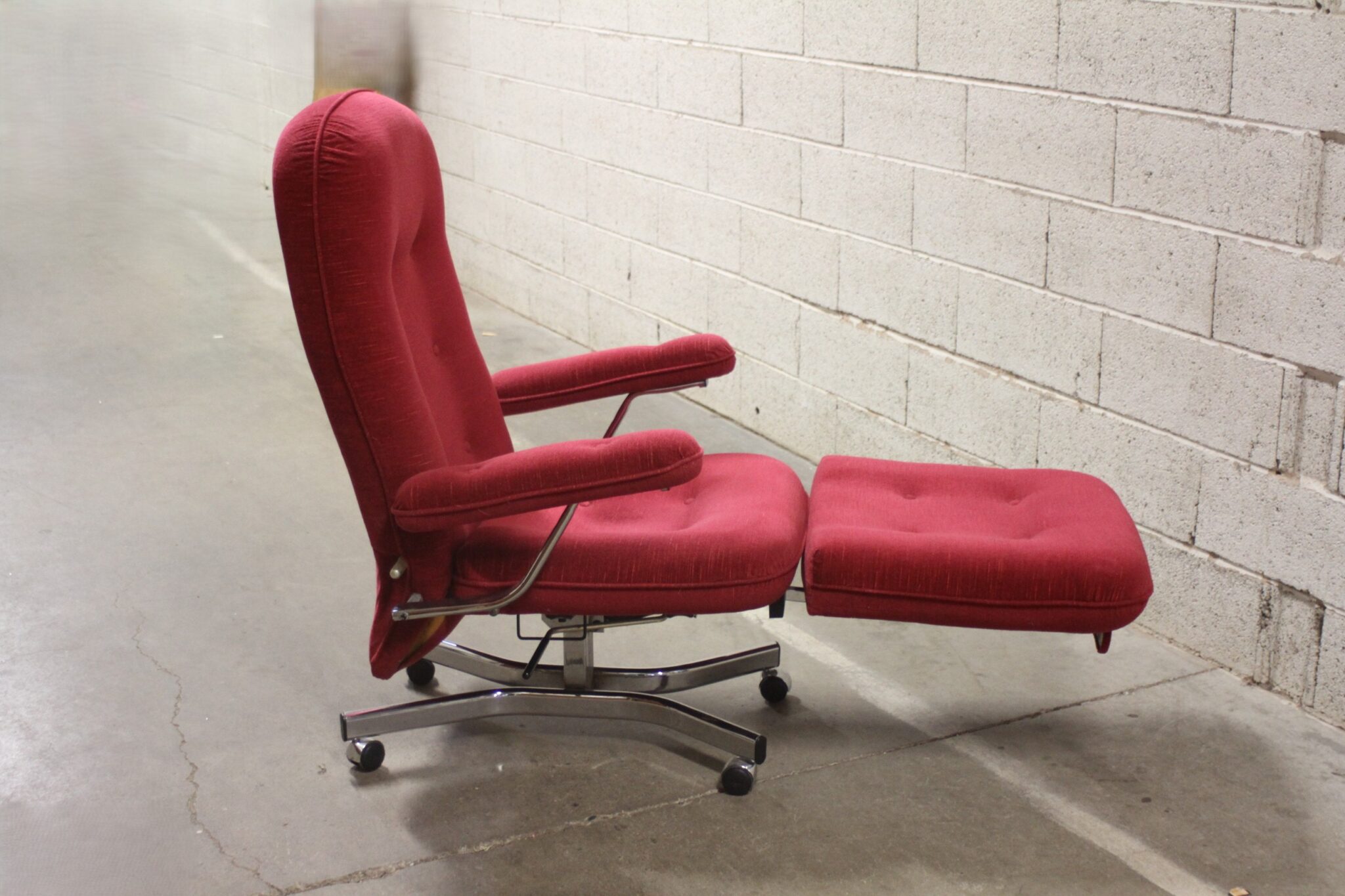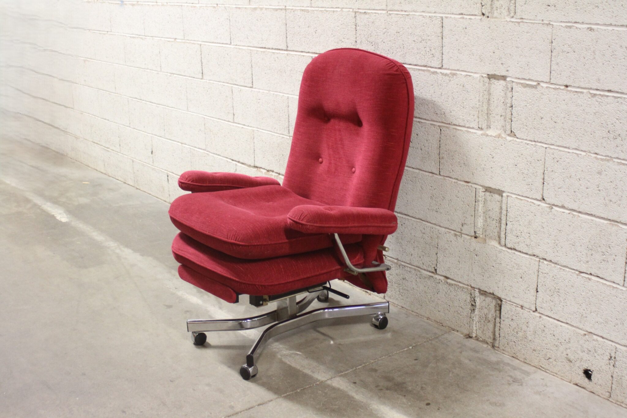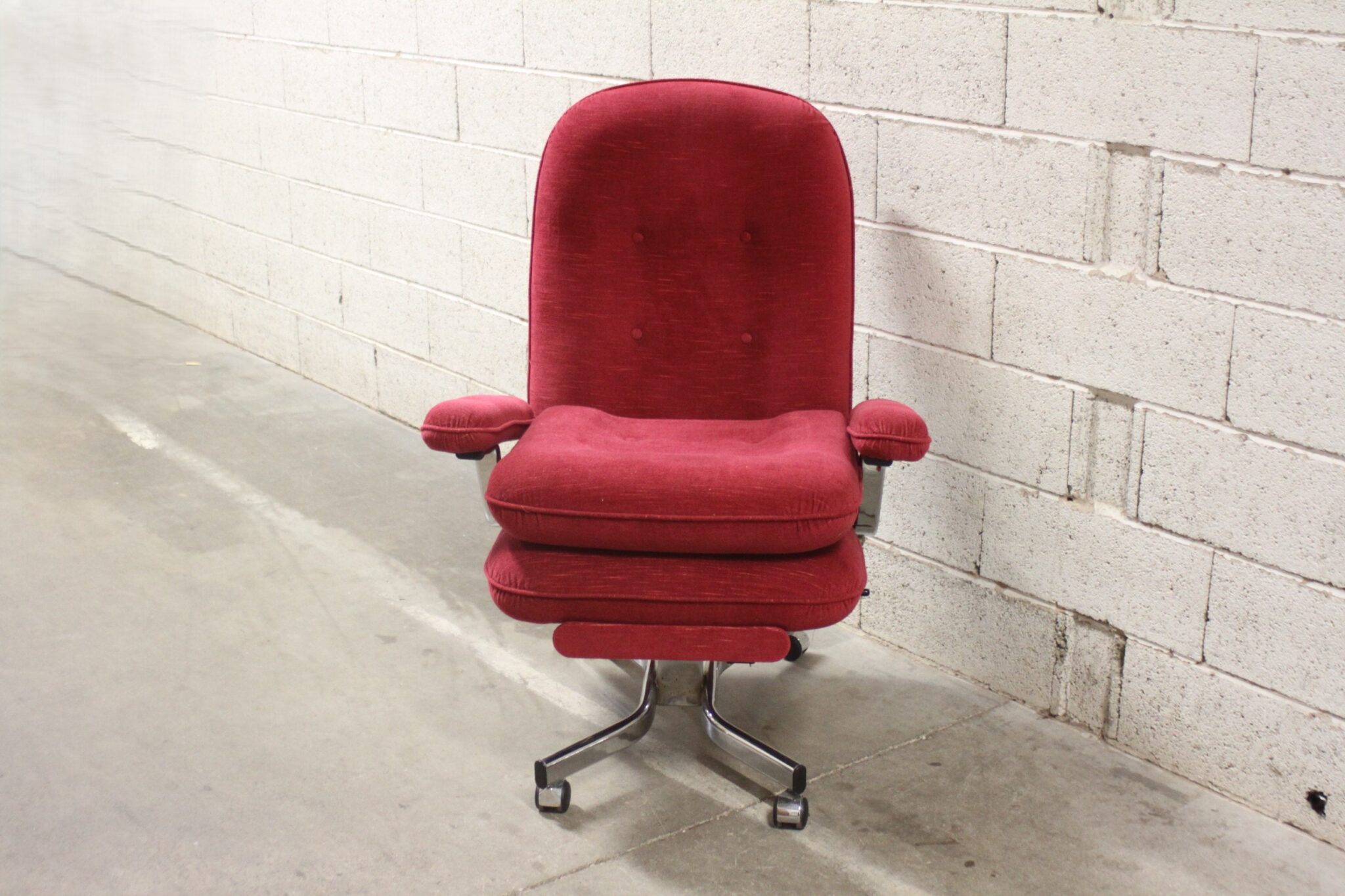 Fauteuil relax vintage sur roulettes avec assise en tissu velours rouge.