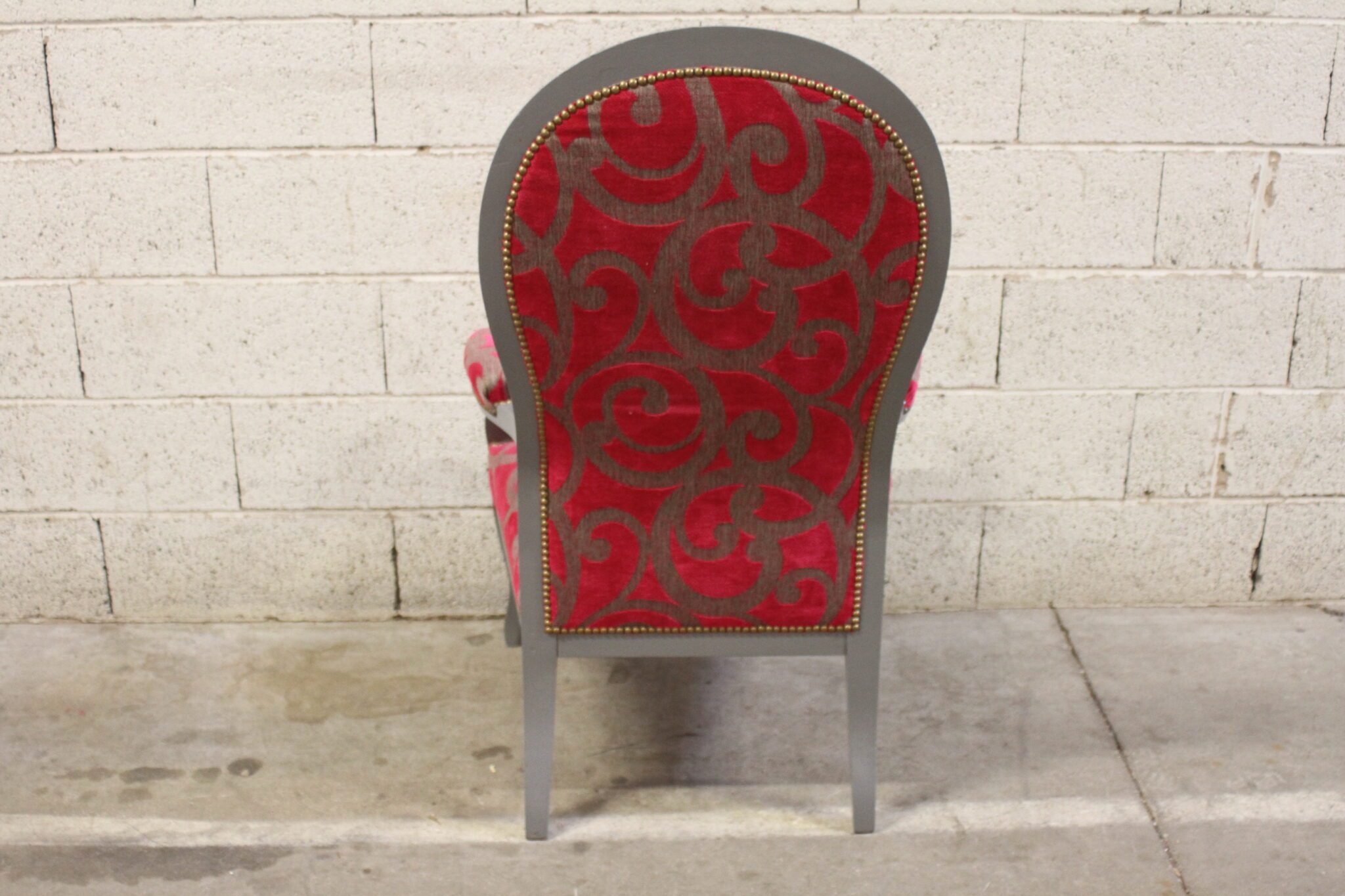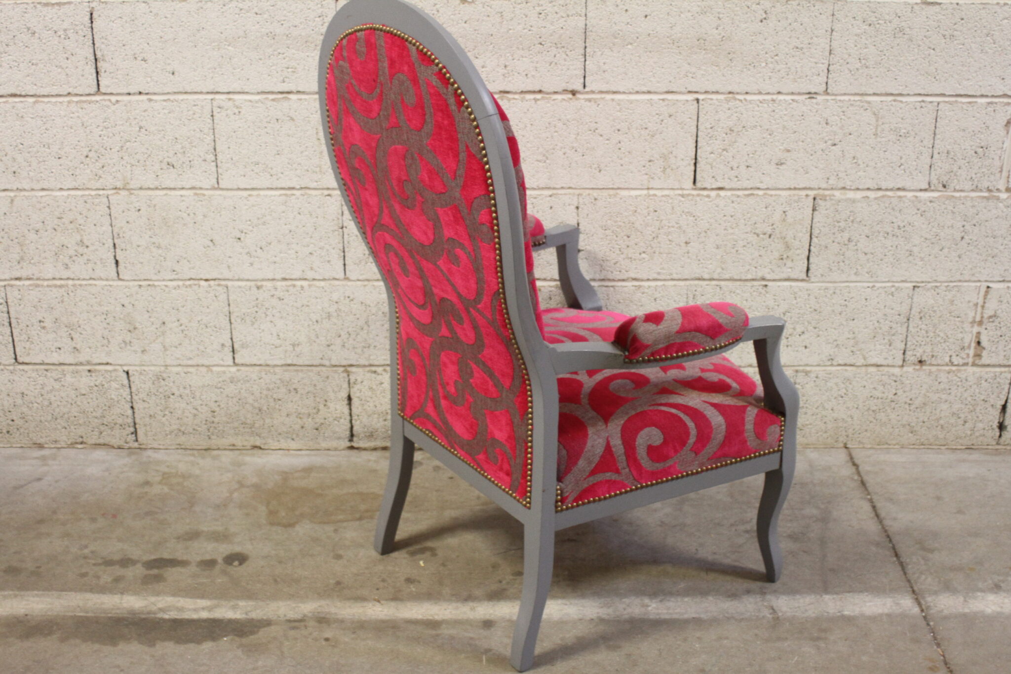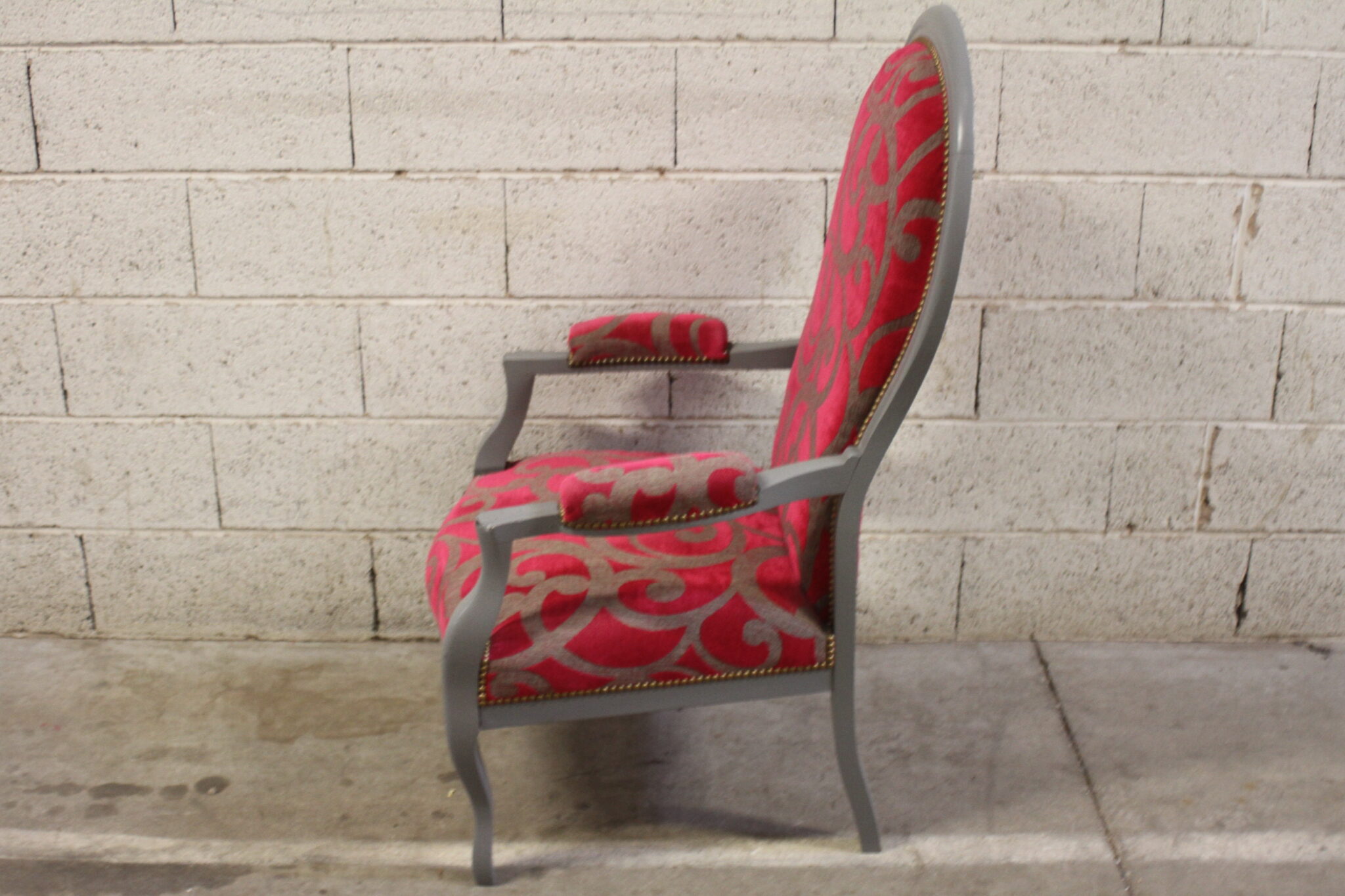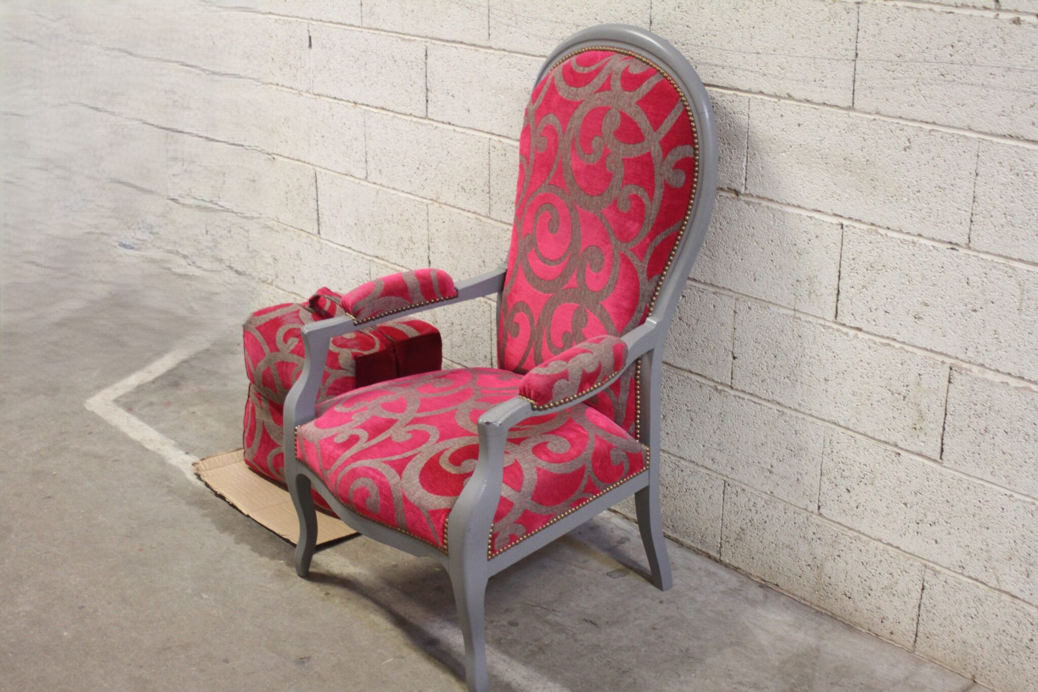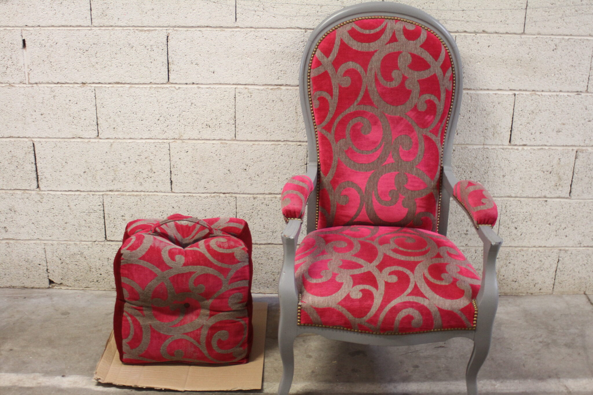 Fauteuil en bois gris avec beau revêtement rose et pouf avec poignée.