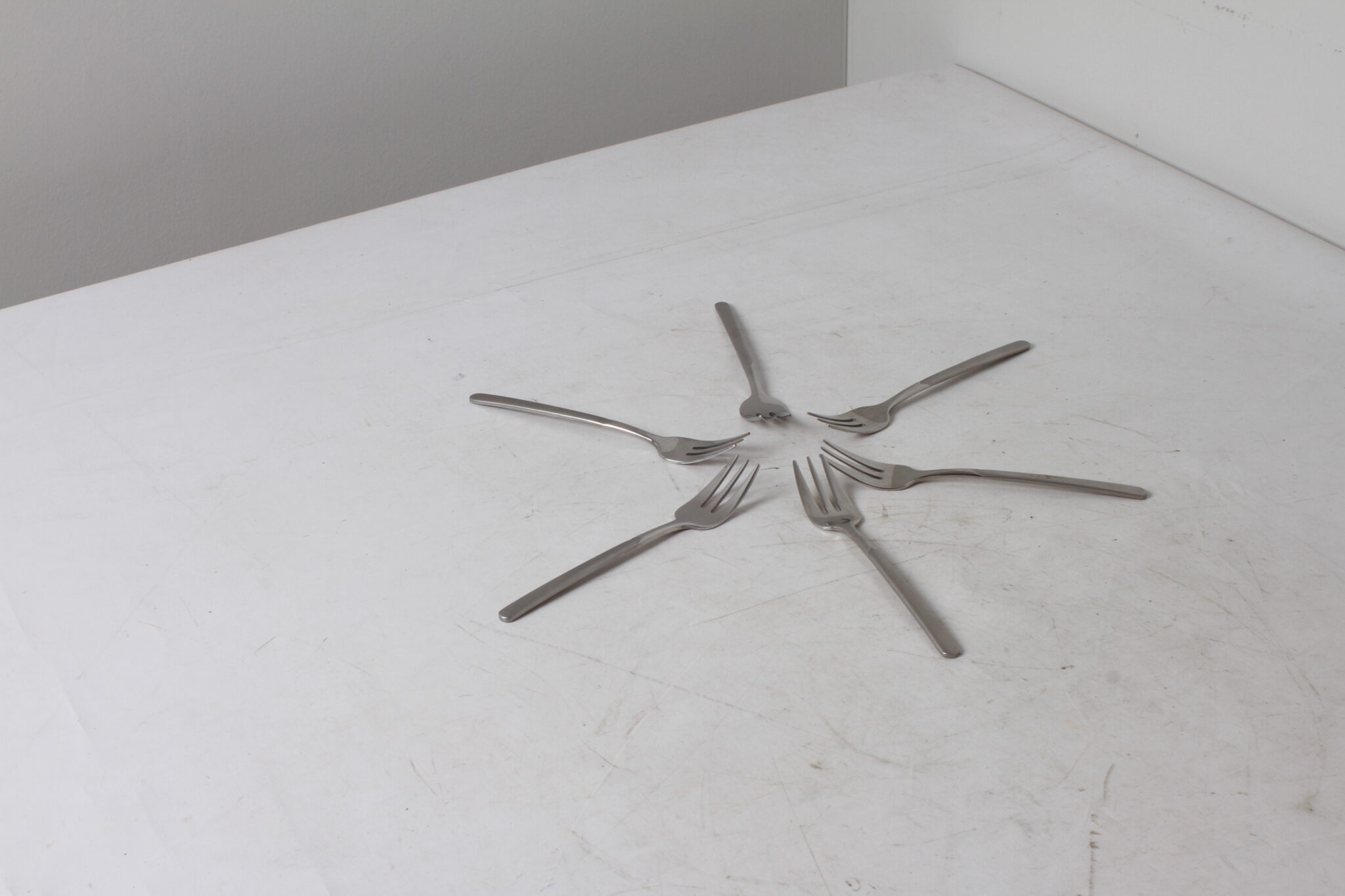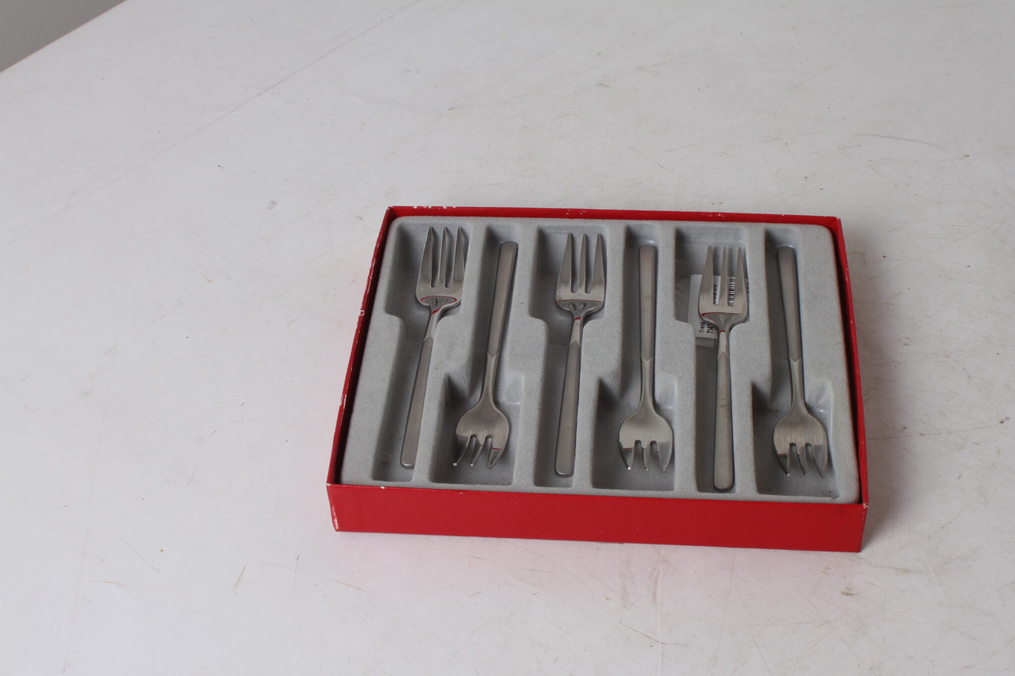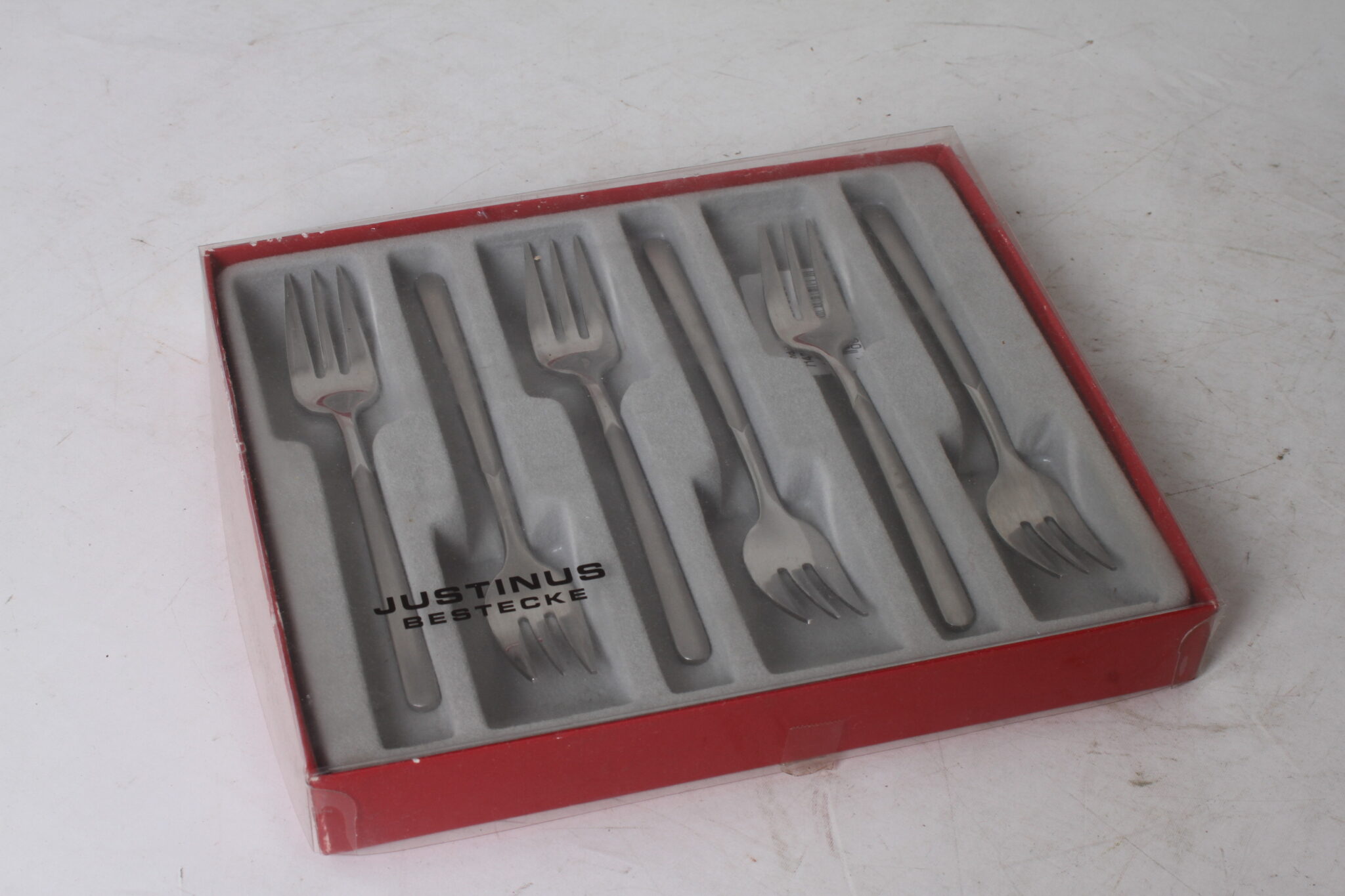Boite de 6 fourchettes à dessert de la marque Justinus Bestecke, en inox 18/10.