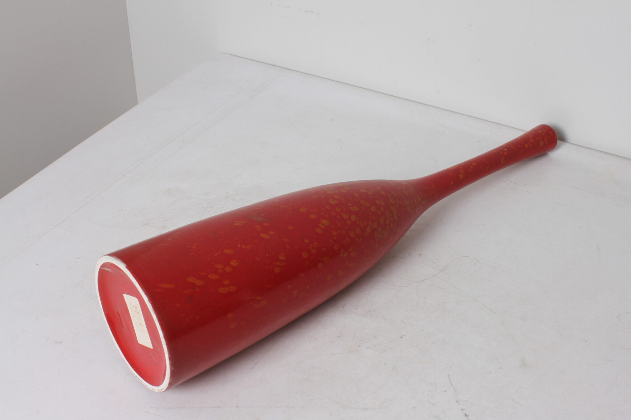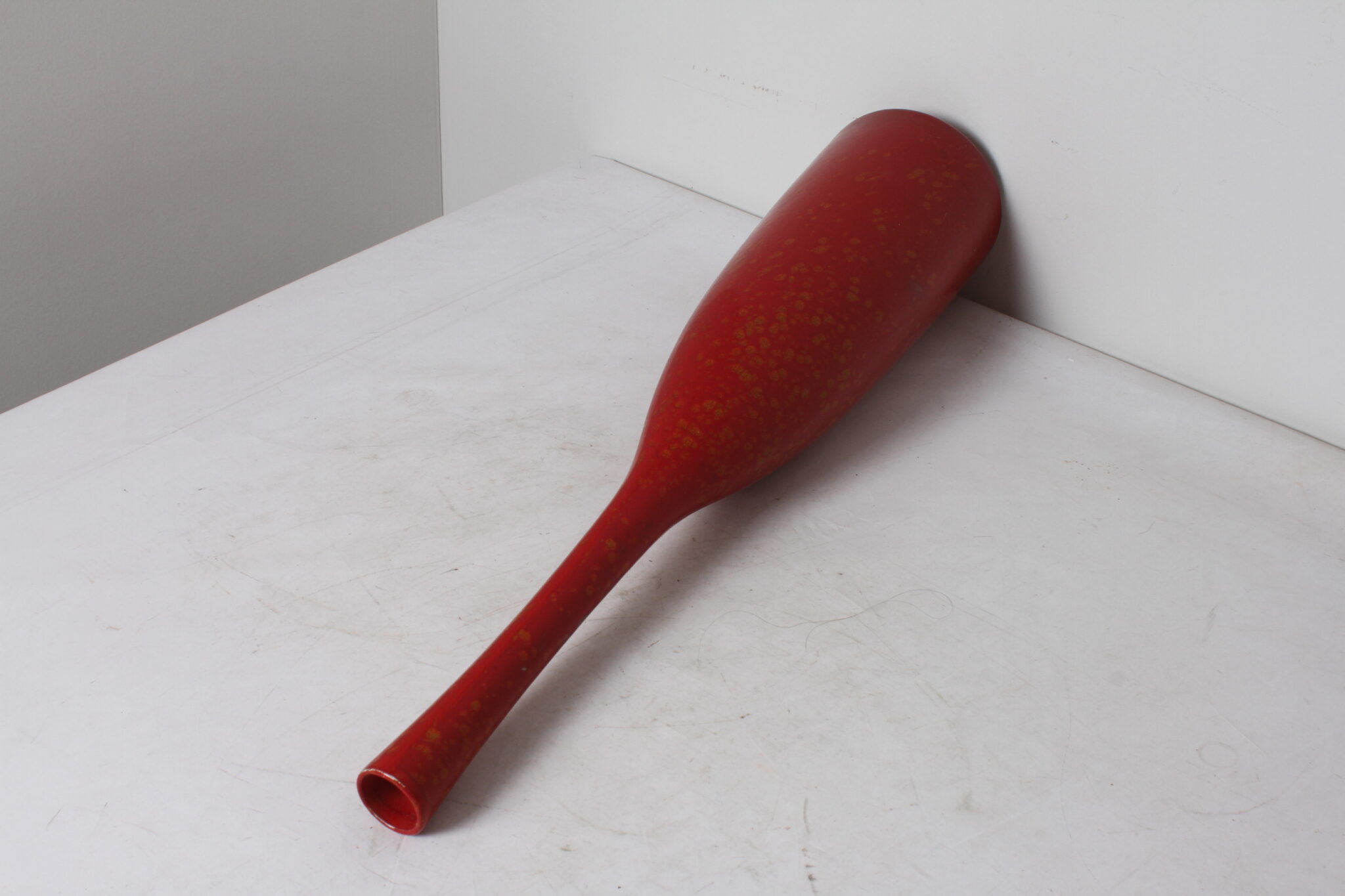 Haut vase soliflore en céramique rouge mouchetée jaune, design contemporain.