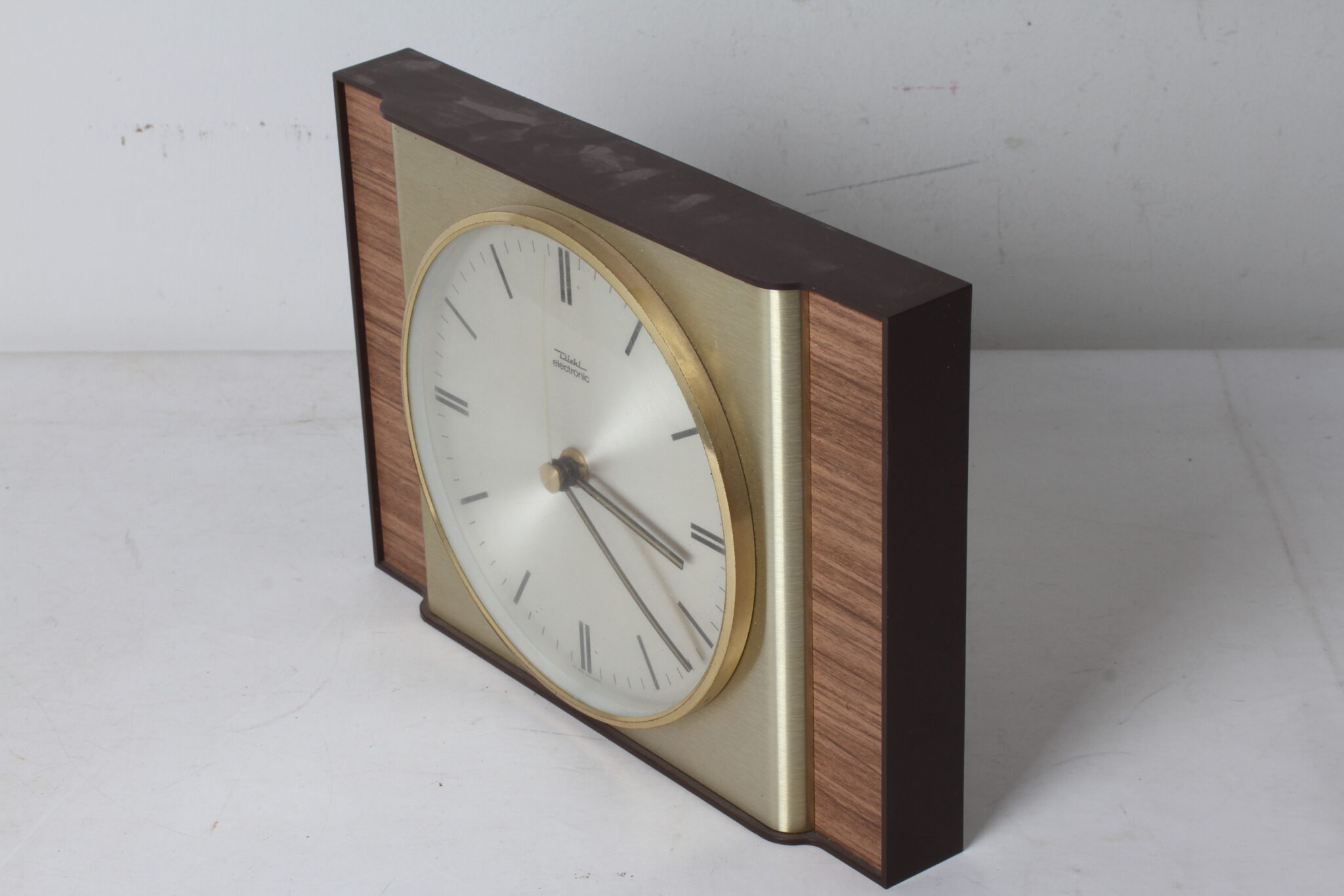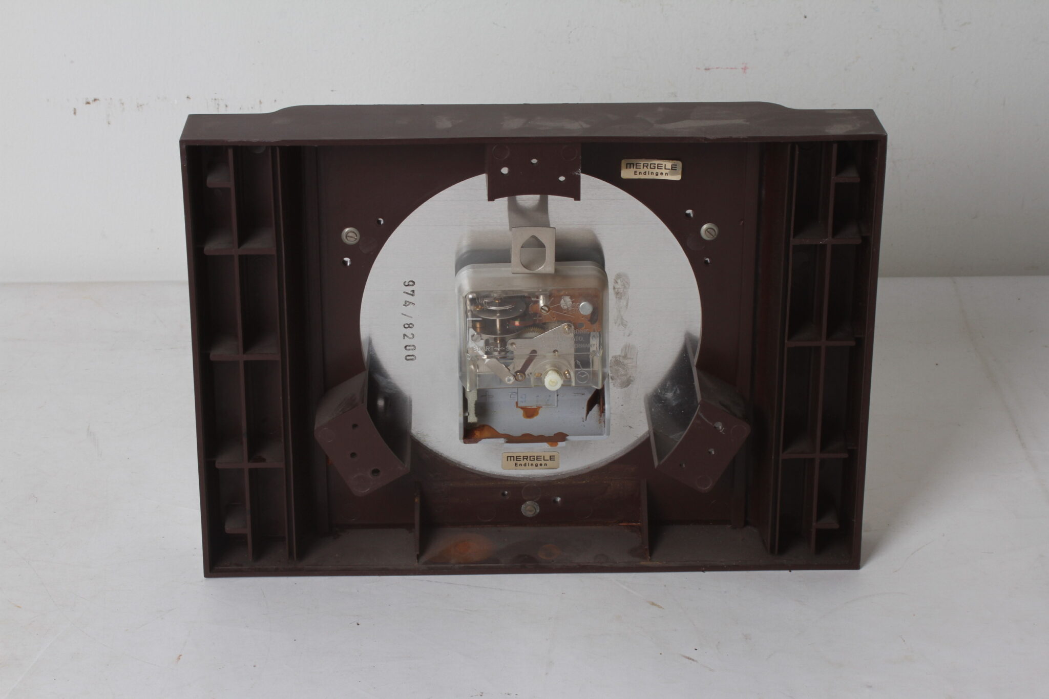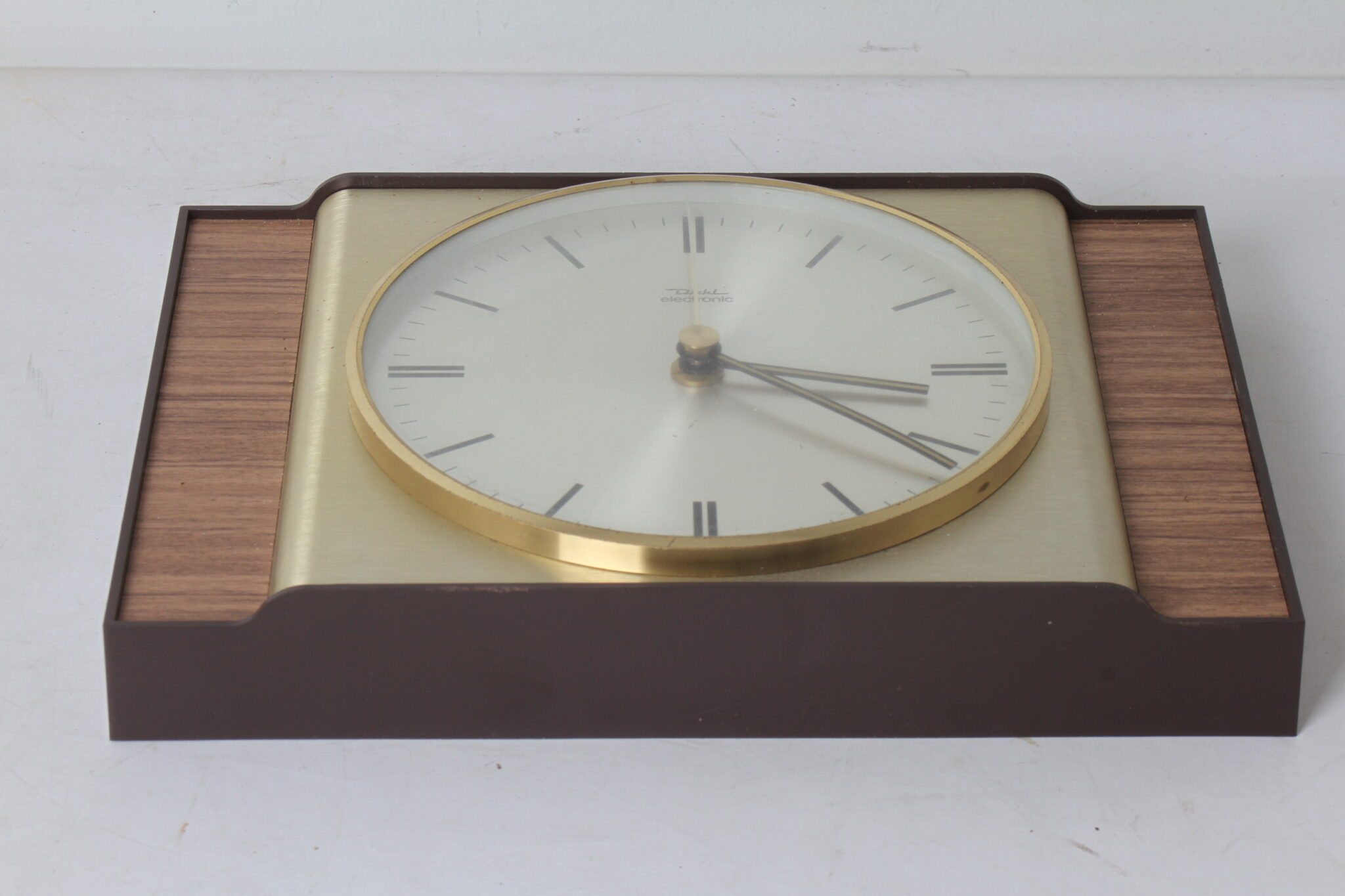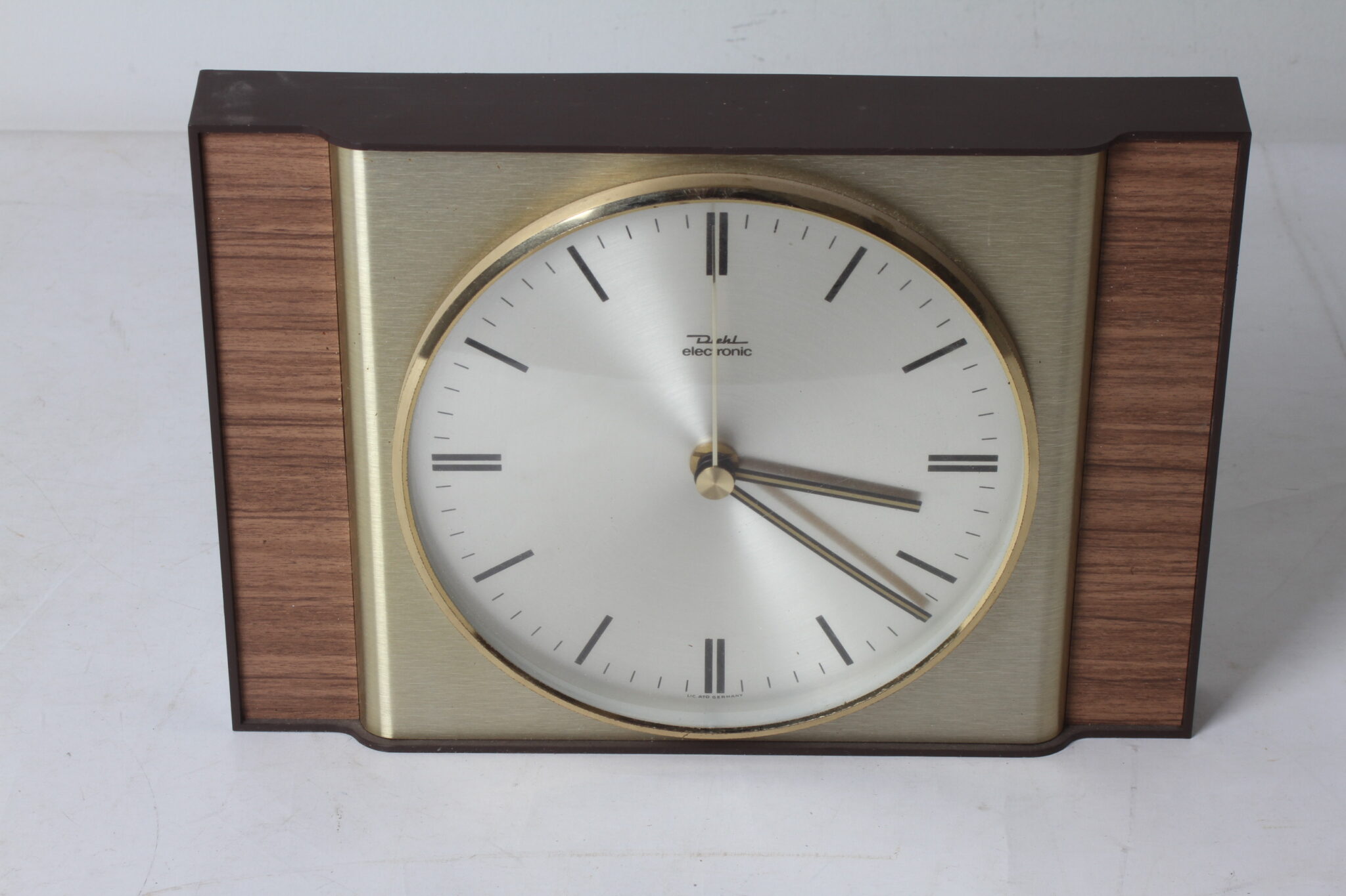 Horloge en plastique brun et métal doré qui fonctionne avec 1 pile LR14 (non fournie).