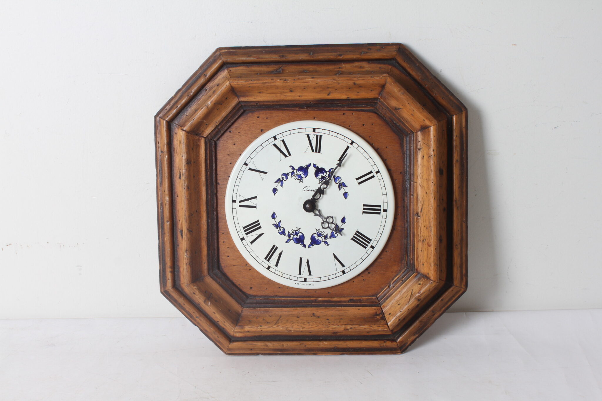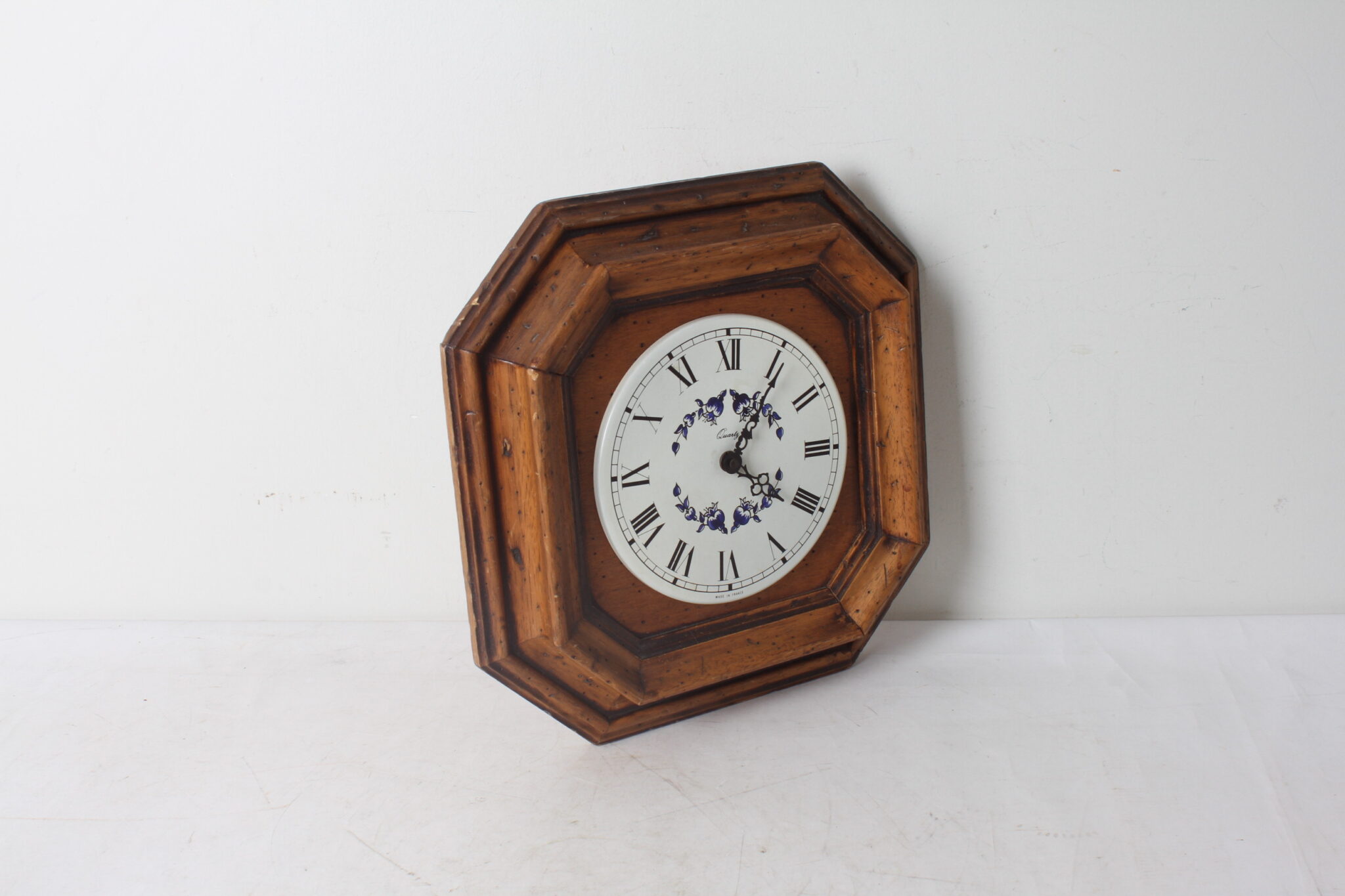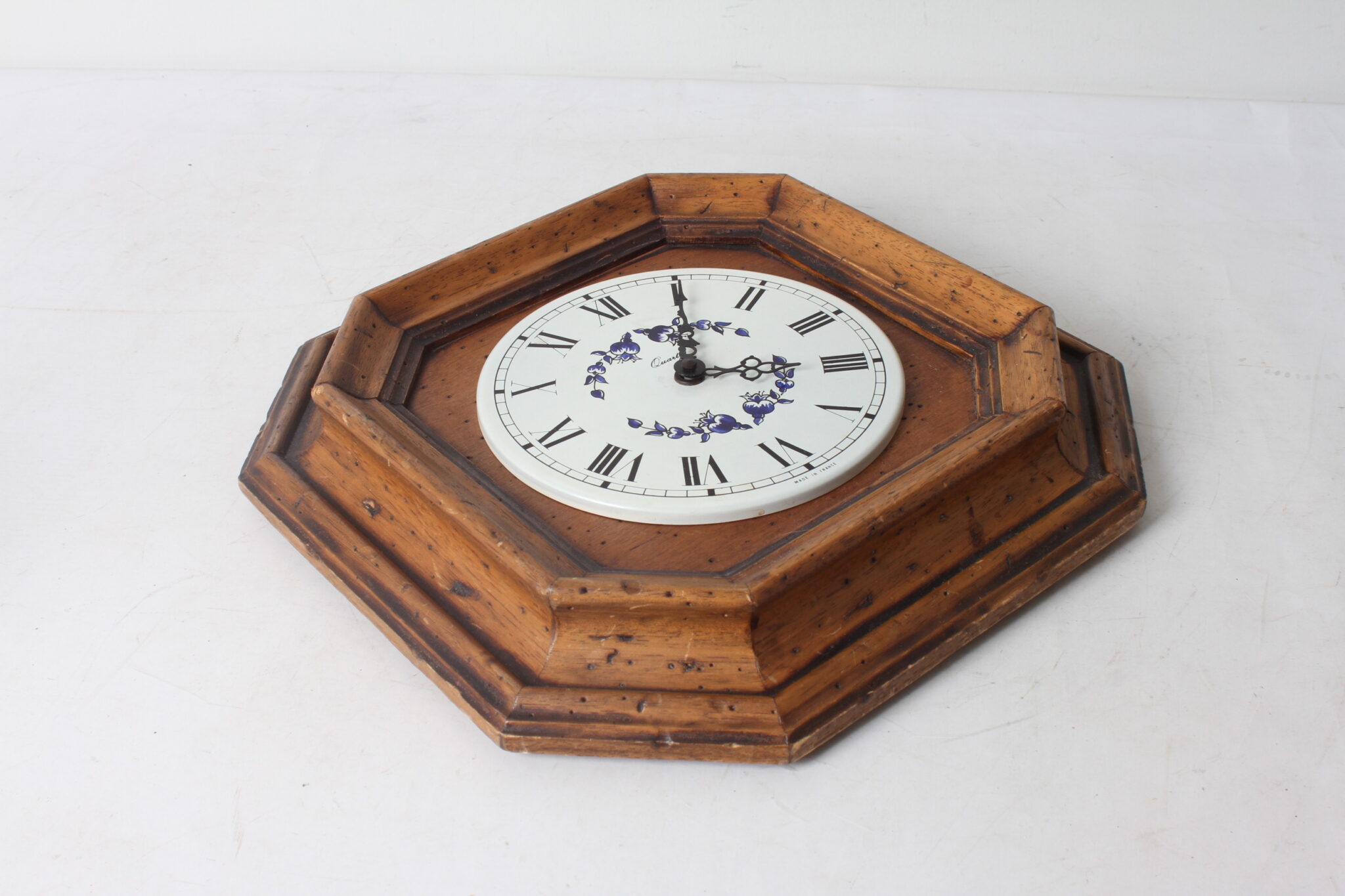 Horloge murale en bois avec cadran métallique à décor floral, made in France.