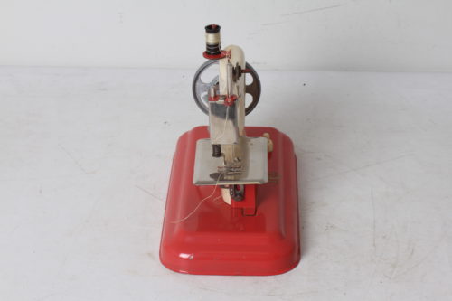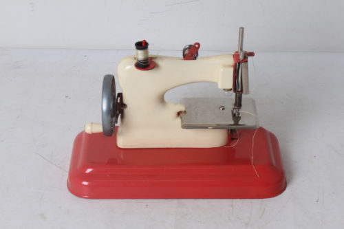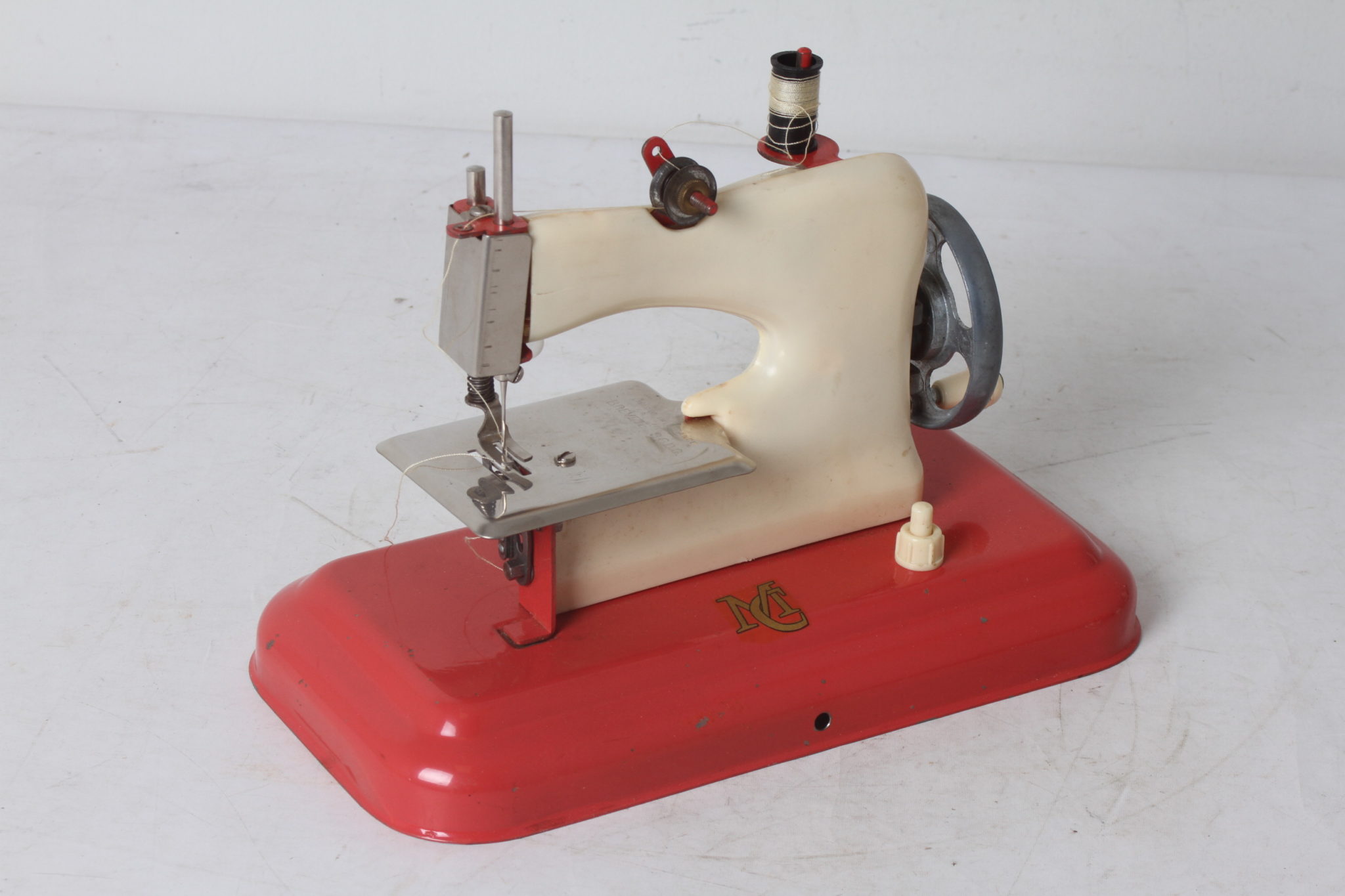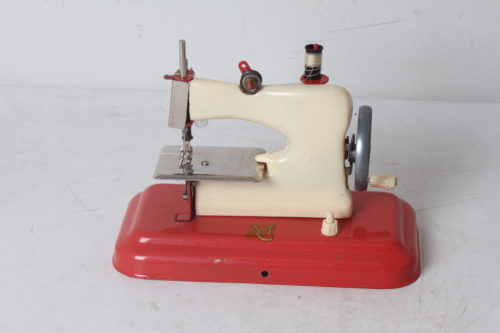 Jouet ancien, machine à coudre en tôle de la marque MC.