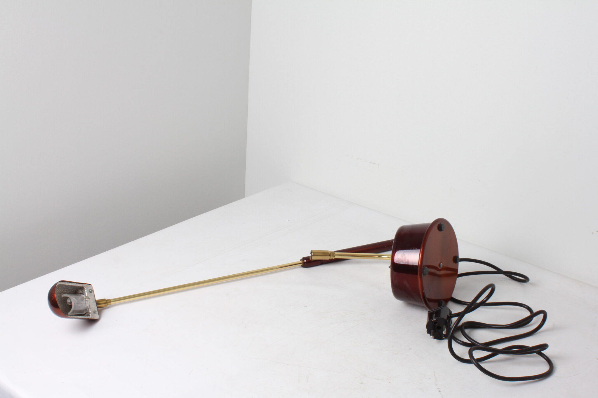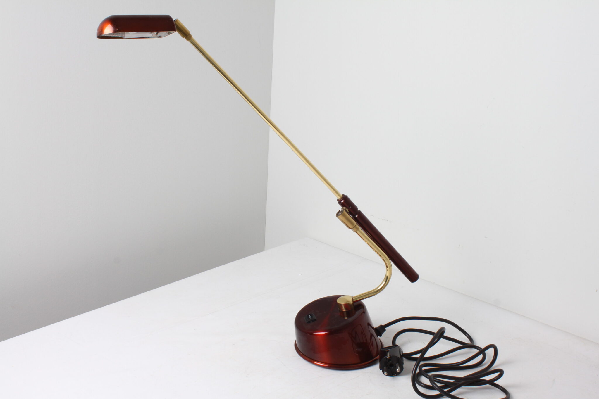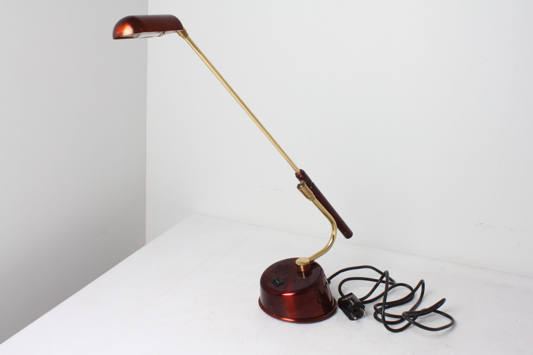 Lampe sur socle rond avec interrupteur 2 niveaux d’intensité et bras articulé.