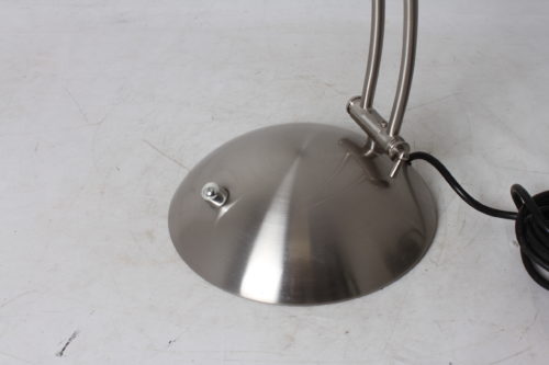 Lampe sur socle rond, en métal brossé avec réglage de l’intensité lumineuse par bouton.