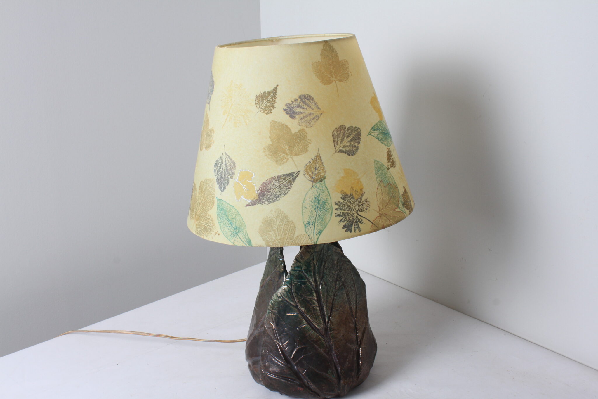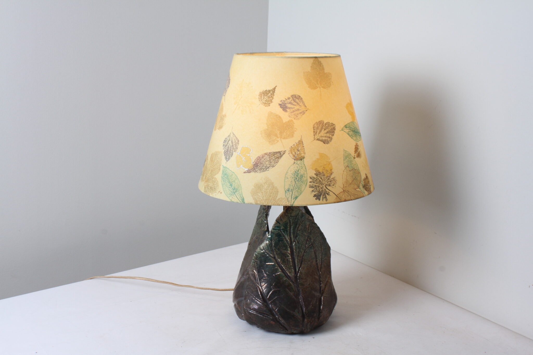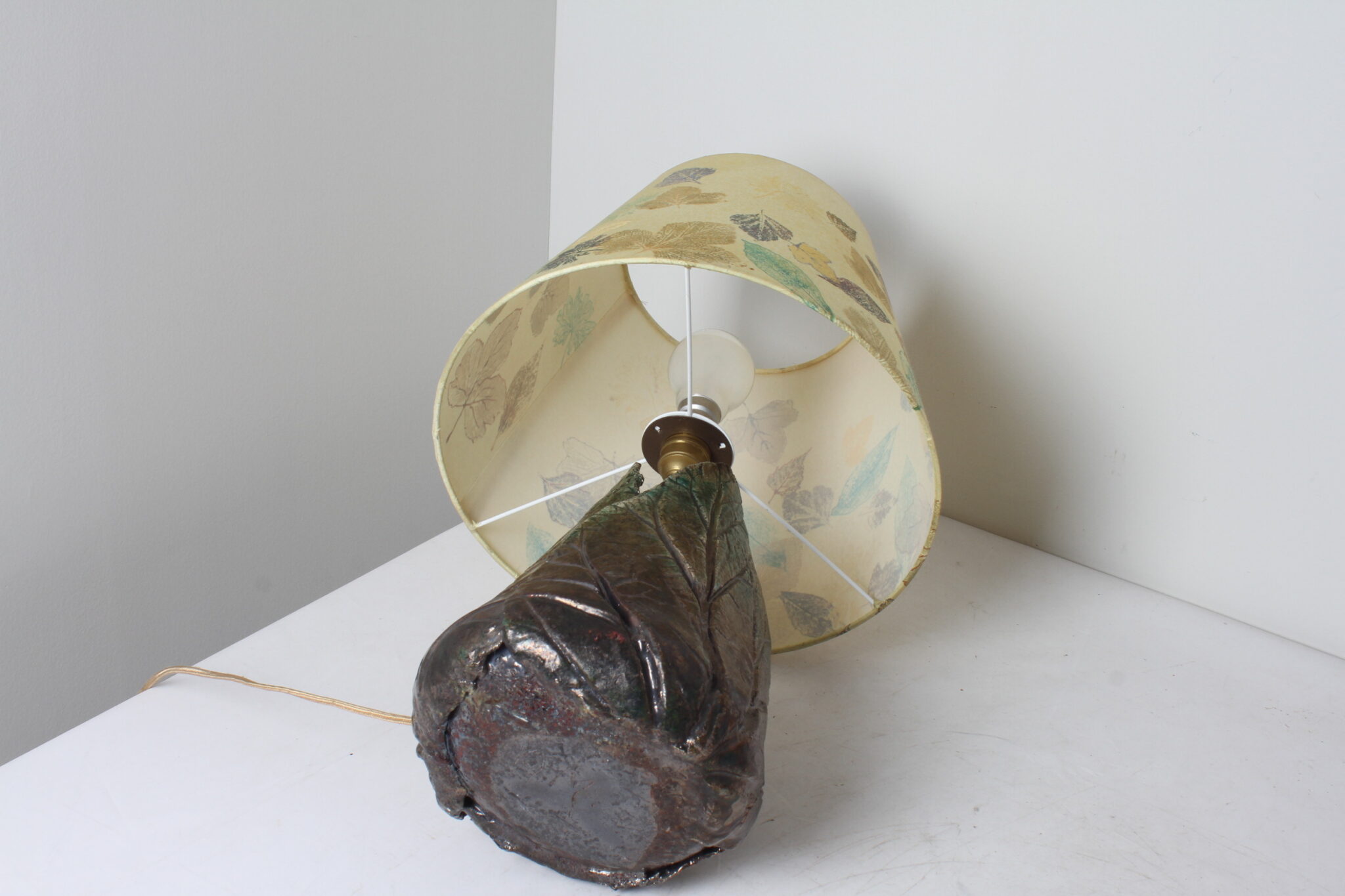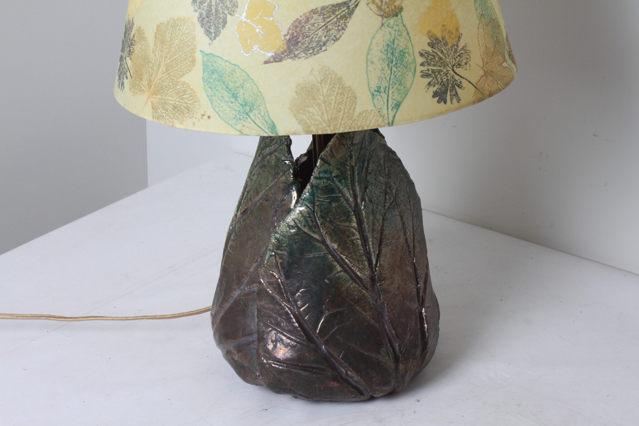 Lampe de table sur pied brutaliste feuillage en poterie vernissée.