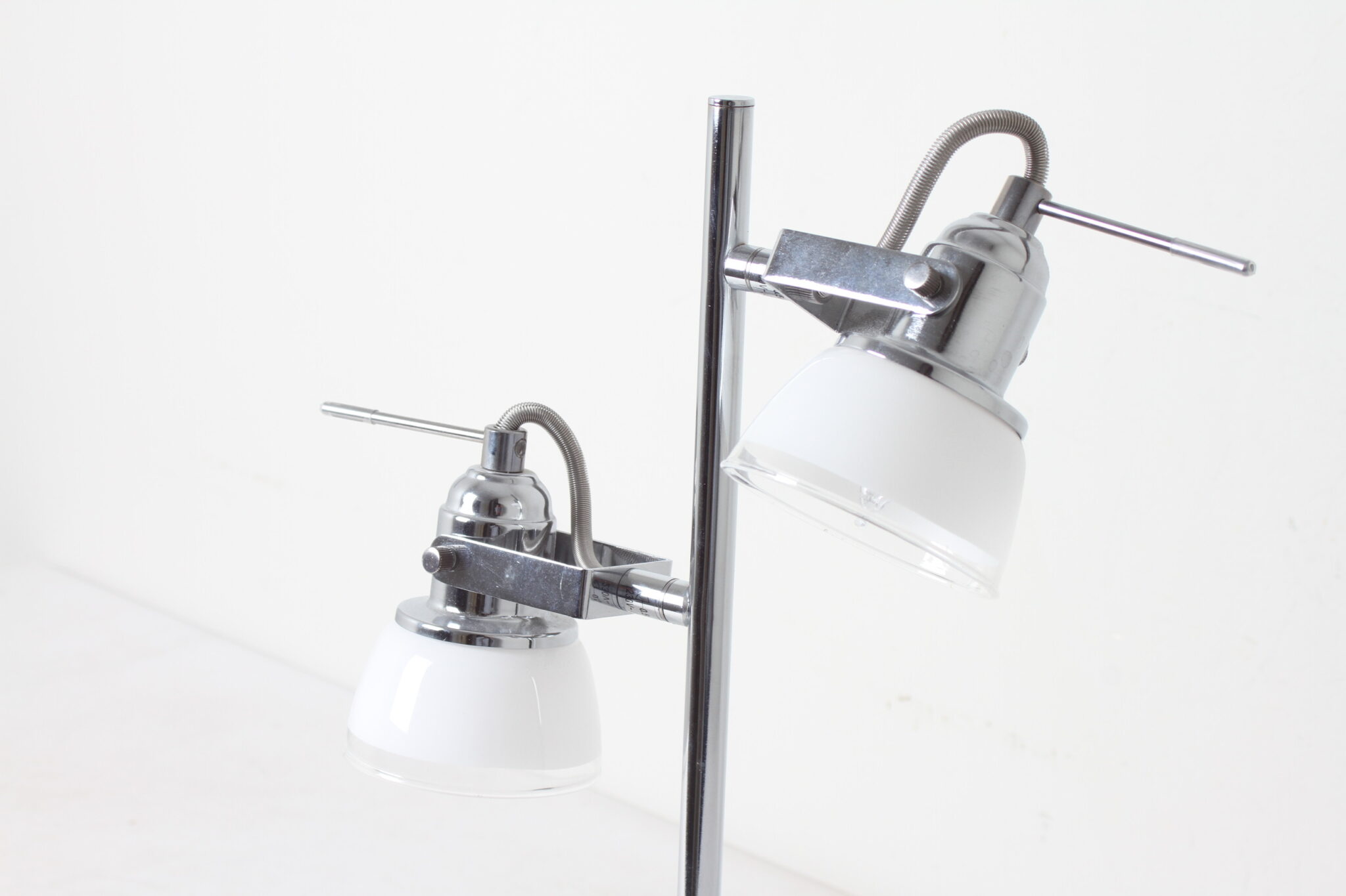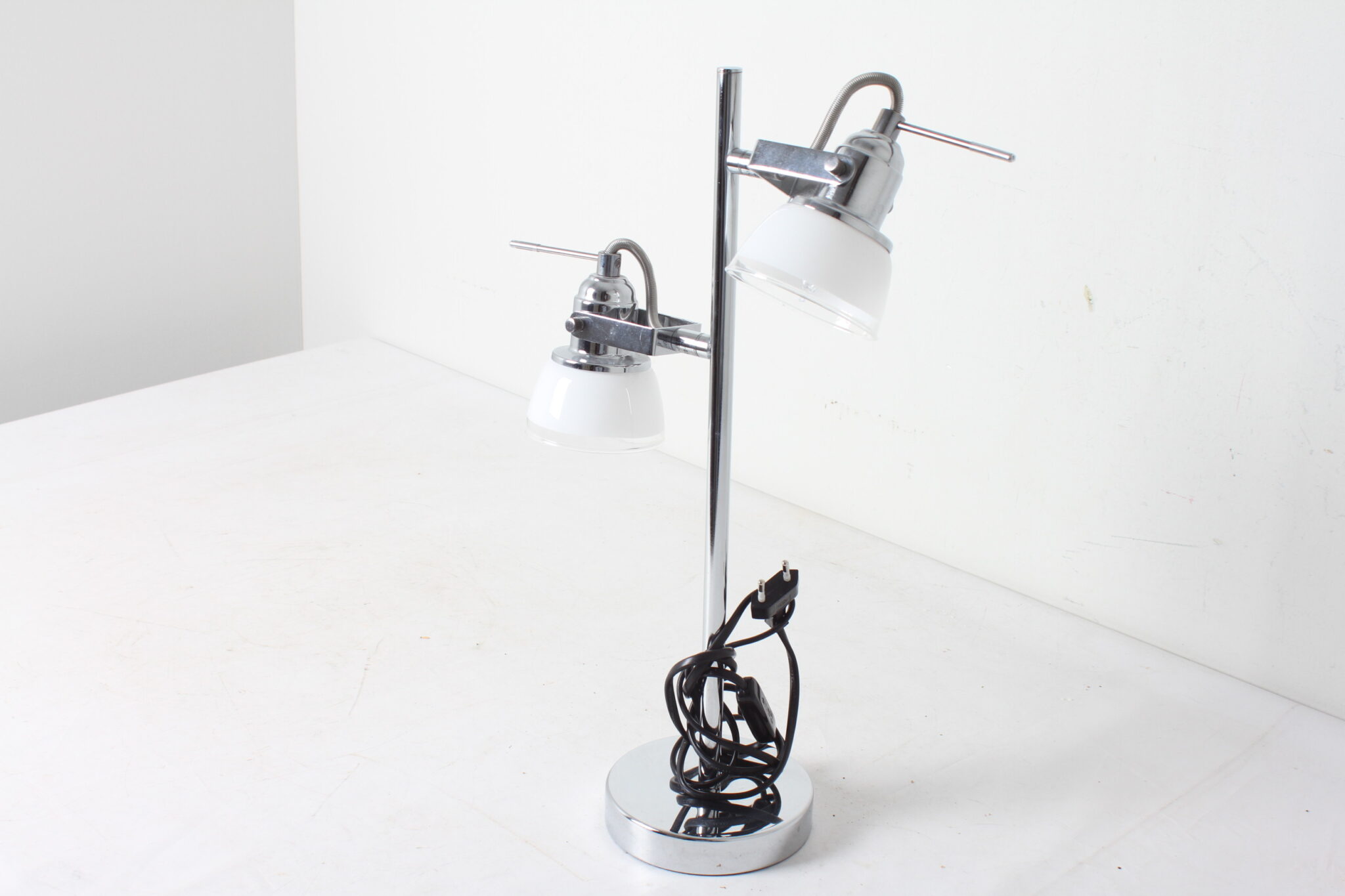 Elégante lampe de table en métal chromé à 2 spots en verre.