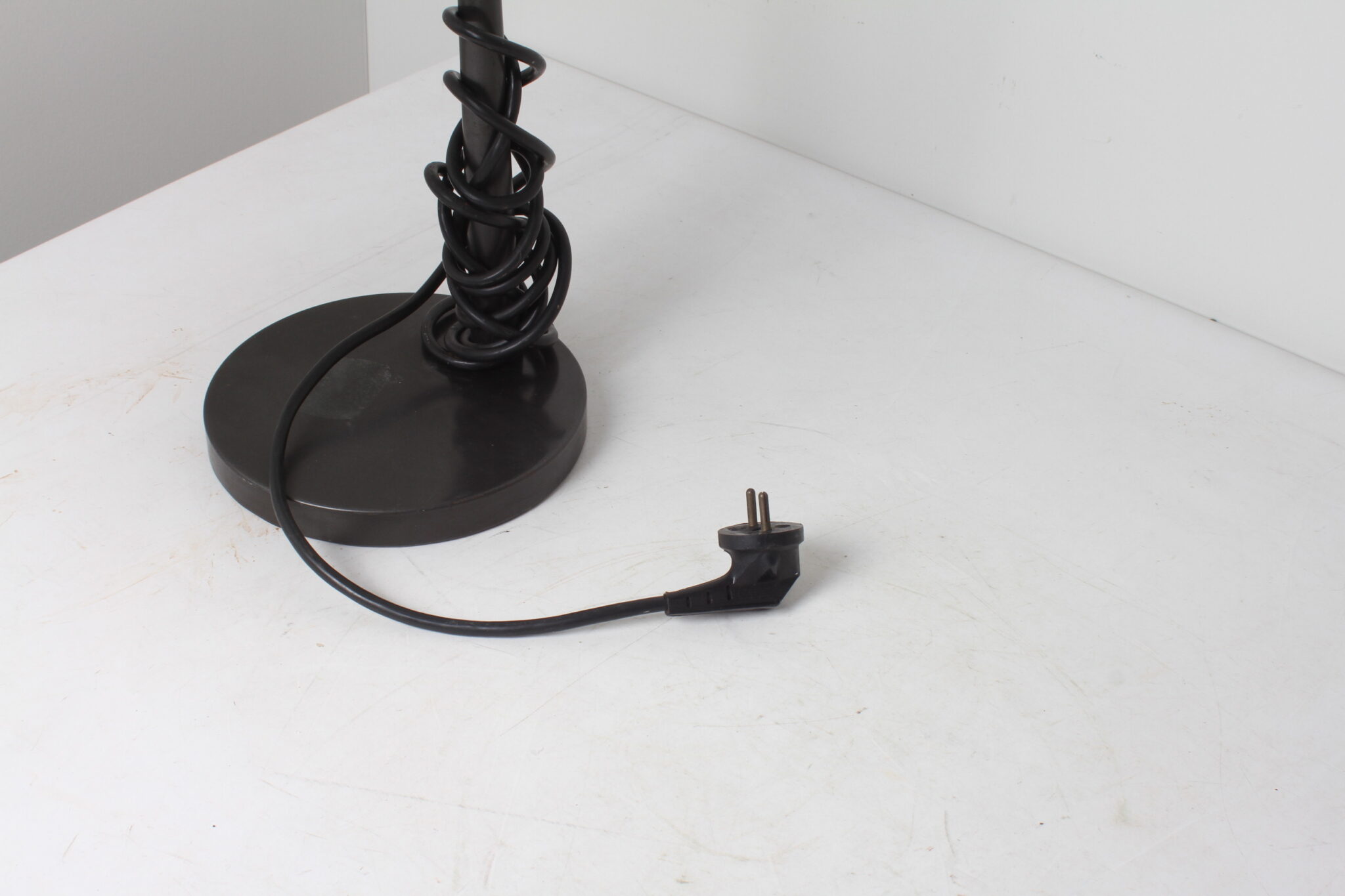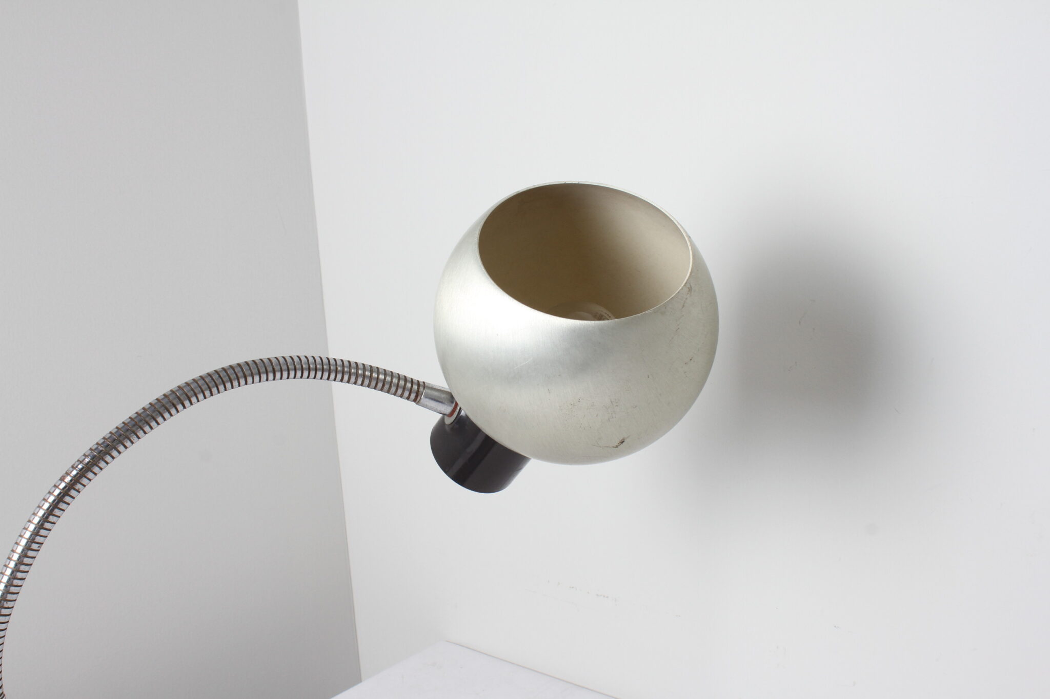 Lampe sur socle rond en métal avec bras flexible et abat-jour en métal brossé.