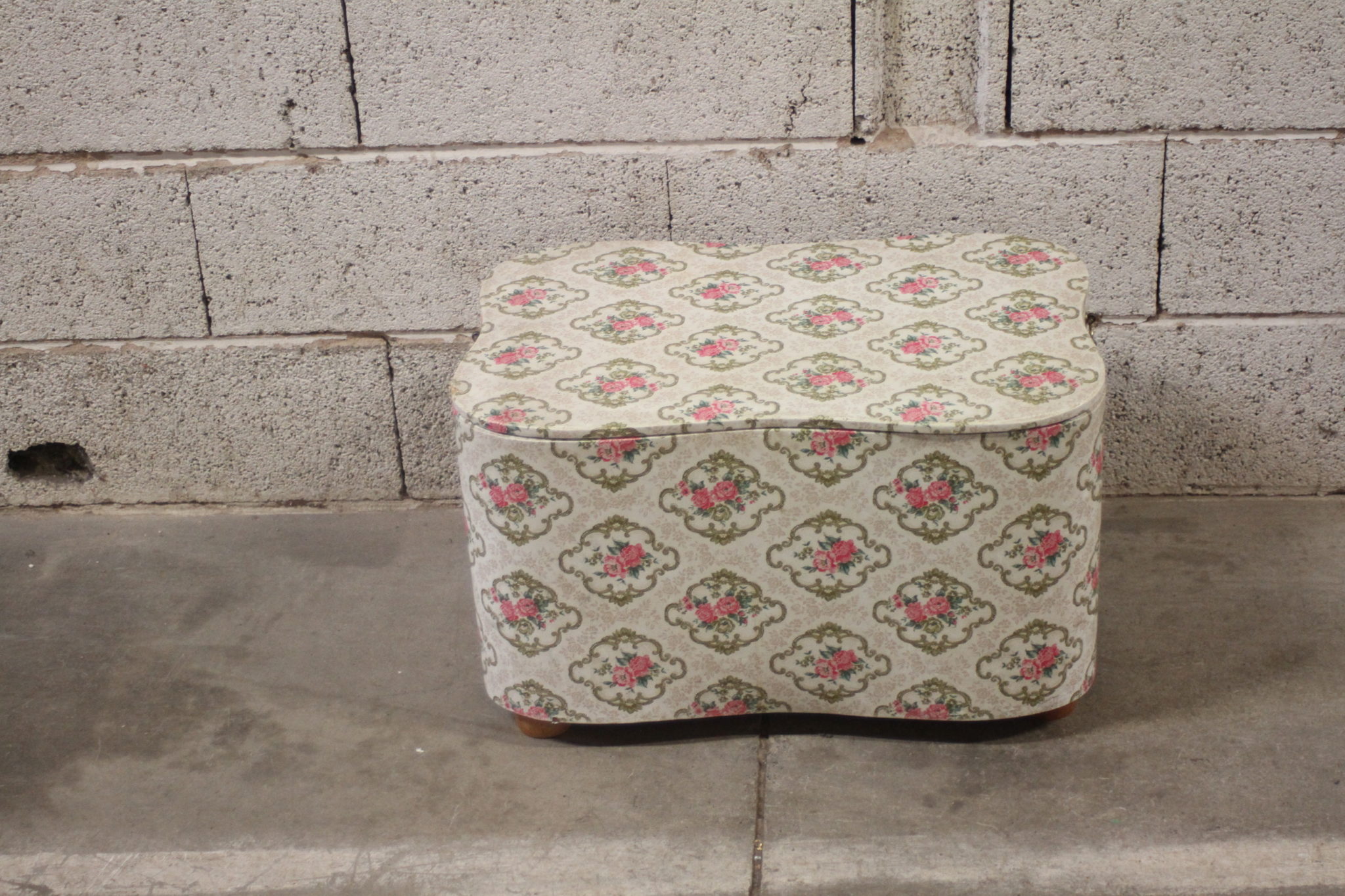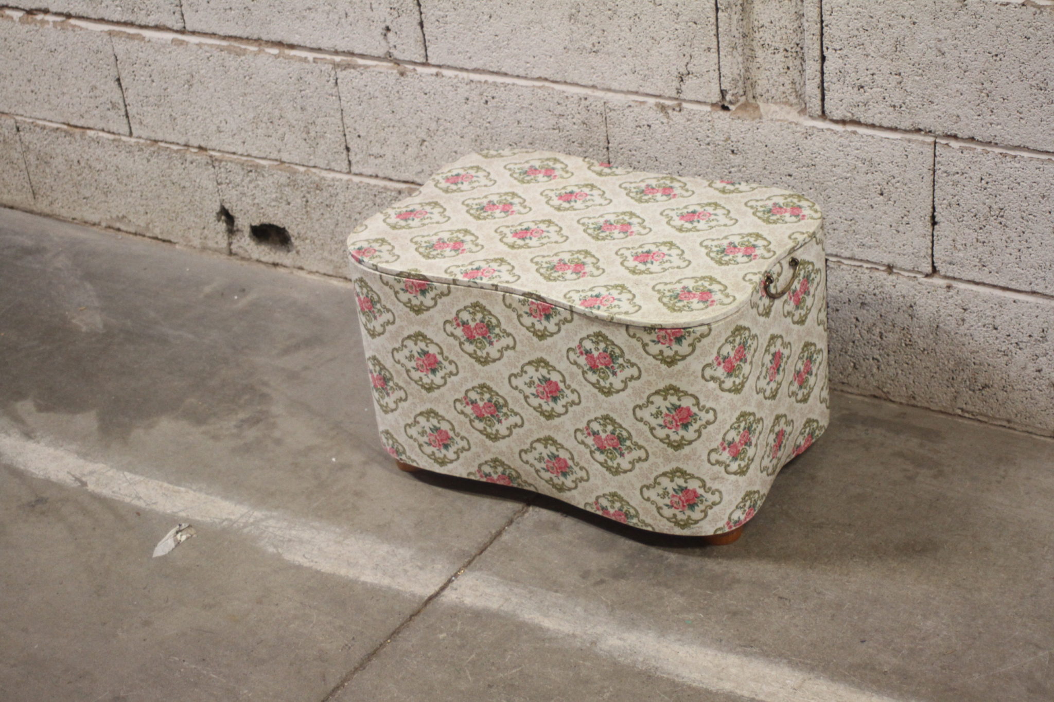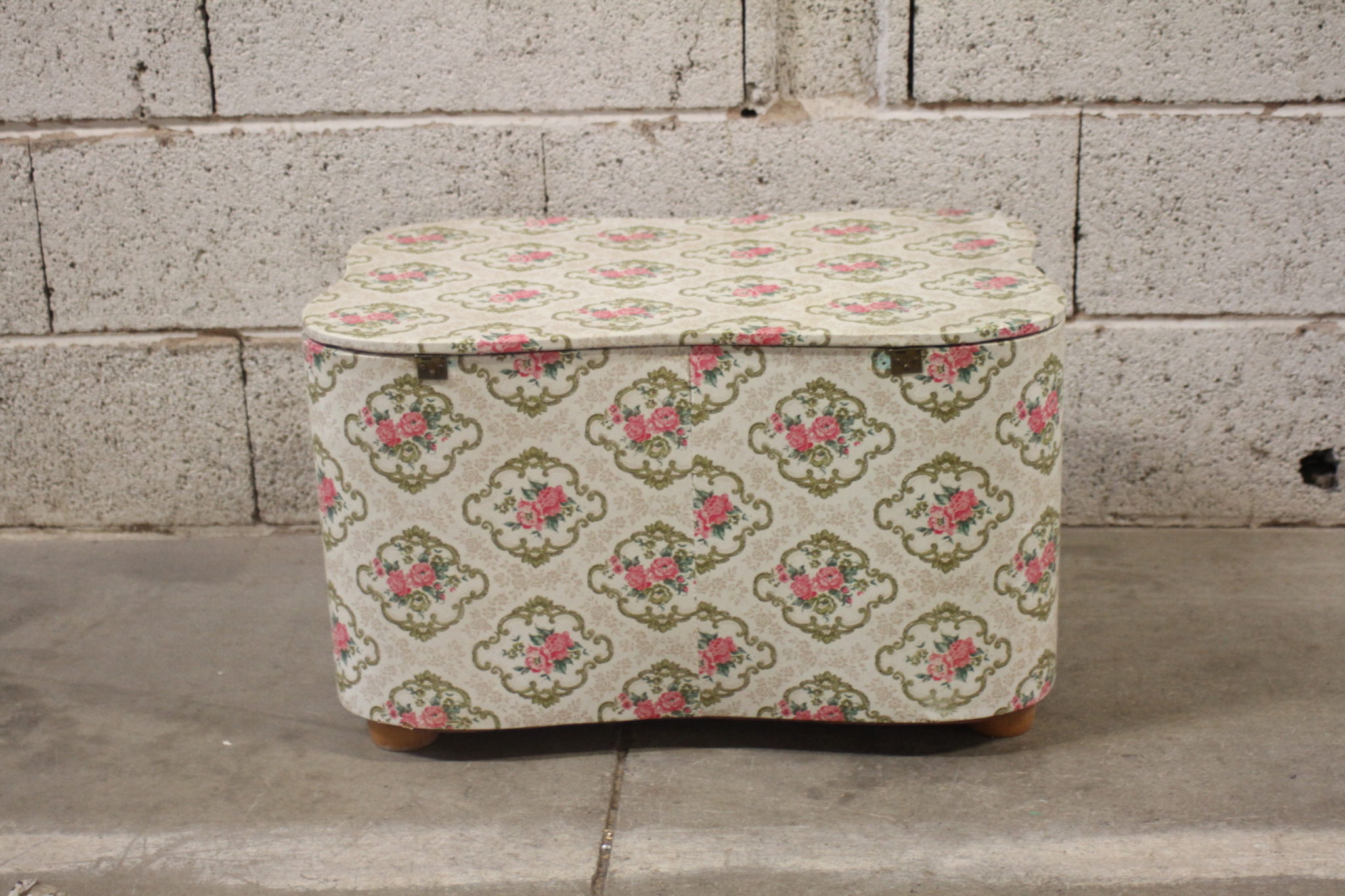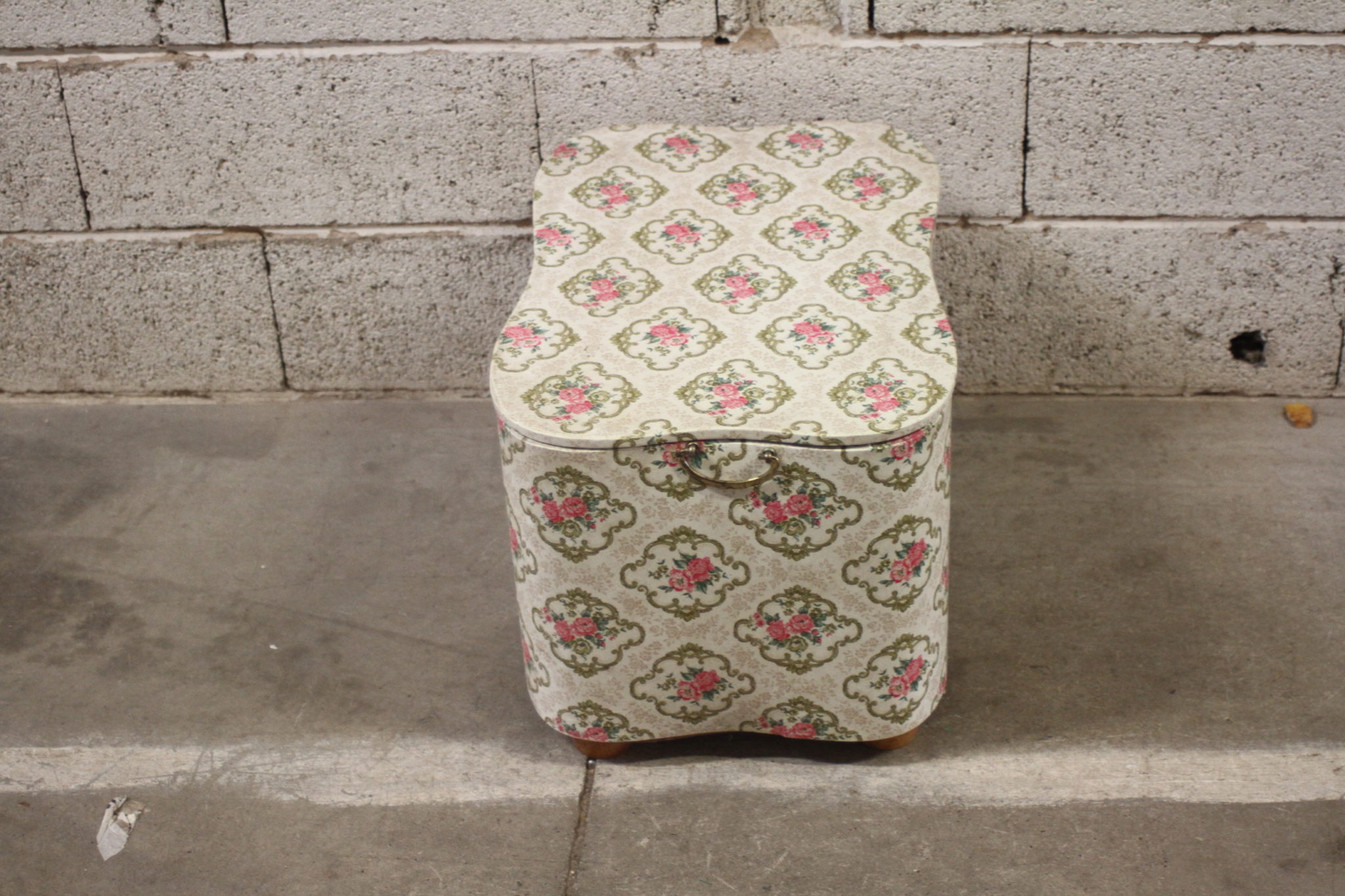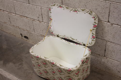 Malle sur petits pieds en bois avec 2 poignées en métal.
