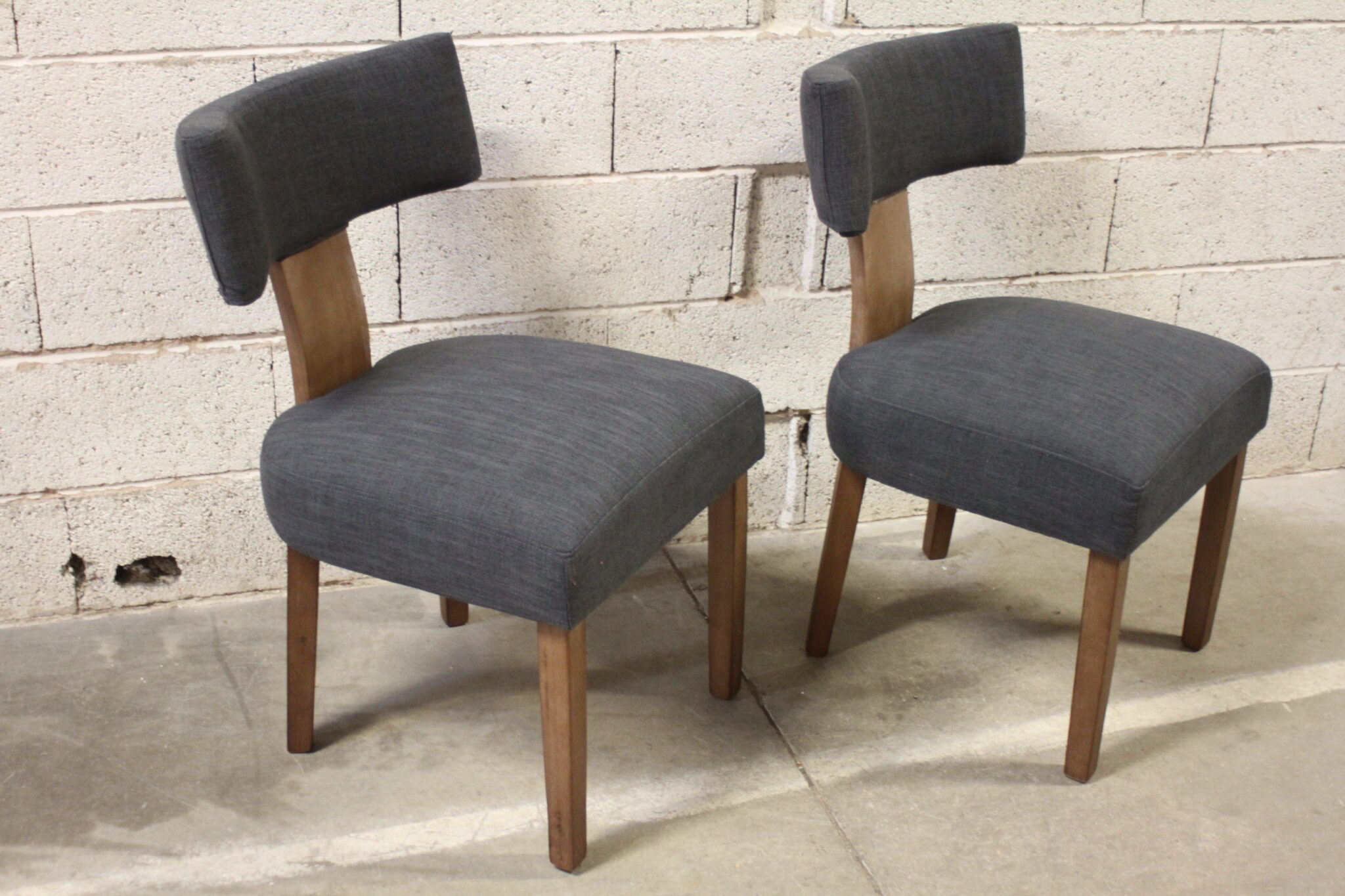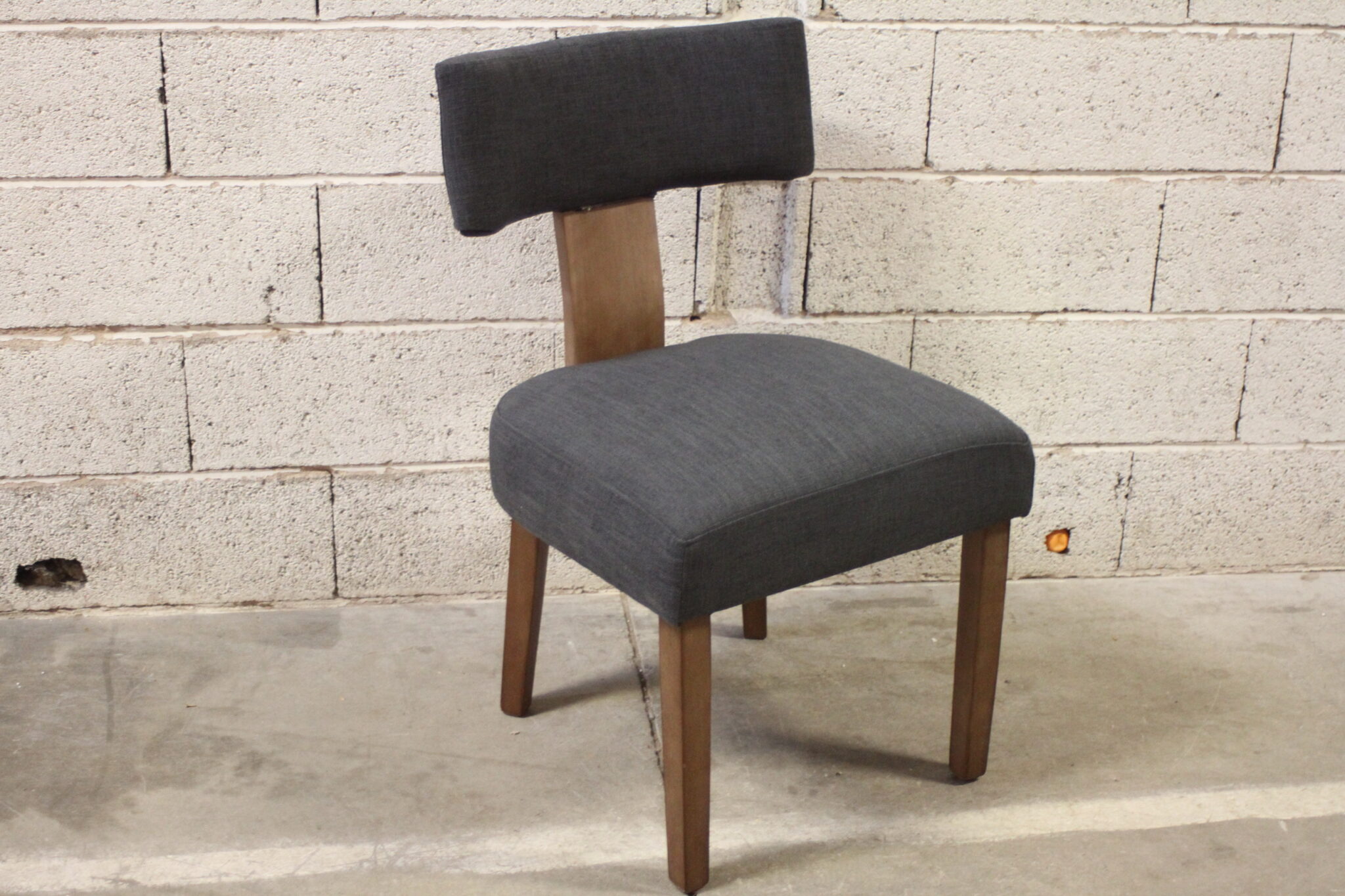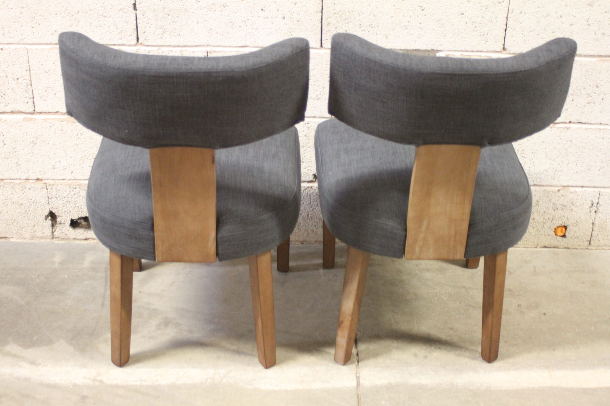 Chaises design au dossier arrondi avec assise mousse et revêtement en tissu gris.