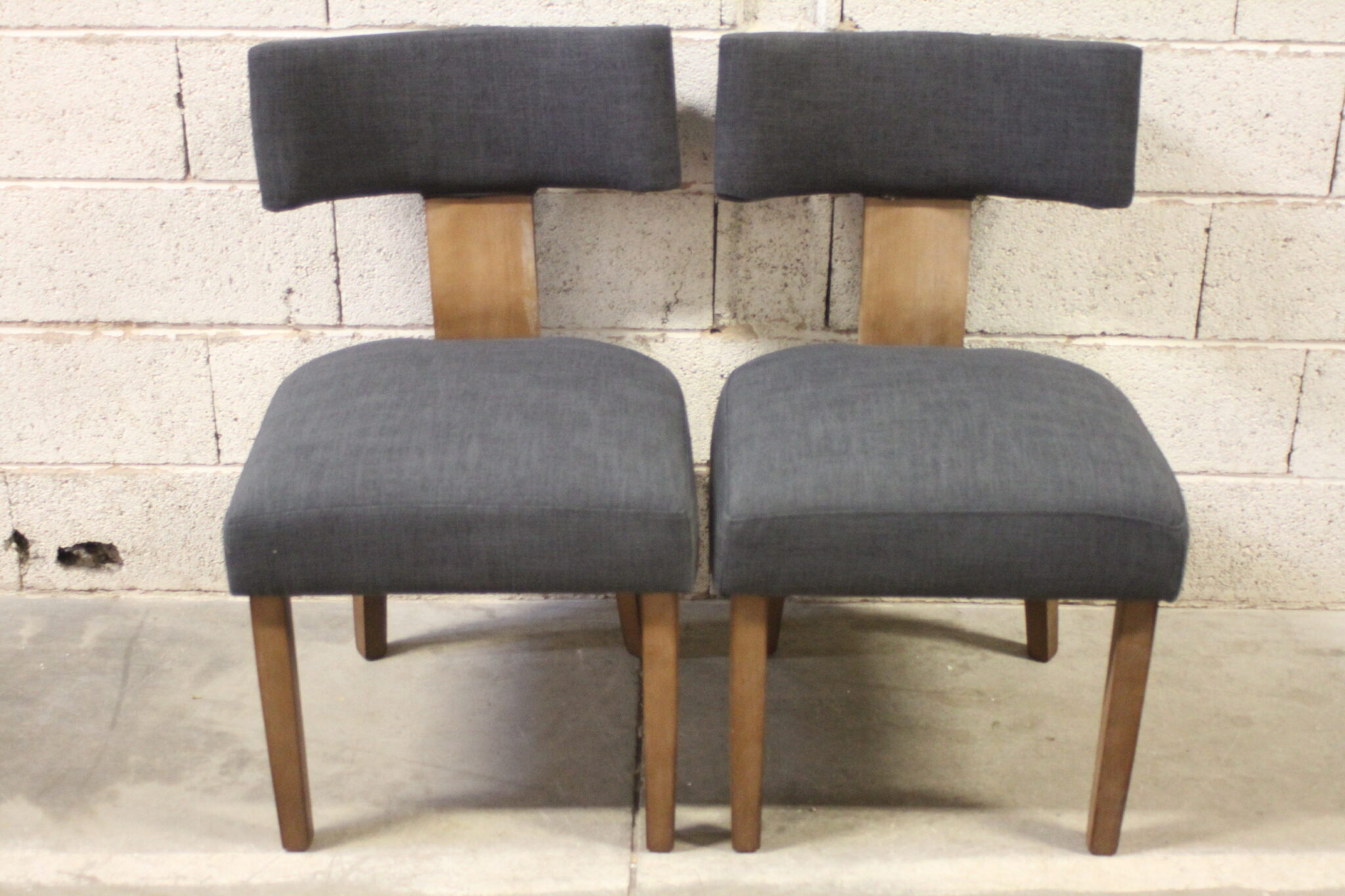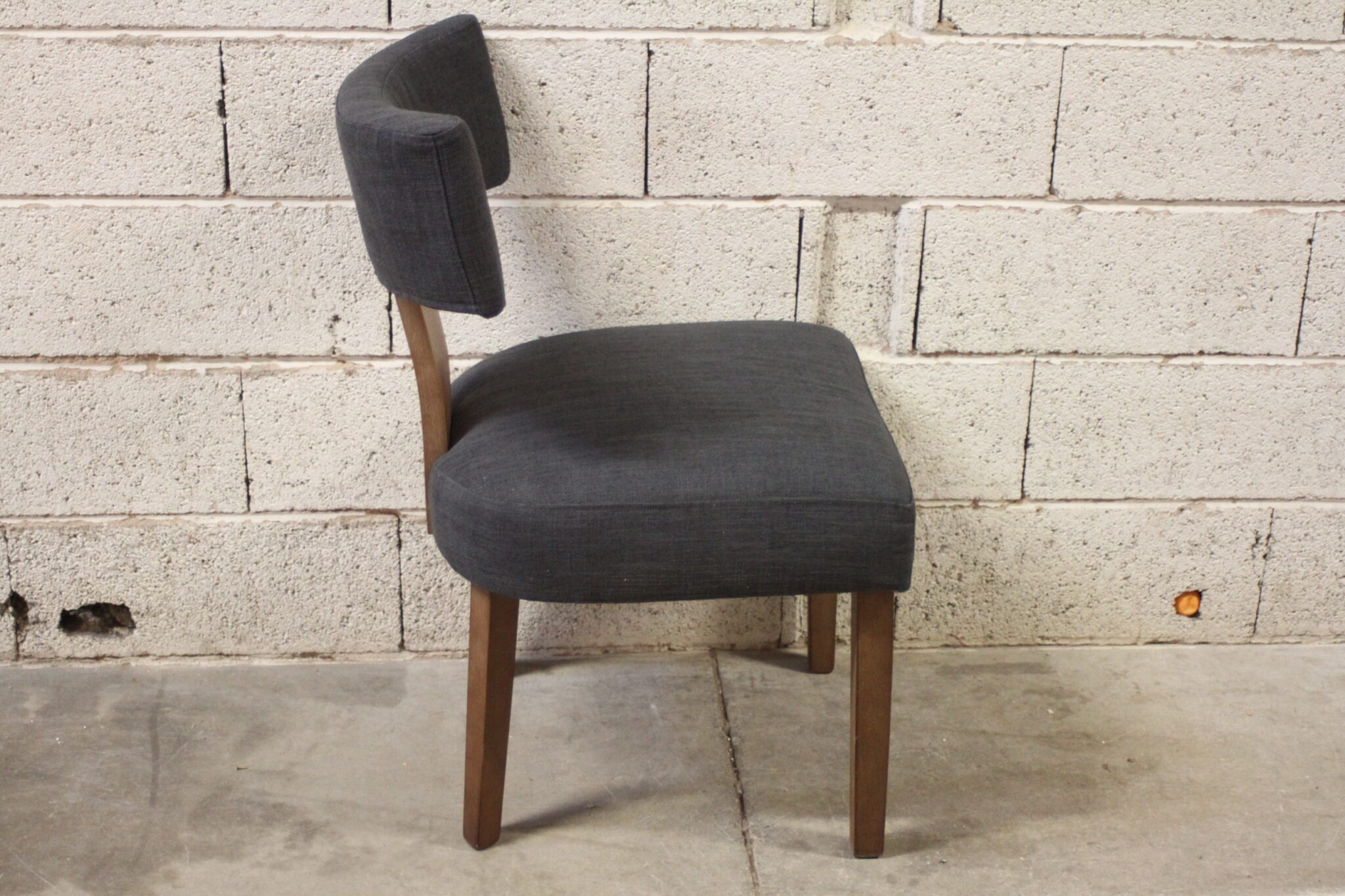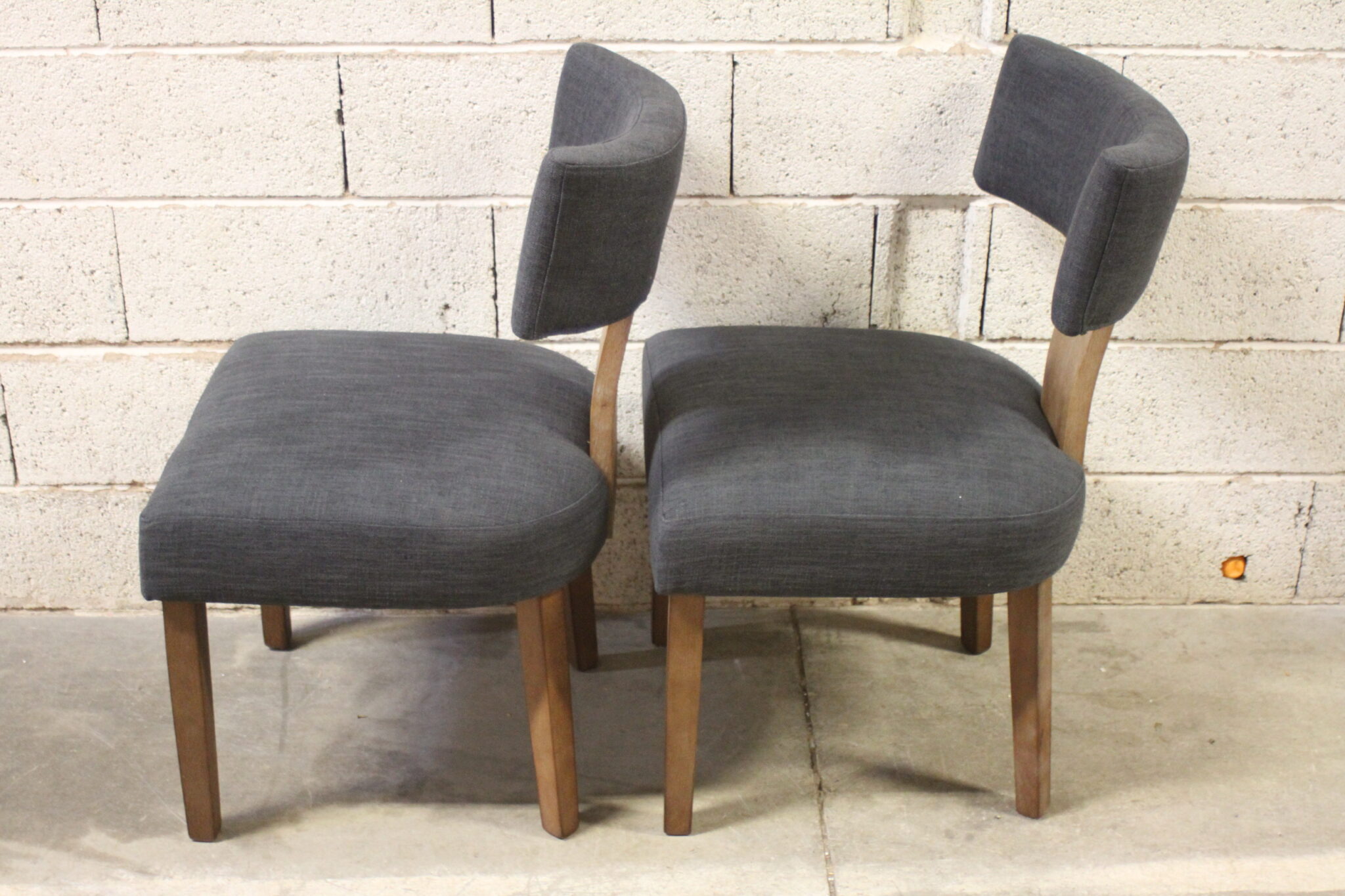 Chaises design au dossier arrondi avec assise mousse et revêtement en tissu gris.