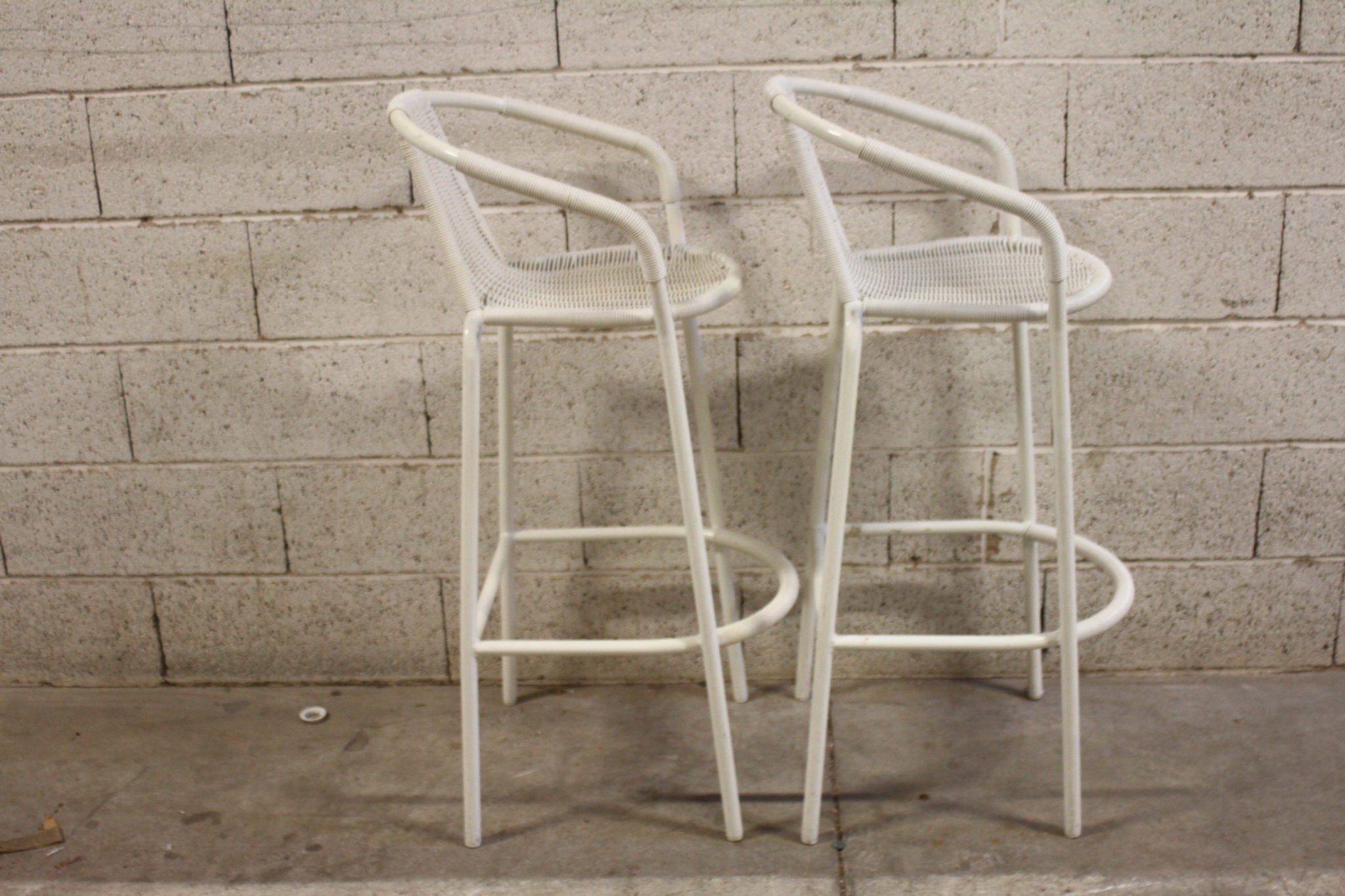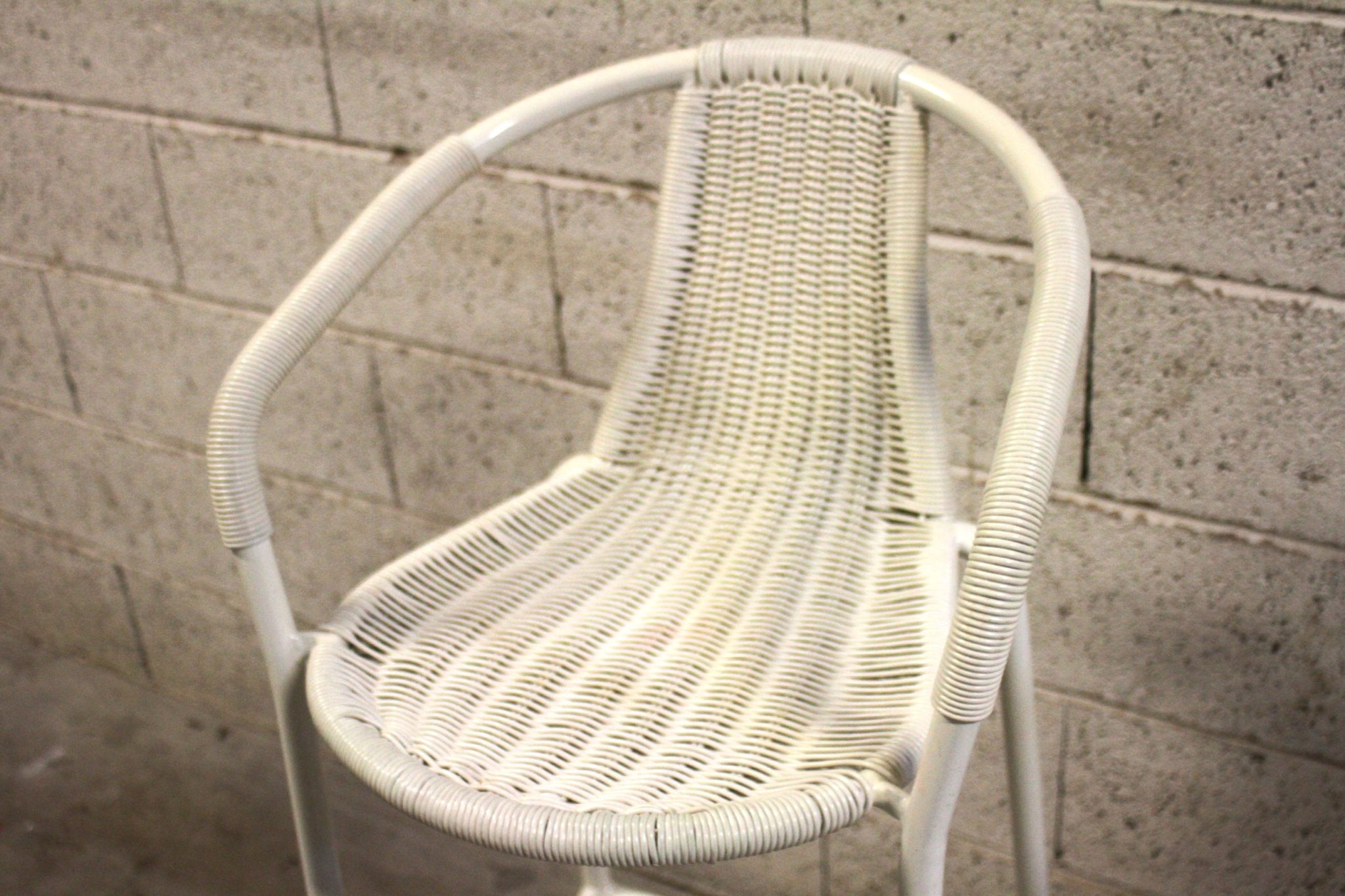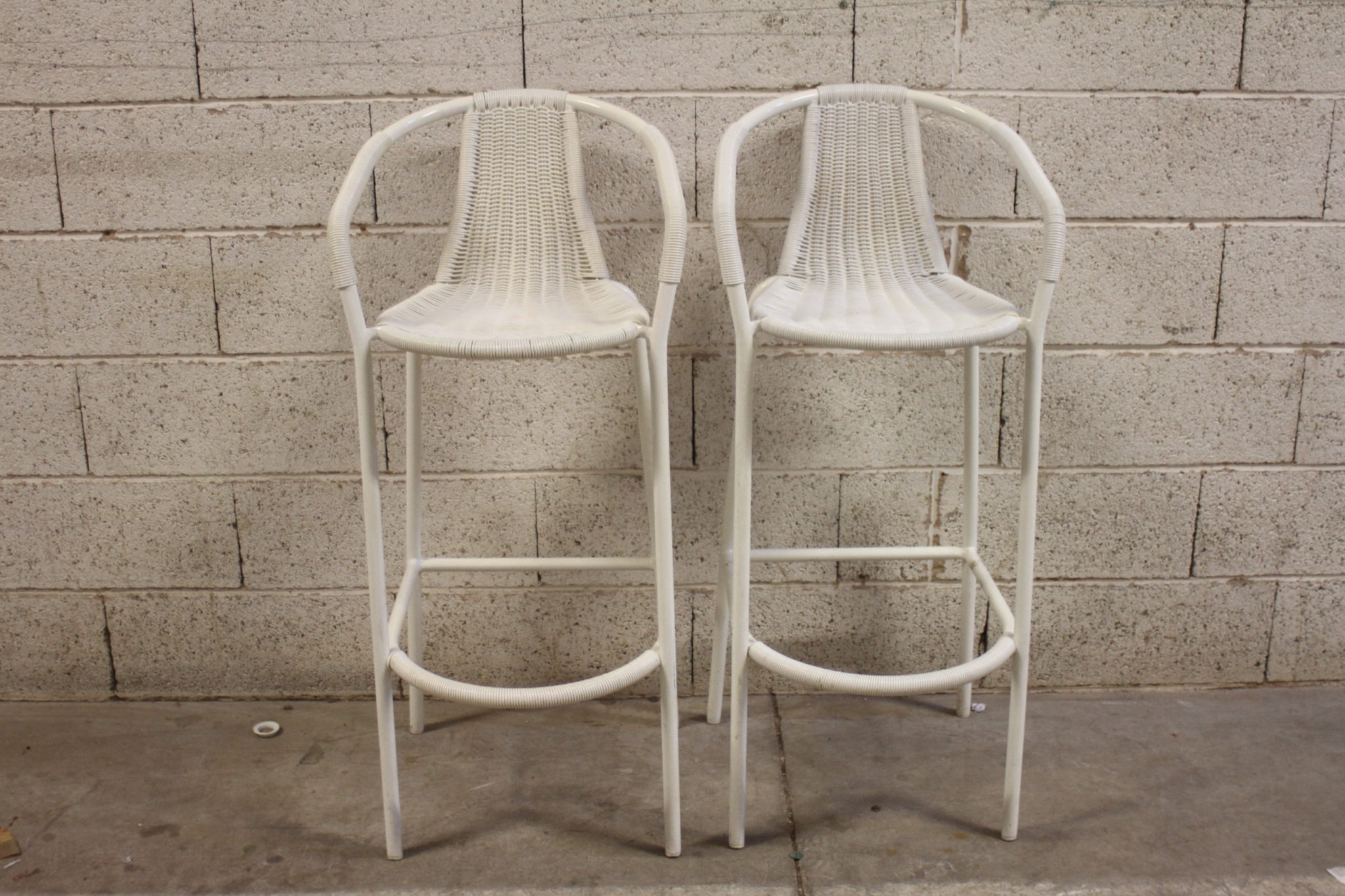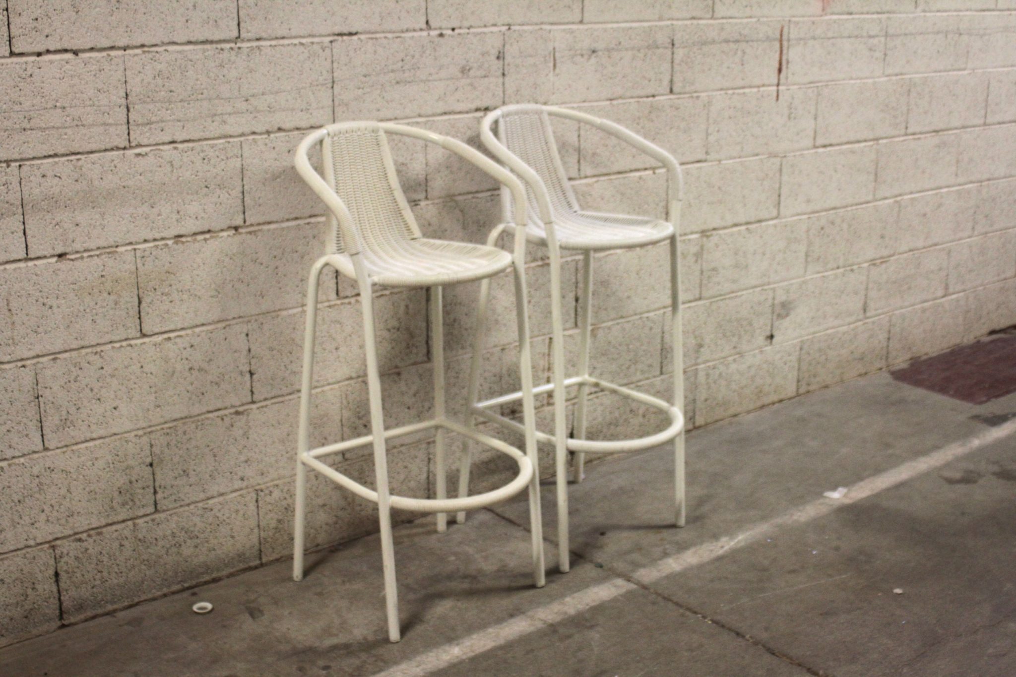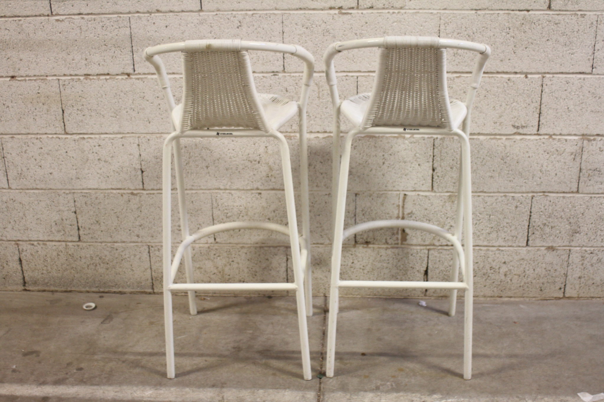 Paire de chaises hautes de bar blanches en métal et scoubidou.