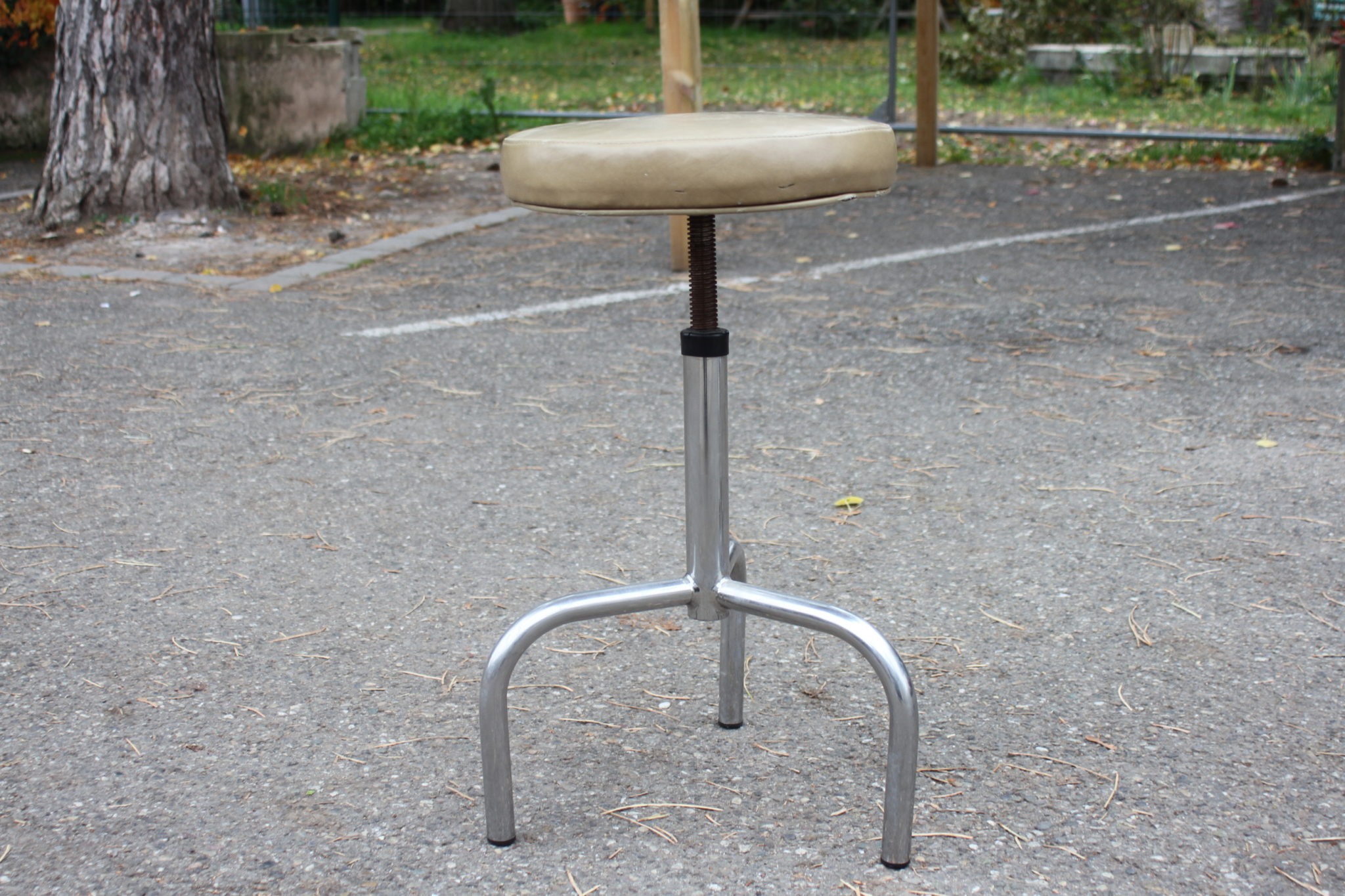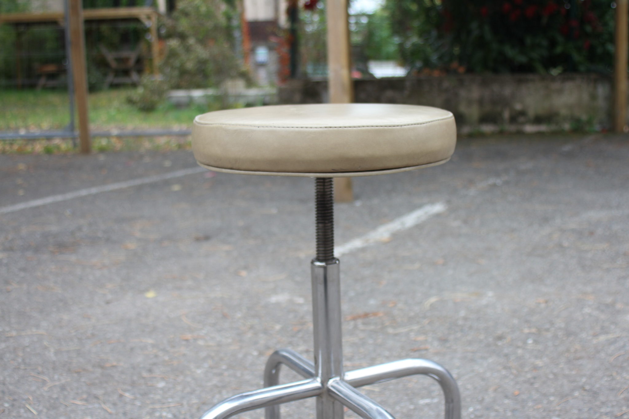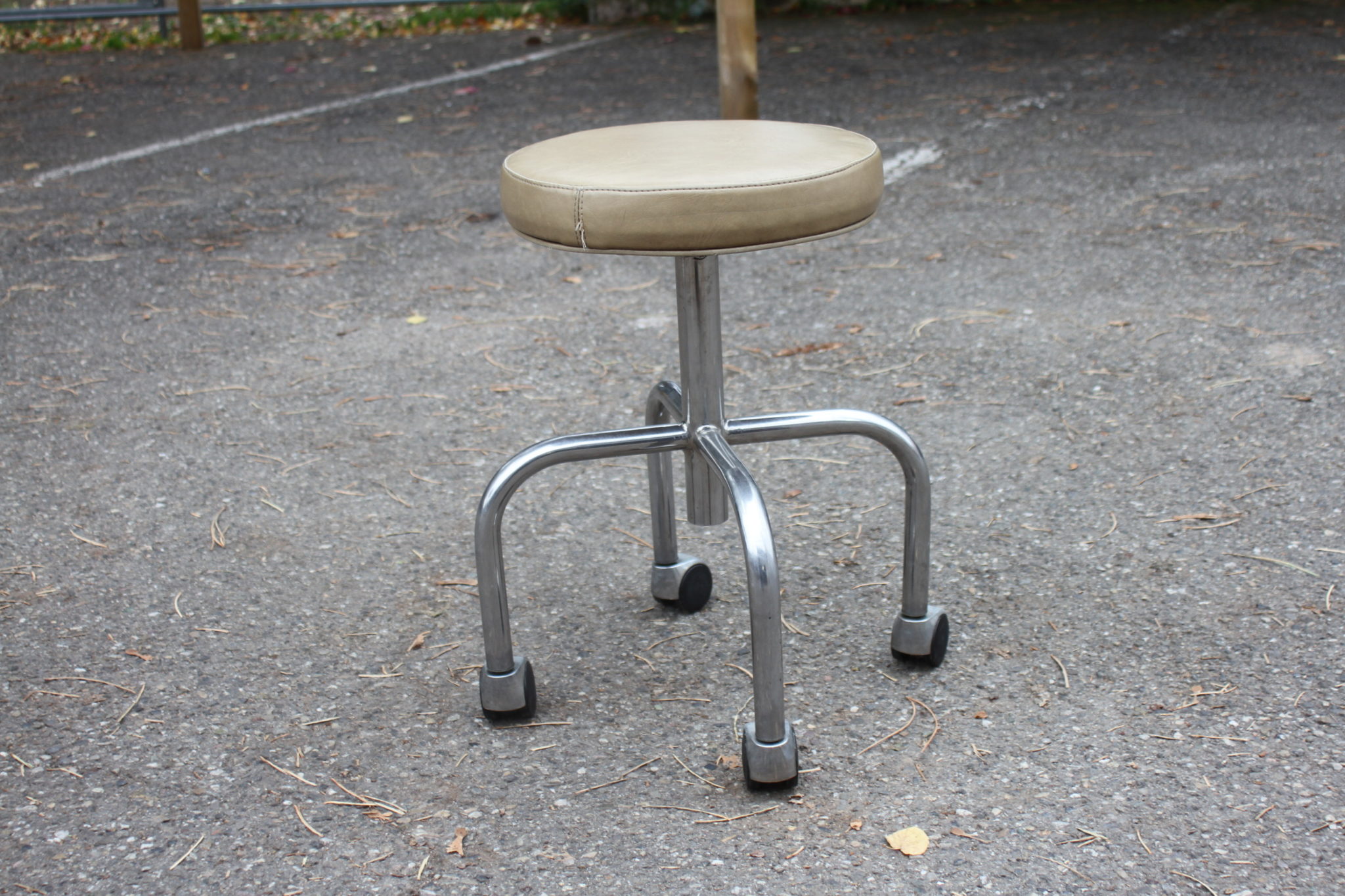 1 tabouret tripode et 1 tabouret sur roulettes.