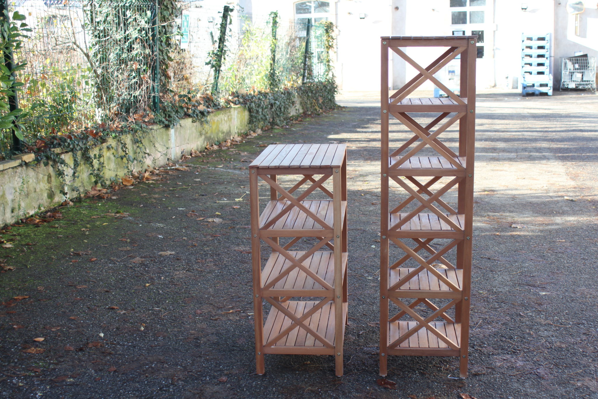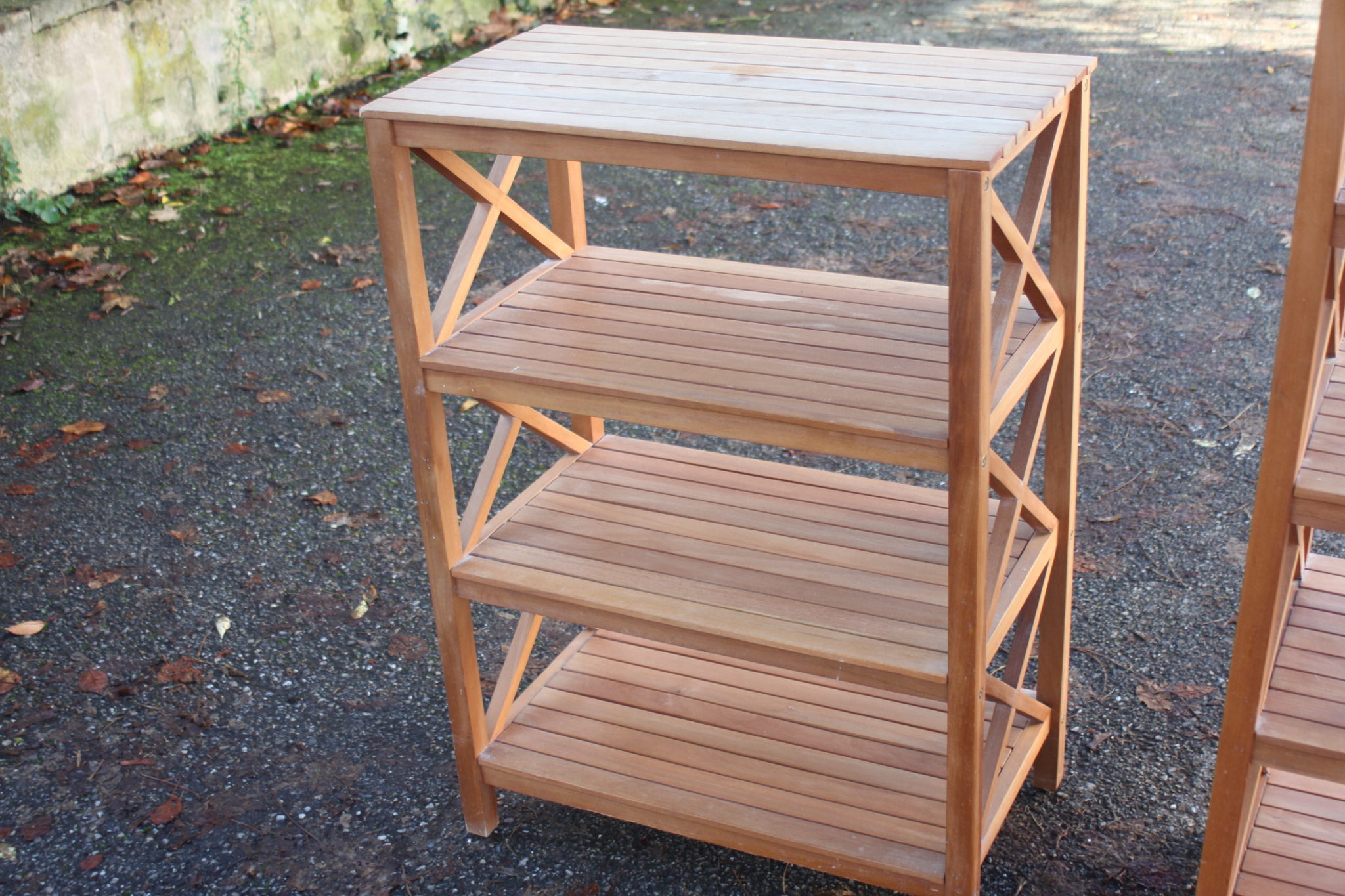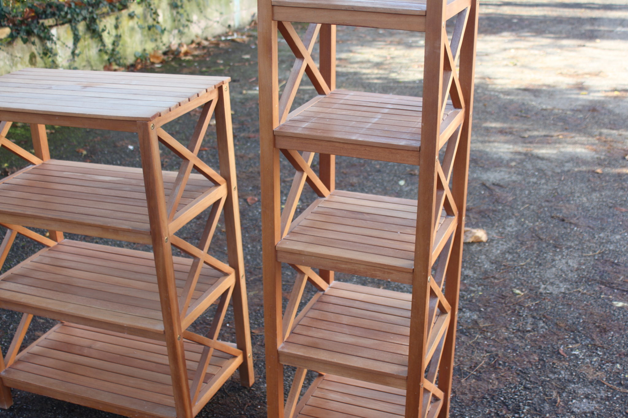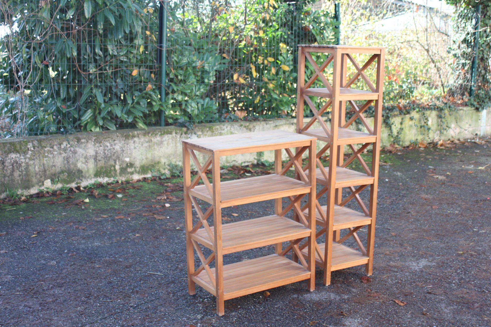 Paire d’étagères en bois de teck avec côtés en croisillons.