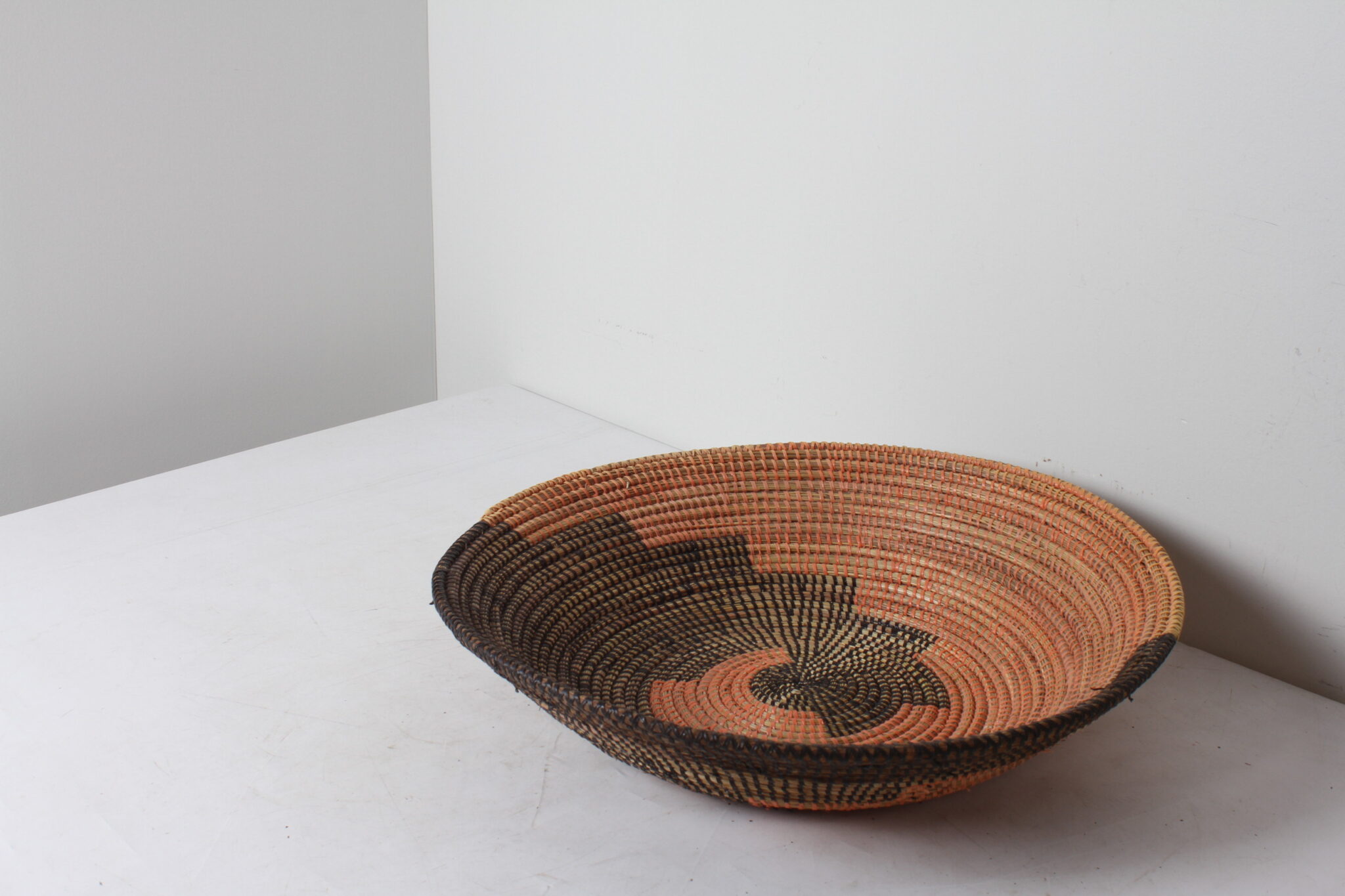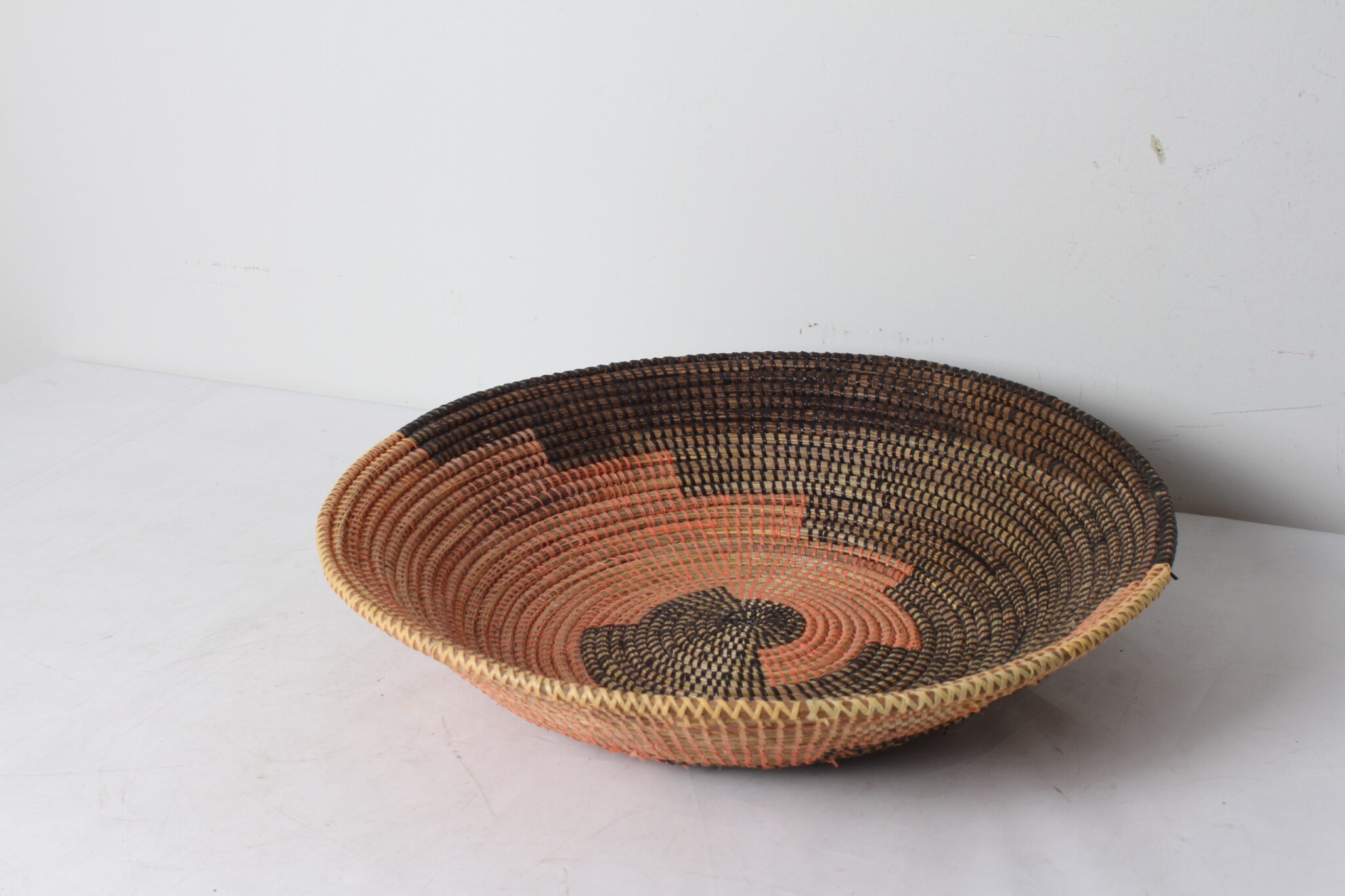 Panier africain, grande corbeille en osier naturel et plastique orange et noir.