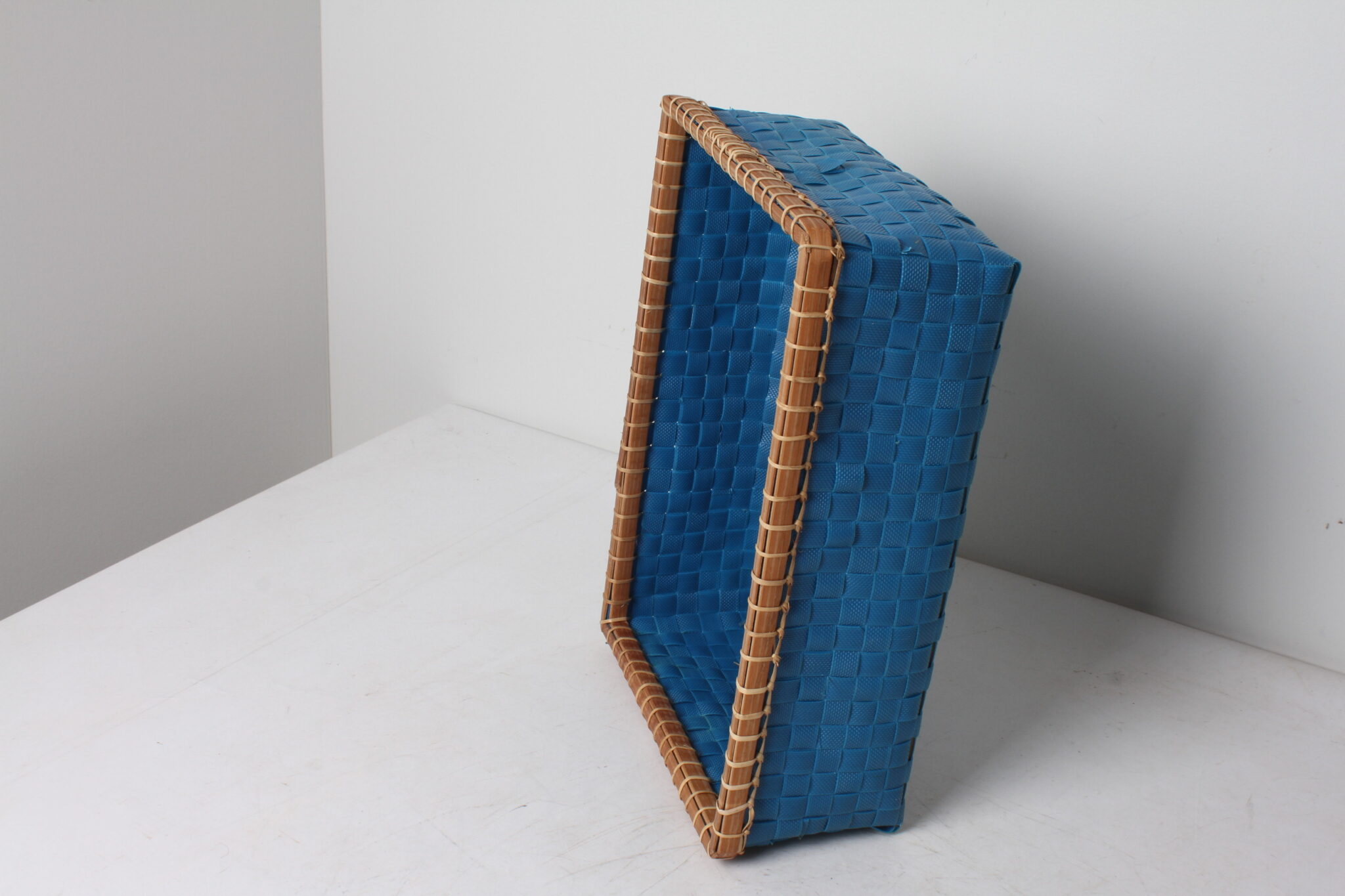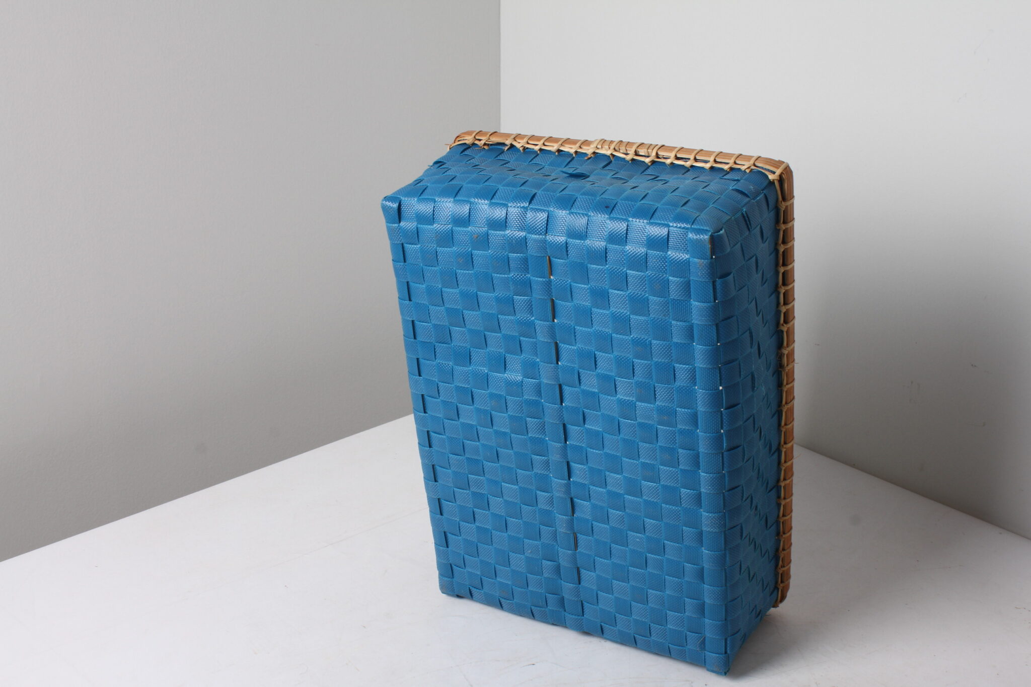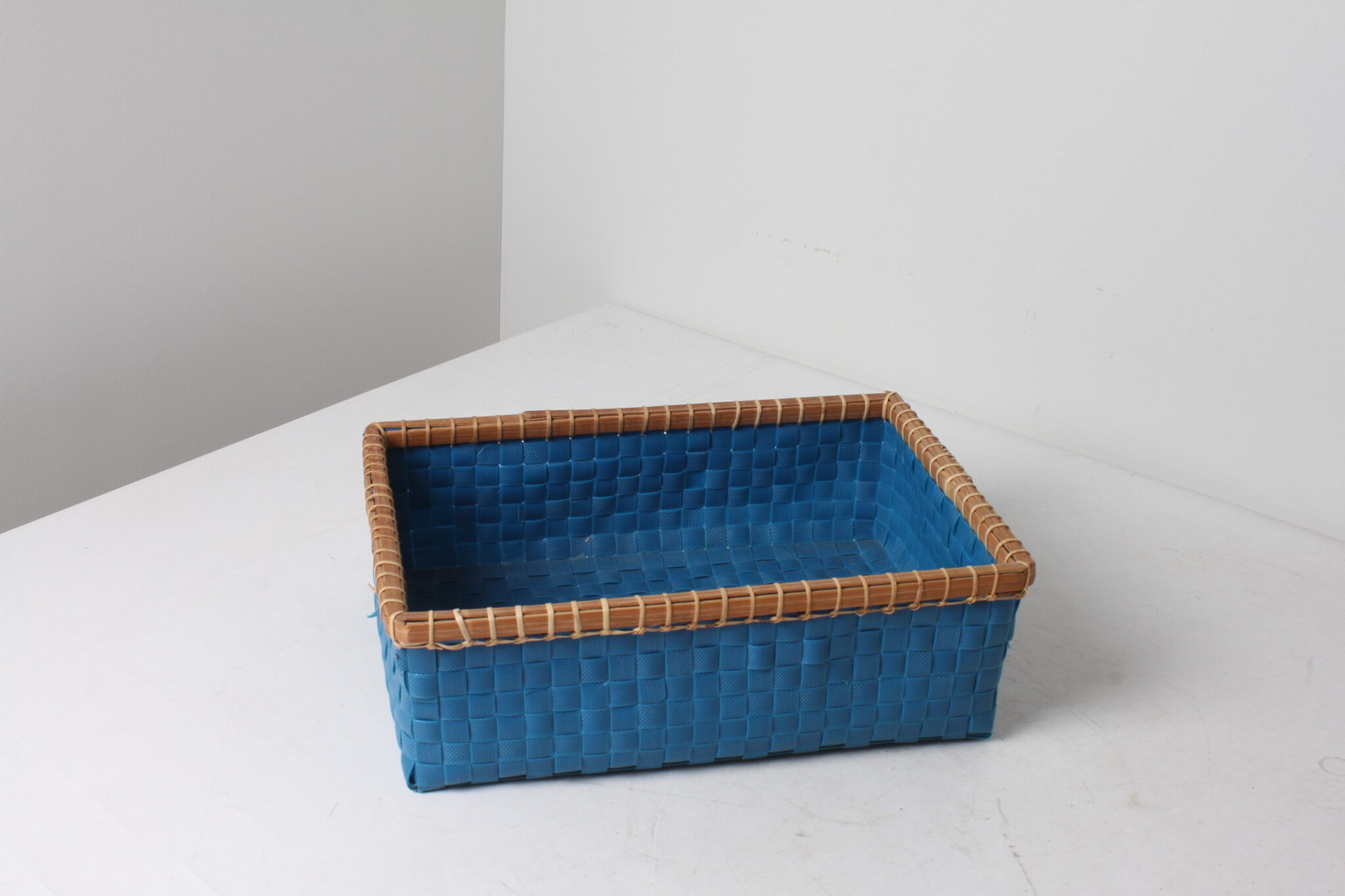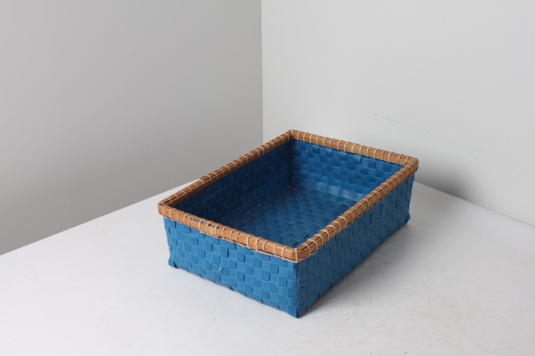Petit panier de rangement vintage en plastique tressé bleu.