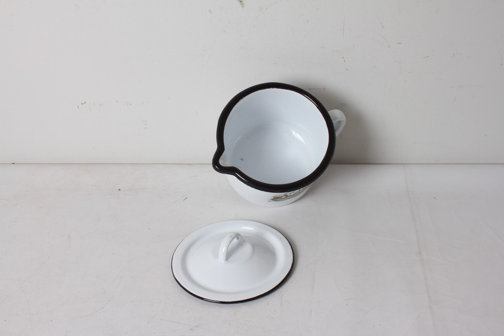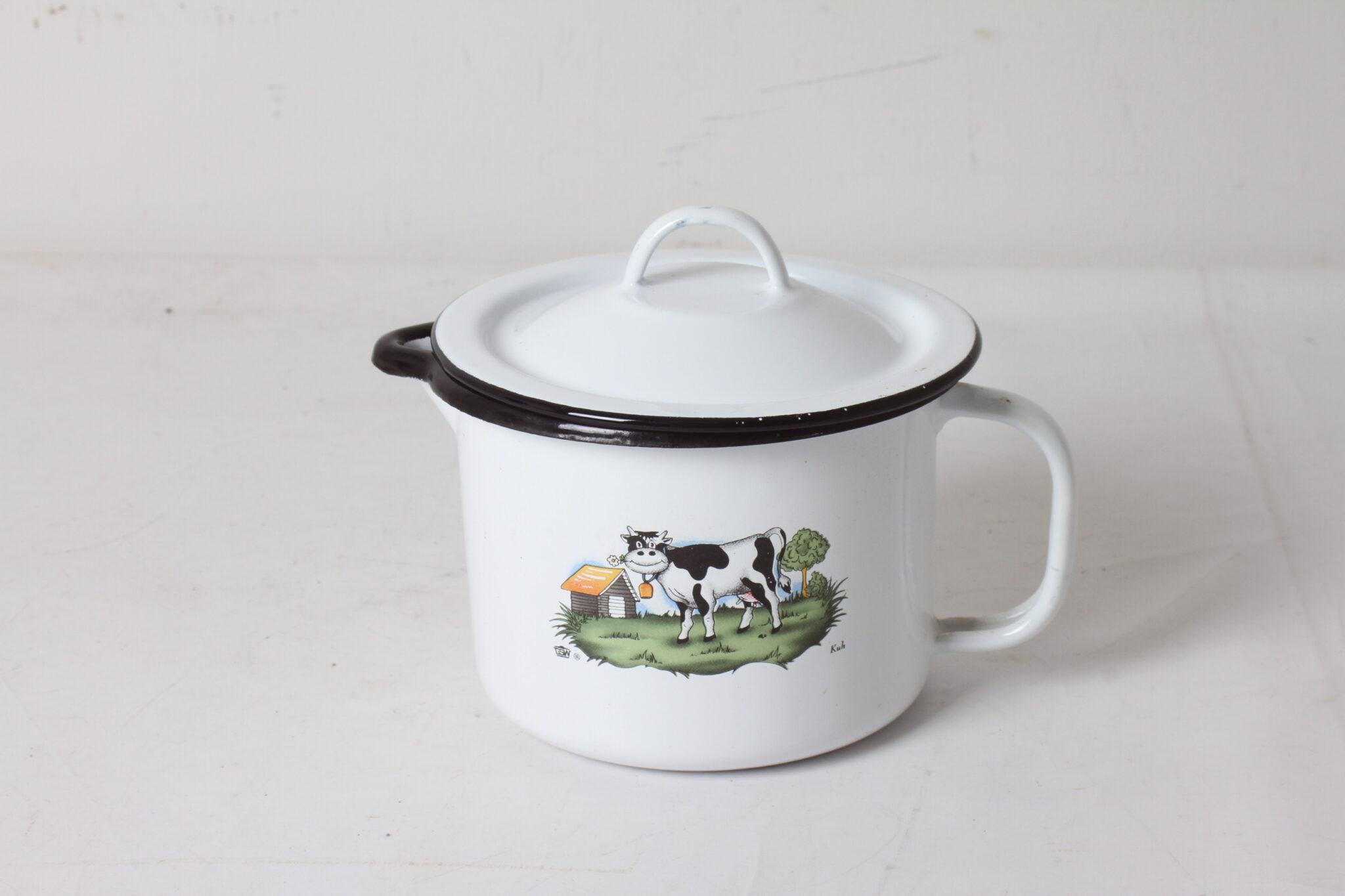 Petit pichet avec couvercle en métal émaillé, décor vache.