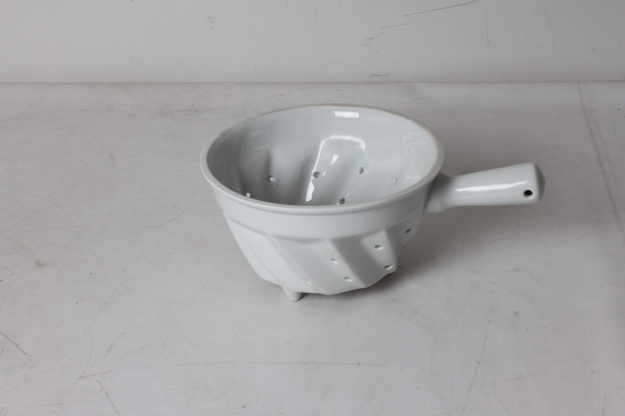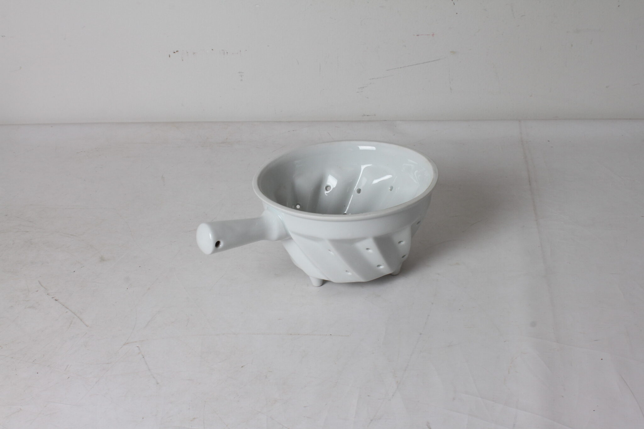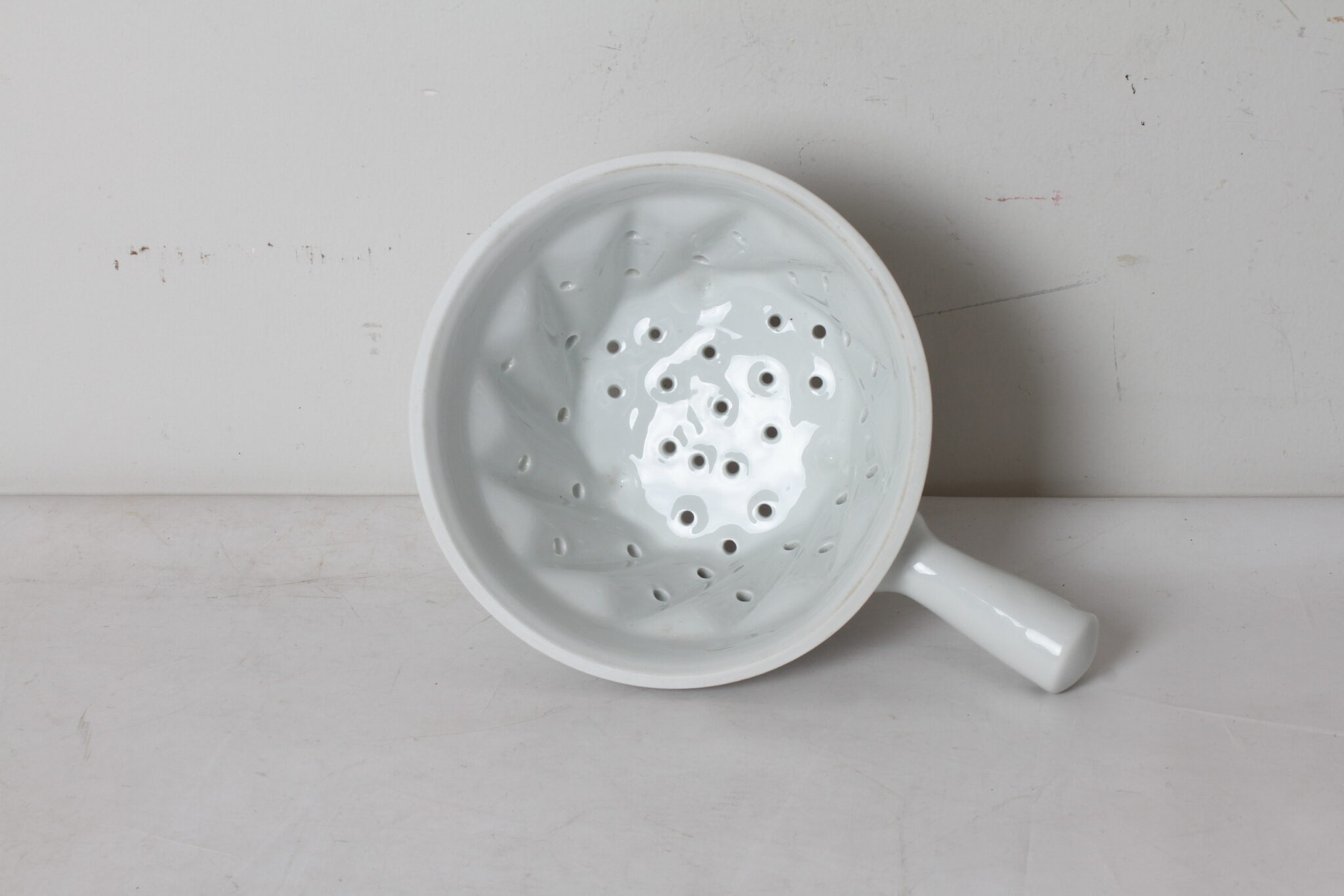 Petite passoire en porcelaine blanche.