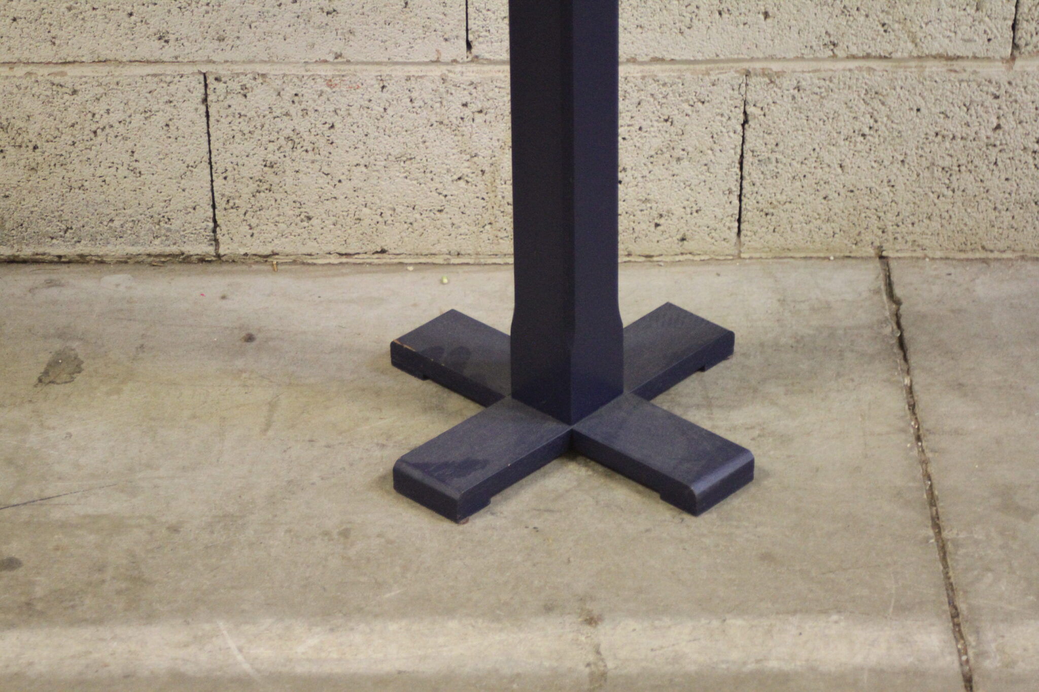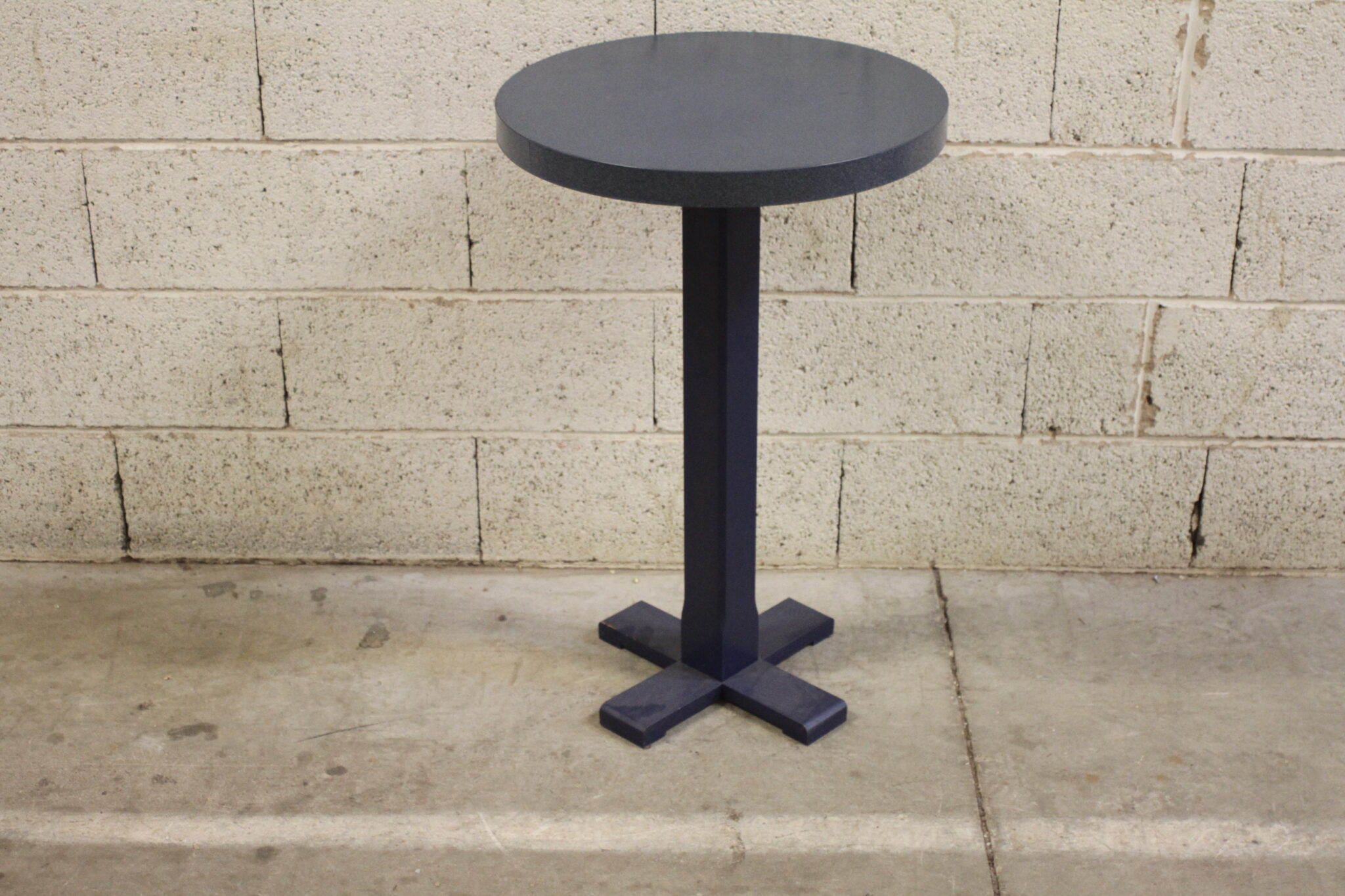 Petite table ronde en bois de couleur bleue.
